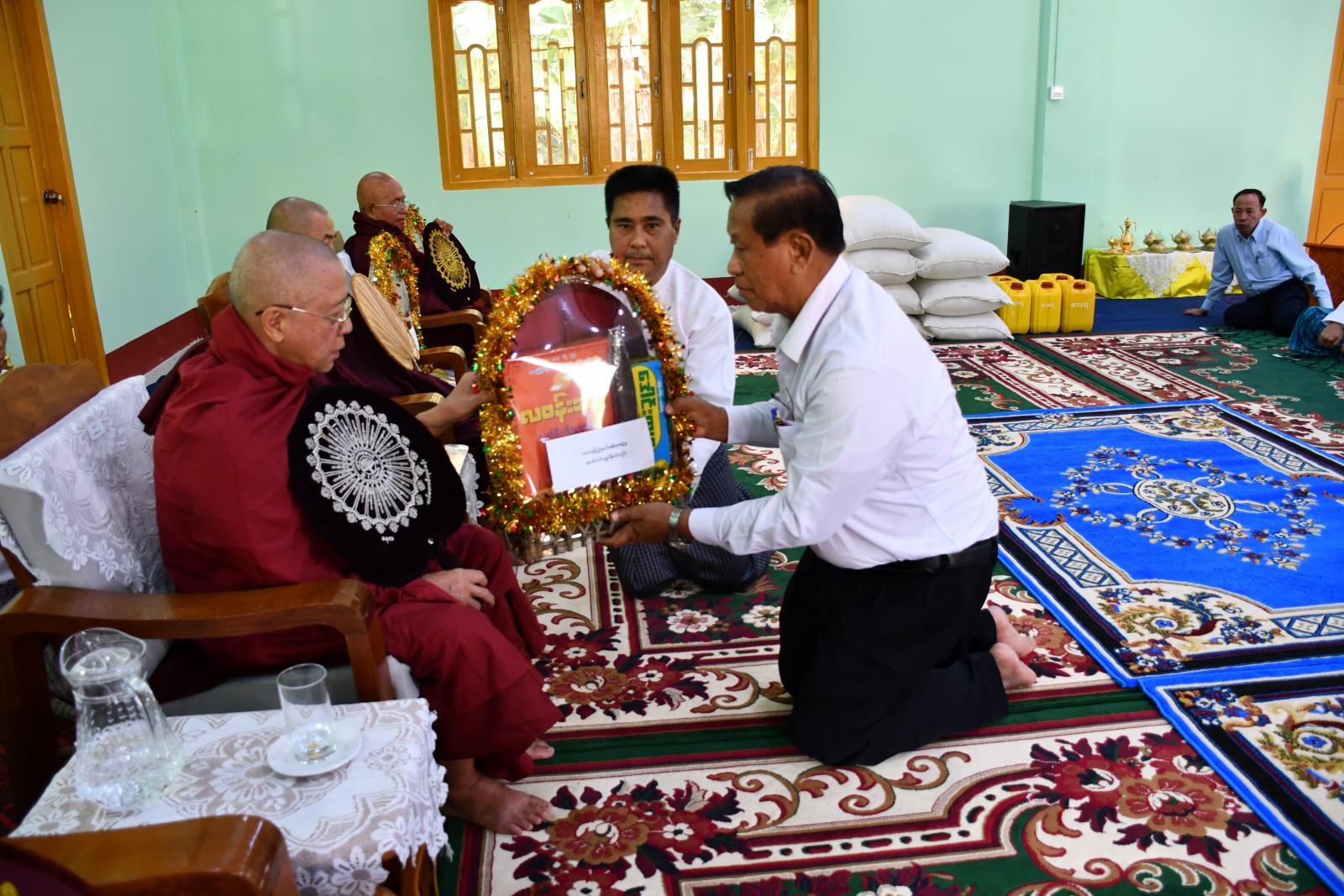 ထို့နောက် ကျောင်းထိုင်ဘုန်းကြီးသင်တန်းကျောင်းသို့ရောက်ရှိပြီး ဘုန်းတော်ကြီးကျောင်းများသို့ ဆွမ်းဆန်တော်နှင့် လှူဖွယ်ပစ္စည်းများ ဆက်ကပ်လှူဒါန်းခြင်းအခမ်းအနားကို နမောတဿသုံးကြိမ်ရွတ်ဆို ဘုရားကန်တော့၍ ဖွင့်လှစ်ခဲ့ပြီး ပြည်နယ်သံဃနာယကအဖွဲ့ဥက္ကဋ္ဌ၊ ကျောင်းထိုင်ဘုန်းကြီးသင်တန်းကျောင်းဆရာတော် အဂ္ဂမဟာဂန္ထဝါစကပဏ္ဍိတ၊ အဂ္ဂမဟာသဒ္ဓမ္မဇောတိကဓဇ ဘဒ္ဒန္တပညာစက္ကထံမှ ငါးပါးသီလခံယူဆောက်တည်ကြသည်။ ထို့နောက် နိုင်ငံတော်စီမံအုပ်ချုပ်ရေးကောင်စီအဖွဲ့ဝင်နှင့် ပြည်နယ်ဝန်ကြီးချုပ်တို့က သာသနာတော်ဆိုင်ရာများ လျှောက်ထားခဲ့ကြပြီး ကြွရောက်တော်မူသည့် ဆရာတော်၊ သံဃာတော်များအား ဆွမ်းဆန်တော်၊ လှူဖွယ်ဝတ္ထုပစ္စည်းများနှင့် နဝကမ္မအလှူတော်ငွေများ ဆက်ကပ်လှူဒါန်းခဲ့ကာ လှူဒါန်းမှုအစုစုတို့အတွက် ရေစက်သွန်းချအမျှပေးဝေခဲ့ကြသည်။