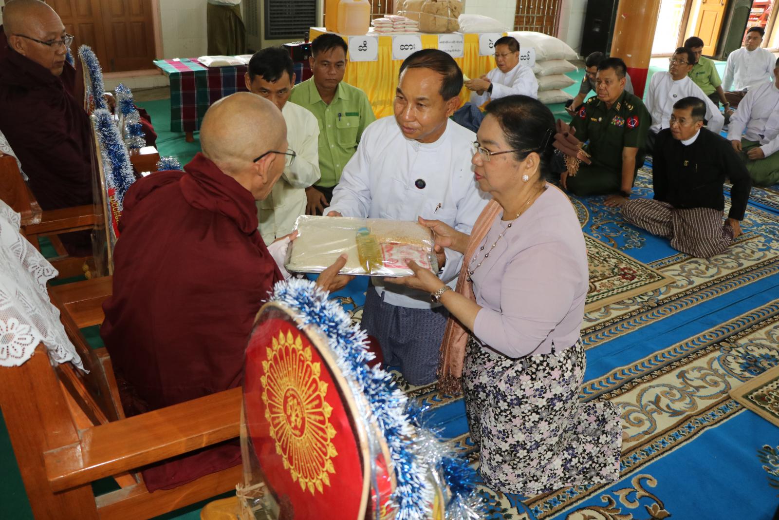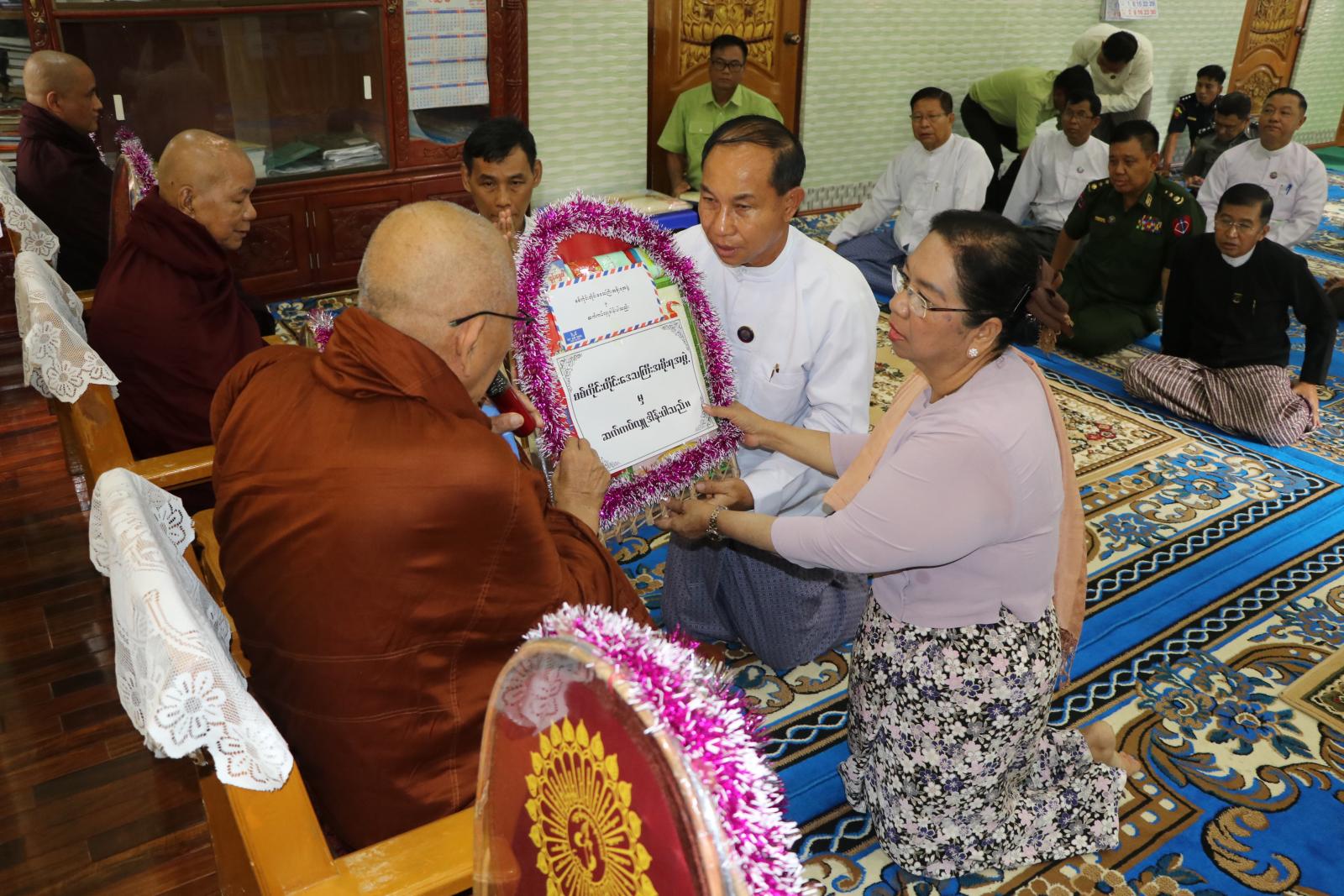 ယင်းနောက် သက်တော်ရှည် ဆရာတော်ကြီးနှင့် ပင့်သံဃာဆရာတော်ကြီးများထံ တိုင်းဒေသကြီးဝန်ကြီးချုပ်နှင့်ဇနီး၊ တိုင်းဒေသကြီး တရားသူကြီးချုပ်နှင့်ဇနီး၊ တိုင်းဒေသကြီးအစိုးရအဖွဲ့ဝင်များနှင့်ဇနီးများက ဆွမ်းဆန်၊ ဆီ၊ ဆား၊ ပဲ၊ ဆေးနှင့် လှူဖွယ်ဝထ္တုပစ္စည်းများ ဆက်ကပ်လှူဒါန်းခဲ့ကြပြီး တိုင်းဒေသကြီးဝန်ကြီးချုပ်က သာသနာရေးဆိုင်ရာများ လျှောက်ထားခဲ့ကြသည်။