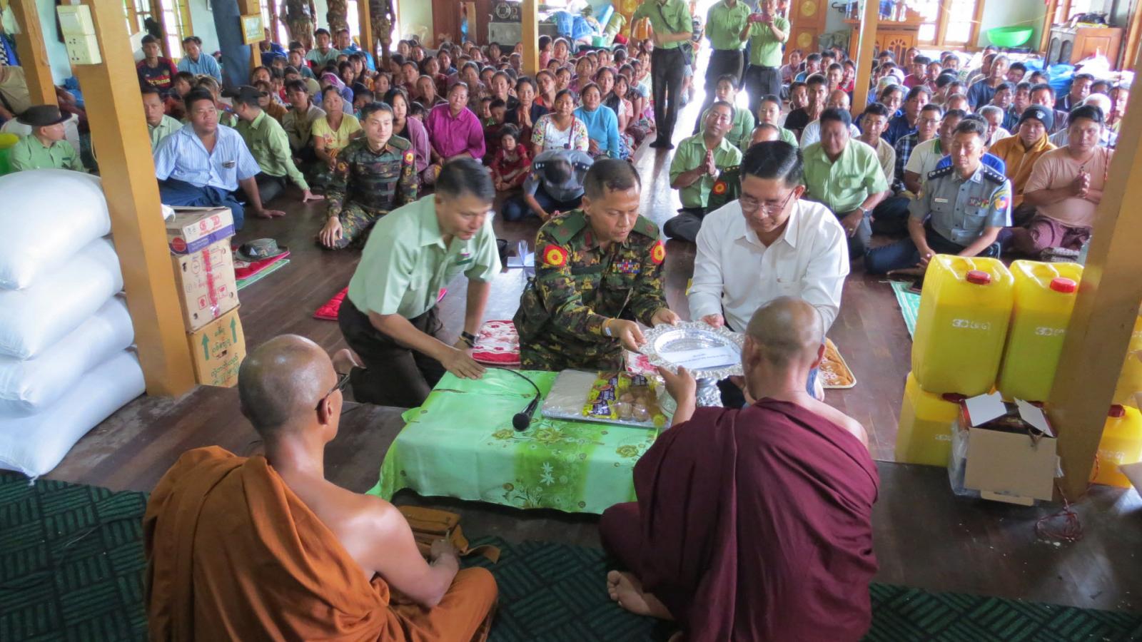 ထို့နောက် ပြည်နယ်ဝန်ကြီးချုပ်နှင့် တာဝန်ရှိသူများသည် အကြမ်းဖက်သမားများ၏ အကြမ်းဖက်လုပ်ရပ်များကြောင့် ယာယီနေရပ်စွန့်ခွာ၍ အဆိုပါဘုန်းတော်ကြီးကျောင်းတွင် ရောက်ရှိနေထိုင်လျက်ရှိသော ရှမ်းပြည်နယ် လွယ်ပေါ၊ ဆင်ဖြူ၊ တောင်ပို့ကြီး၊ ညောင်မွန်း၊ ရွှေစမ်း၊ ငါးမူး၊ စံကားကုန်းသာ၊ နောင်လိုင်၊ ကန်ဦး၊ ကုန်းဆွတ်၊ နန်းဆွတ် စသည့်ကျေးရွာများမှ ပြည်သူများအား ရင်းရင်းနှီးနှီးတွေ့ဆုံအားပေးစကားပြောကြားပြီး ပြည်သူများက အခက်အခဲများနှင့် ဖြည့်ဆည်းပေးရန်ကိစ္စရပ်များအား အသီးသီးတင်ပြကြသည်။ ပြည်နယ်ဝန်ကြီးချုပ်က နေထိုင်နေစဉ်ကာလအတွင်း ကျန်းမာရေးစောင့်ရှောက်မှုများပေးရေး၊ ကျောင်းနေအရွယ်ကလေးငယ်များ နီးစပ်ရာ ကျောင်းများတွင် တက်ရောက်ပညာသင်ကြားနိုင်ရေး၊ နေထိုင်စားသောက်မှုများ အဆင်ပြေစေတာဝန်ရှိသူများအား မှာကြားပြီး လိုအပ်သည်များ ပေါင်းစပ်ညှိနှိုင်းပေးခဲ့သည်။ ထို့နောက် ပြည်နယ်ဝန်ကြီးချုပ်နှင့် တာဝန်ရှိသူများက ယာယီနေရပ်စွန့်ခွာ ပြည်သူများသို့ ဆန်၊ ဆီ၊ ကြက်ဥနှင့် ခေါက်ဆွဲခြောက်များ ပေးအပ်ခဲ့ကြသည်။