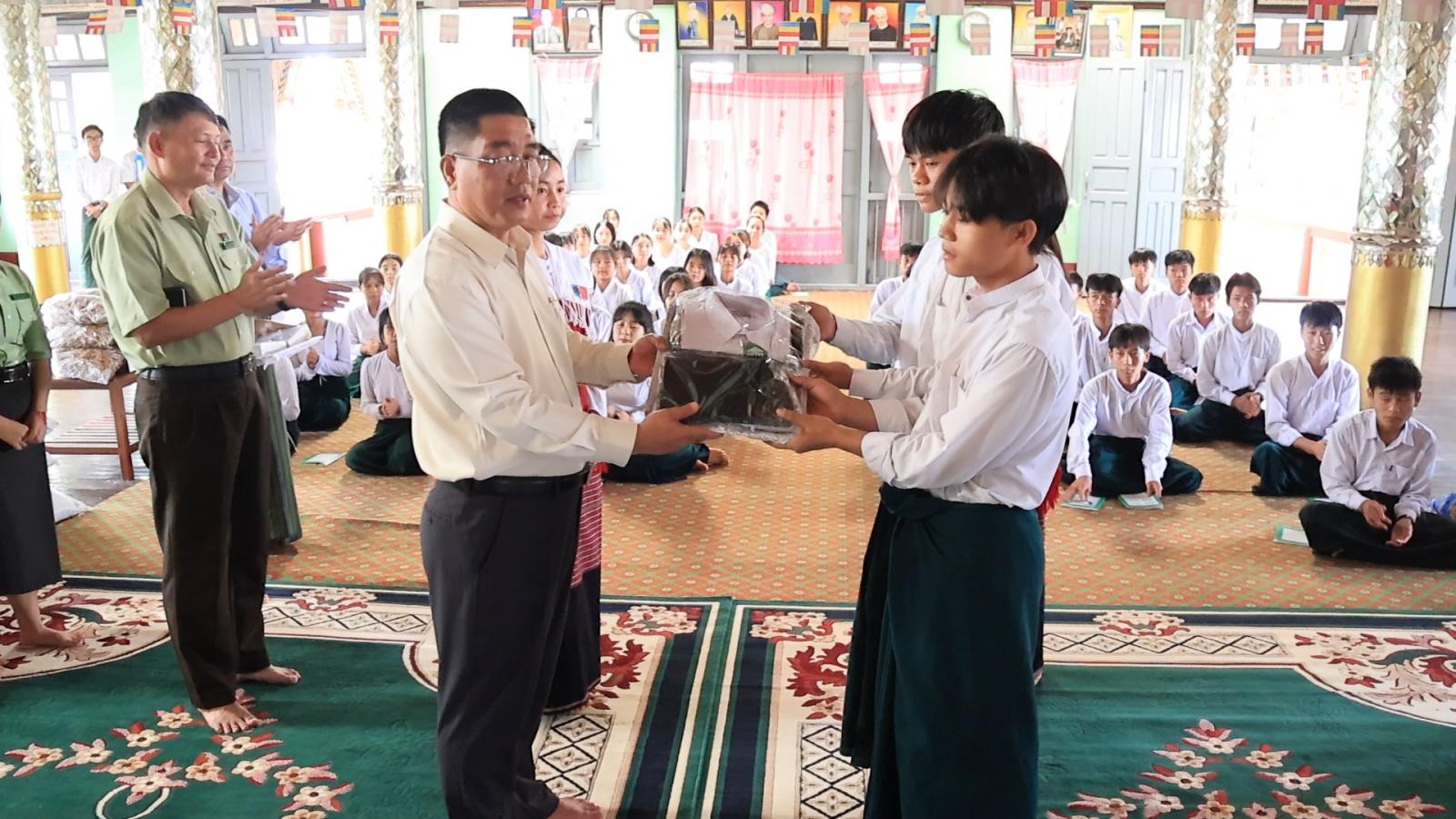 ထို့နောက် ပြည်နယ်ဝန်ကြီးချုပ်နှင့်တာဝန်ရှိသူများသည် မွန်းလွဲပိုင်းတွင် လွိုင်ကော်မြို့၊ ရှမ်းစုရပ်ကွက်၊ ရွှေကျောင်းပရိယတ္တိစာသင်တိုက်သို့ရောက်ရှိပြီး ကျောင်းထိုင်ဆရာတော်အား ဖူးမြော်ကြည်ညို၍ လှူဖွယ်ပစ္စည်းများနှင့် နဝကမ္မအလှူတော်ငွေများ ဆက်ကပ်လှူဒါန်းကာ ဖယ်ခုံမြို့နယ်မှ ယာယီနေရပ်စွန့်ခွာပြီး လွိုင်ကော်မြို့၊ အမှတ်(၁)အခြေခံပညာအထက်တန်းကျောင်းတွင် တက်ရောက်ပညာသင်ကြားနေသော ကျောင်းသူ၊ ကျောင်းသားများအား ရင်းရင်းနှီးနှီးတွေ့ဆုံအားပေးကာ အမှာစကားပြောကြားသည်။ ထို့နောက် ကျောင်းသား၊ ကျောင်းသူများနှင့် ဆရာမများ နေထိုင်စားသောက်မှု အဆင်ပြေစေရန်အတွက် ဆန်၊ ဆီ၊ ငါးခြောက်နှင့် ကျောင်းသုံးစာရေးကိရိယာများ၊ ကျောင်းဝတ်စုံများကို ပေးအပ်ခဲ့ကြောင်း သိရှိရသည်။