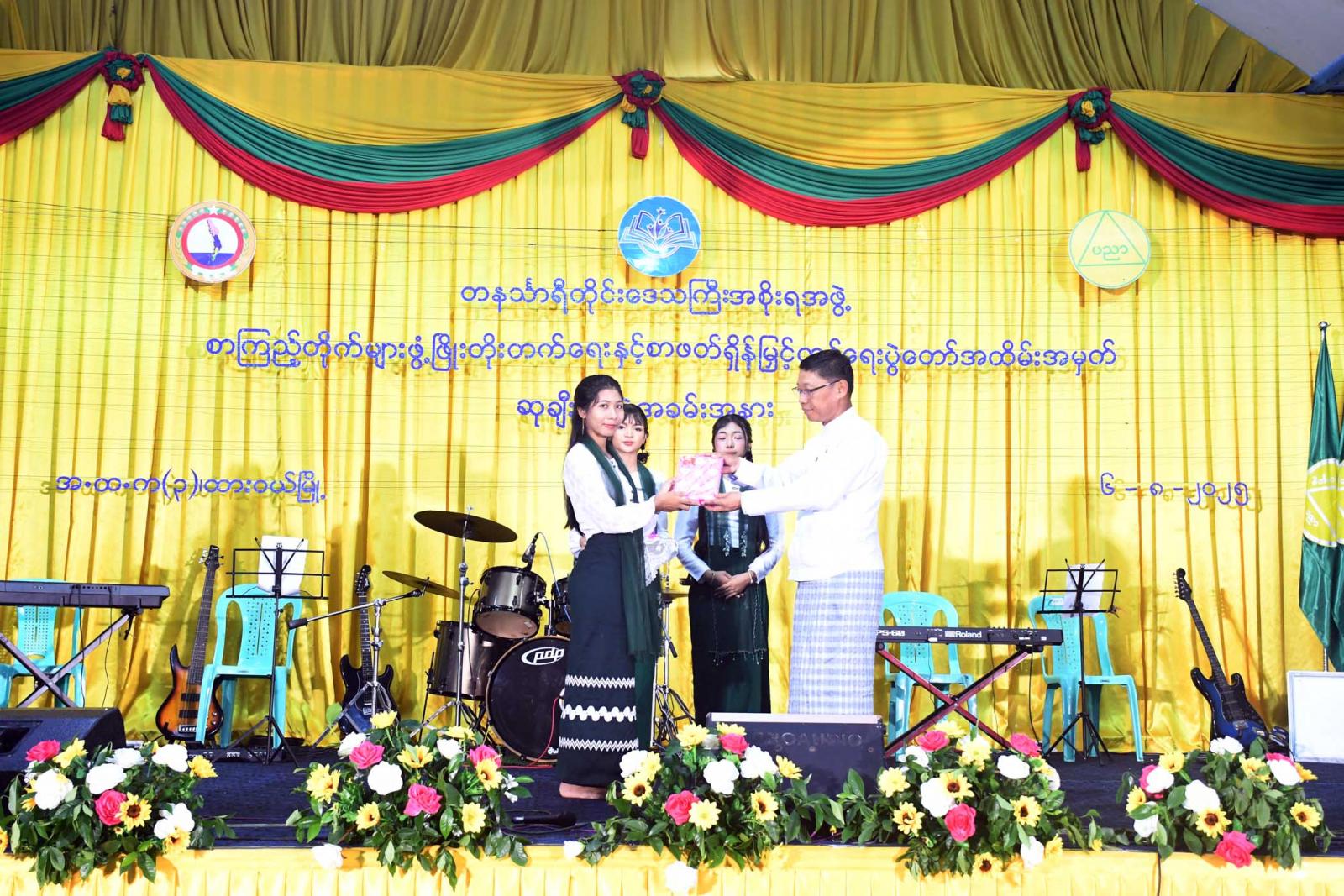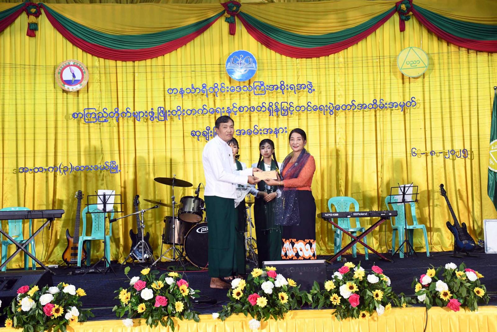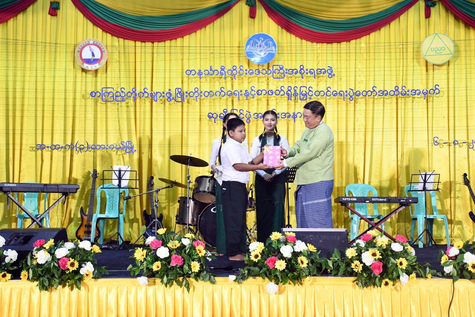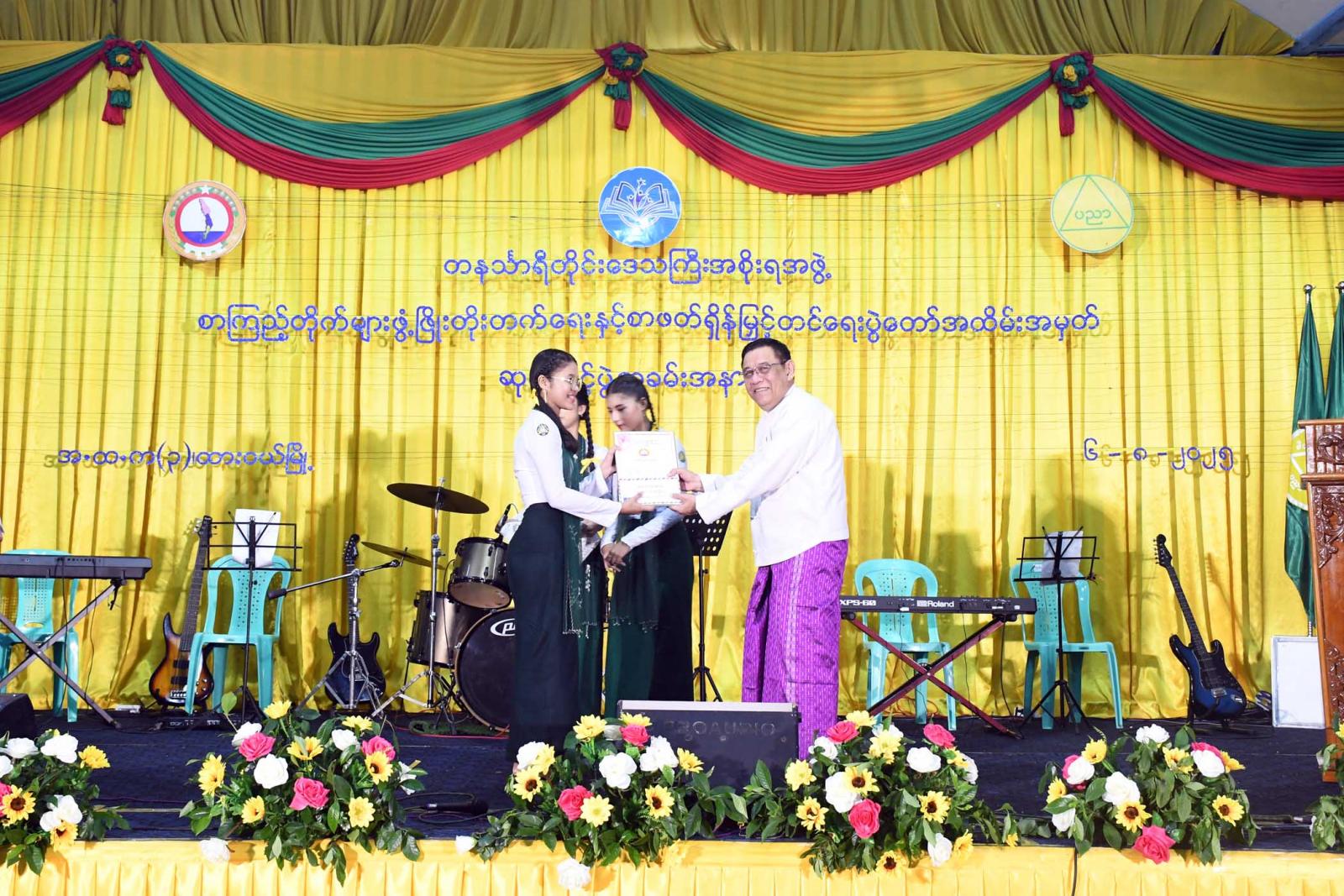 ထို့နောက် တိုင်းဒေသကြီးဝန်ကြီးချုပ်က စာပေဟောပြောပေး ကြသော စာရေးဆရာမနုနှင်းသစ်နှင့် စာရေးဆရာ အန်ကယ်ပညာတို့အား ဂုဏ်ပြုဆုချီးမြှင့်ပြီး ကျပန်းစကားပြော ပြိုင်ပွဲ(အထက်တန်း)အဆင့်တွင် ဆုရရှိသောကျောင်းသား/ကျောင်းသူ (၅)ဦးအား ဆုချီးမြှင့်သည်။ ဆက်လက်၍ တိုင်းဒေသကြီးတရားလွှတ်တော်တရားကျောင်းသူကြီးချုပ် ဒေါ်ပိုက်ပိုက်အေးက စာစီစာကုံး (အထက်တန်း) အဆင့်တွင် ဆုရရှိသော ကျောင်းသား/ကျောင်းသူငါးဦးအား ဆုချီးမြှင့်သည်။ ထို့နောက် တိုင်းဒေသကြီးလုံခြုံရေးနှင့်နယ်စပ်ရေးရာဝန်ကြီးဗိုလ်မှူးကြီးမင်းမင်းလတ်က စာဖတ်စွမ်းရည် (အလယ် တန်း) အဆင့်တွင် ဆုရရှိသောကျောင်းသား/ကျောင်းသူငါးဦးအား လည်းကောင်း၊ တိုင်းဒေသကြီးစီးပွားရေးရာဝန်ကြီးဦးမောင်ကြီးက စာစီစာကုံး(အလယ်တန်း) အဆင့်တွင် ဆုရရှိသော ကျောင်း သား/ကျောင်းသူ(၅)ဦးအားလည်းကောင်း၊ တိုင်းဒေသကြီး သယံ ဇာတရေးရာဝန်ကြီး ဦးခင်မောင်မြင့်က ပုံပြင်ပြောပြိုင်ပွဲ(မူလတန်း)အဆင့်တွင် ဆုရရှိသောကျောင်းသား/ကျောင်းသူများအား လည်းကောင်း ဆုများပေးအပ်ချီးမြှင့် သည်။