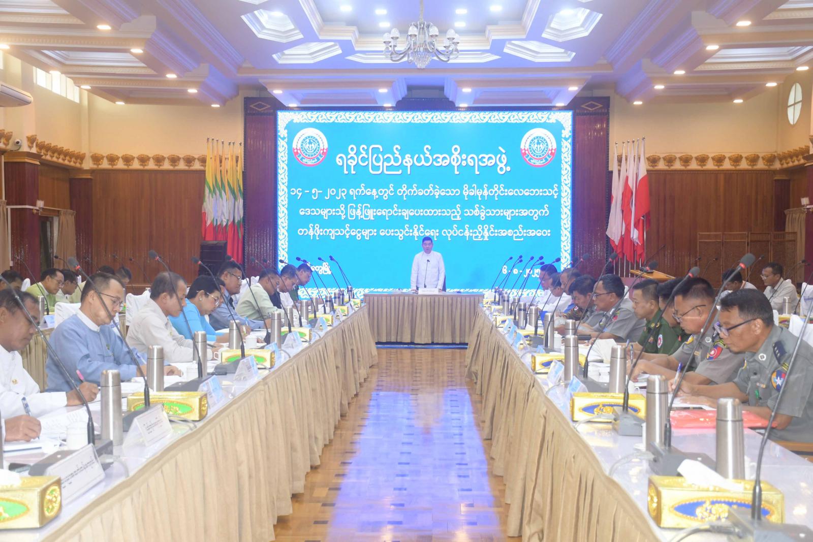 အစည်းအဝေးတွင် ပြည်နယ်ဝန်ကြီးချုပ်က ၂၀၂၃ ခုနှစ် မေ ၁၄ ရက်က တိုက်ခတ်ခဲ့သည့် မိုခါမုန်တိုင်းကြောင့် ရခိုင်ပြည်နယ်အတွင်း ပျက်စီးဆုံးရှုံးခဲ့သည့် အဆောက်အအုံများ၊ သာသနိကအဆောက်အအုံများ ပြန်လည်ထူထောင်ရေးလုပ်ငန်းများဆောင်ရွက်ရန် ရခိုင်ပြည်နယ် သဘာဝဘေး အန္တရာယ်ဆိုင်ရာစီမံခန့်ခွဲမှုအဖွဲ့၏ ခွင့်ပြုချက်များဖြင့် တပ်ရင်း၊ တပ်ဖွဲ့ ဌာနဆိုင်ရာ များအတွက် မြန်မာ့သစ်လုပ်ငန်းက တစ်ဆင့်ခွဲဝေဖြန့်ဖြူးပေးခဲ့သည့် အခြားသစ်သားများ၊ ကျွန်းတိုင်၊ သစ်မာတိုင်များနှင့် တန်ဖိုးကျသင့်ငွေများ၊ ပေးချေရန်ကျန်ရှိသည့် သစ်ခွဲသားများ အတွက် အထူးကုန်စည်ခွန်နှင့် ကုန်သွယ်လုပ်ငန်းခွန်အပါအဝင် ကျသင့်ငွေများကို မြန်မာ့ သစ်လုပ်ငန်းသို့ ပေးချေဆောင်ရွက်ရ မည်ဖြစ်ကြောင်း၊ ယင်းနှင့်ပတ်သက်၍ မိမိတို့သက်ဆိုင်ရာ တပ်ရင်းတပ်ဖွဲ့၊ ဌာနလိုက်ပေးချေ ဆောင်ရွက်မည့် အစီအစဉ်ကို တင်ပြပေးရန်ပြောကြားသည်။