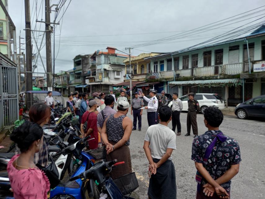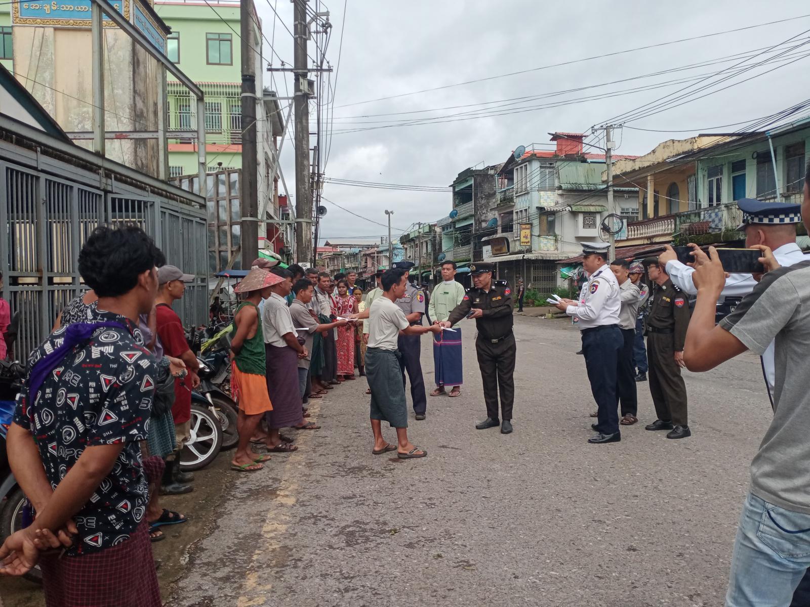 ယာဉ်အန္တရာယ်ကင်းရှင်းစေရေးနှင့် ယာဉ်တိုက်မှုများ လျော့နည်းပပျောက်စေရေးအတွက် ယာဉ်စည်းကမ်း၊ လမ်းစည်းကမ်းဆိုင်ရာ ပညာပေးစစ်ဆေးခြင်းနှင့် လက်ကမ်းစာစောင်များဖြန့်ဝေခြင်းကို ကရင်ပြည်နယ် ကော့ကရိတ်မြို့ အမှတ်(၃)ရပ်ကွက်ရှိ မြို့မဈေးကြီးရှေ့တွင် ပြုလုပ်သည်။
