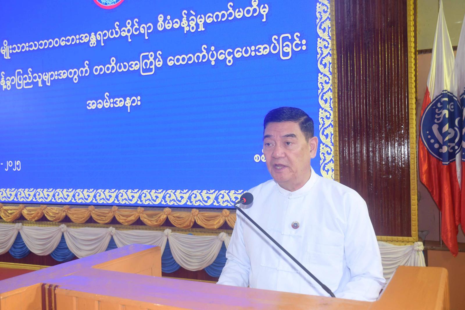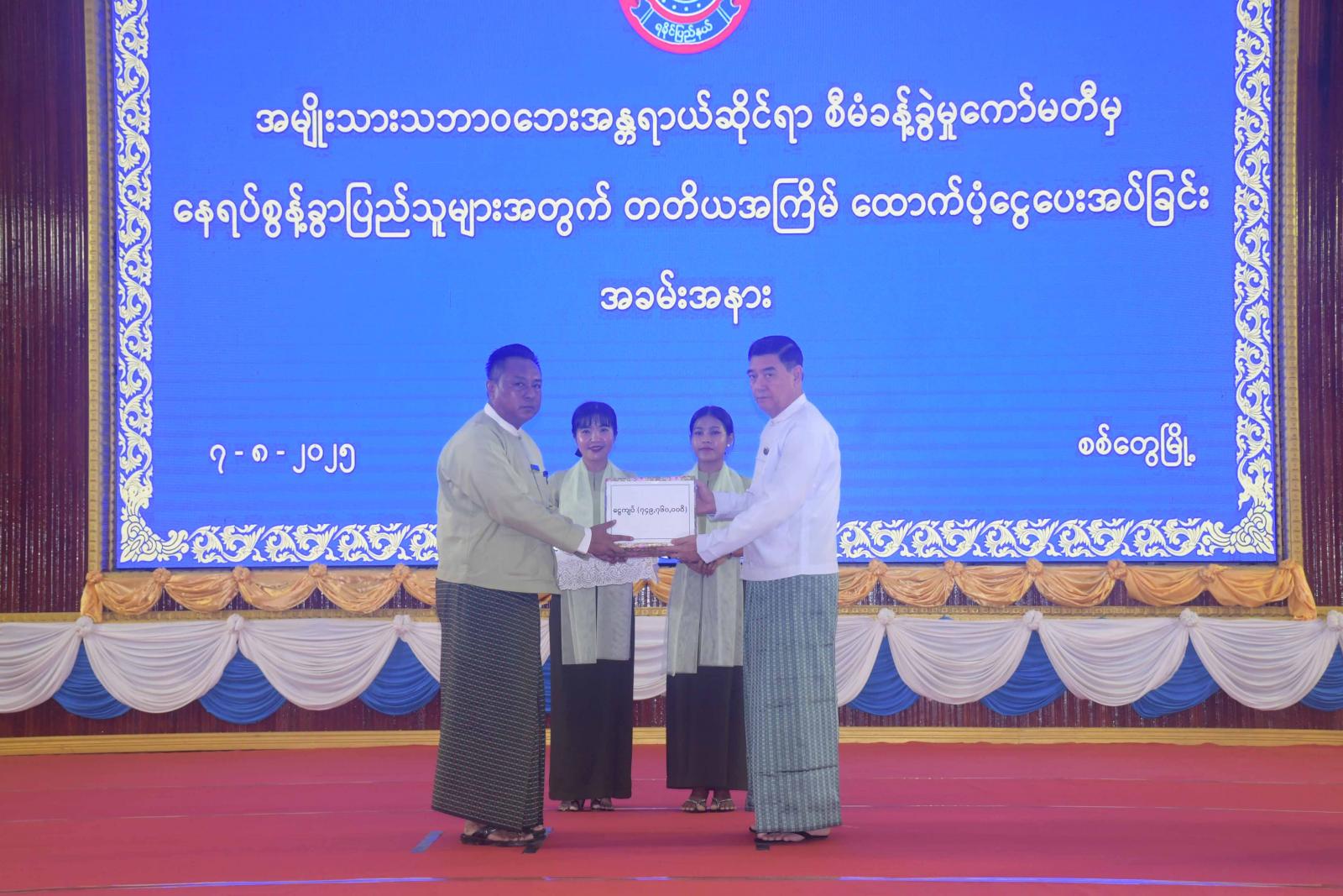 အခမ်းအနားတွင် ရခိုင်ပြည်နယ်ဝန်ကြီးချုပ် ယနေ့အခမ်းအနားသည် အမျိုးသား သဘာဝဘေးအန္တရာယ်ဆိုင်ရာ စီမံခန့်ခွဲမှုကော်မတီမှ ရခိုင်ပြည်နယ်အတွင်း နေရပ်စွန့်ခွာသူ (၁၂၇၁၆) ဦးအား တတိယအကြိမ်အဖြစ် ၂၀၂၅ ခုနှစ်၊ ဧပြီလ၊ မေလနှင့် ဇွန်လ(၃)လ စာအတွက် ထောက်ပံ့သည့် ငွေကျပ်(၇၆၂ ဒသမ ၉၆) သန်းကို ပေးအပ်ခြင်းအခမ်းအနားဖြစ်ကြောင်း၊ ရခိုင်ပြည်အစိုးရအဖွဲ့မှ ၂၀၂၄ ခုနှစ်၊ ဩဂုတ်လမှစ၍ ယနေ့အထိစစ်တွေမြို့နယ်ရှိ နေရပ်စွန့်ခွာ ပြည်သူများအတွက် (၂၄)ပြည်ပါ ဆန်အိတ် (၈၃၆၉) အိတ်နှင့် (၁၉) ပြည်ပါ ဆန်အိတ် (၁၁၆၂) အိတ်၊ ကျောက်ဖြူမြို့နယ် နေရပ်စွန့်ခွာပြည်သူများအတွက် (၂၄)ပြည်ပါ ဆန်အိတ် (၆၀၀၀) အိတ် ထောက်ပံ့ပေးခဲ့ပြီးဖြစ်ကြောင်း၊ အလားတူ ၂၀၂၅-၂၀၂၆ ပညာသင်နှစ် ကျောင်းဖွင့်ချိန်တွင် စစ်တွေမြို့ပေါ်ရှိ ယာယီနေရပ်စွန့်ခွာစုရပ်(၅၄) ခုမှ ကျောင်းသား၊ ကျောင်းသူများ မိုးရာသီတွင် အသုံးပြုရန်အတွက် အခြေခံပညာအဆင့်နှင့် တက္ကသိုလ်အဆင့် ကျောင်းသား၊ ကျောင်းသူ (၁၅၇၆) ဦးတို့အား တစ်ဦးလျှင်ထီး(၁)လက်နှုန်းဖြင့် ငွေကျပ်တစ်ရာရှယ်ဆယ်သိန်း လေးသောင်းခုနစ် ထောင်ဖိုး ဝယ်ယူထောက်ပံ့ပေးအပ်ခဲ့ကြောင်း၊ ထို့ပြင် စစ်တွေမြို့ပေါ်ရှိ ယာယီနေရပ်စွန့်ခွာ စုရပ်(၅၄) ခုတွင် ရောက်ရှိနေသော မိဘပြည်သူများ လုံခြုံစိတ်အေးချမ်းသာစွာ နေထိုင်နိုင်ရေးအတွက် လူနေဆောင်(၂၀) ဆောင်၊ စားချက်ဆောင်(၂၈) ဆောင်၊ အိမ်သာ(၂၇)လုံး၊ လုံခြုံရေးမီး (၁၃၅)လုံး၊ ရေတွန်းလှည်း(၄၂)စီးတို့အားစီစဉ်ဆောင်ရွက်ပေးထားပြီးဖြစ်ကြောင်း၊ မိဘပြည်သူများ ၏ သား၊ သမီးများ ပညာသင်ကြားခွင့် မဆုံးရှုံးစေရေးအတွက် နီးစပ်ရာကျောင်းများတွင် ပညာသင်ကြားနိုင်ရေး ဆောင်ရွက်ပေးထားပြီးဖြစ်သည့်အတွက် သား၊ သမီးများပညာရေး ဆုံးခန်းတိုင်အောင် တက်ရောက်ပြီးစီးရေးအတွက် တိုက်တွန်းပူးပေါင်းဆောင်ရွက်ပေးကြစေလိုကြောင်း၊ အလားတူ ဝါတွင်းကာလတွင် နေရပ်စွန့်ခွာပြည်သူများ ကောင်းမှုကုသိုလ်ပြုလုပ်နိုင်ရေးအတွက် ယာယီနေရပ်စွန့်ခွာစုရပ်(၅၄) ခုရှိဘုန်းတော်ကြီးကျောင်း (၁)ကျောင်းလျှင် ဝါဆိုသင်္ကန်း(၁)စုံနှင့် နဝကမ္မအလှူငွေ(၂) သိန်း ဆက်ကပ်ရန်အတွက် ရခိုင်ပြည်နယ်အစိုးရအဖွဲ့က စုစုပေါင်းငွေကျပ် တစ်ရာခြောက်ဆယ်နှစ်သိန်းအား ထောက်ပံ့ ပေးခဲ့ကြောင်း၊ ရခိုင်ပြည်နယ်ရှိ နေရပ်စွန့်ခွာ ပြည်သူများအတွက် တတိယအကြိမ်ထောက်ပံ့ငွေများအား (၃) လစာအတွက် (၁) ဦးလျှင် ငွေကျပ် ၆၀၀၀၀ နှုန်း၊ စစ်တွေမြို့ရှိ စုရပ်(၅၄)ခုမှ နေရပ်စွန့်ခွာပြည်သူများအတွက် (၁) ဦးလျှင် အသင့်စား ခေါက်ဆွဲခြောက်ထုပ်များ ထောက်ပံ့ပေးသွားမည်ဖြစ်ရာ စုရပ်အဖွဲ့ခေါင်းဆောင်၊ အဖွဲ့ဝင်များကလည်း ထောက်ပံ့ငွေများနှင့်ခေါက်ဆွဲခြောက်ထုပ်များနေရပ်စွန့်ခွာ ပြည်သ