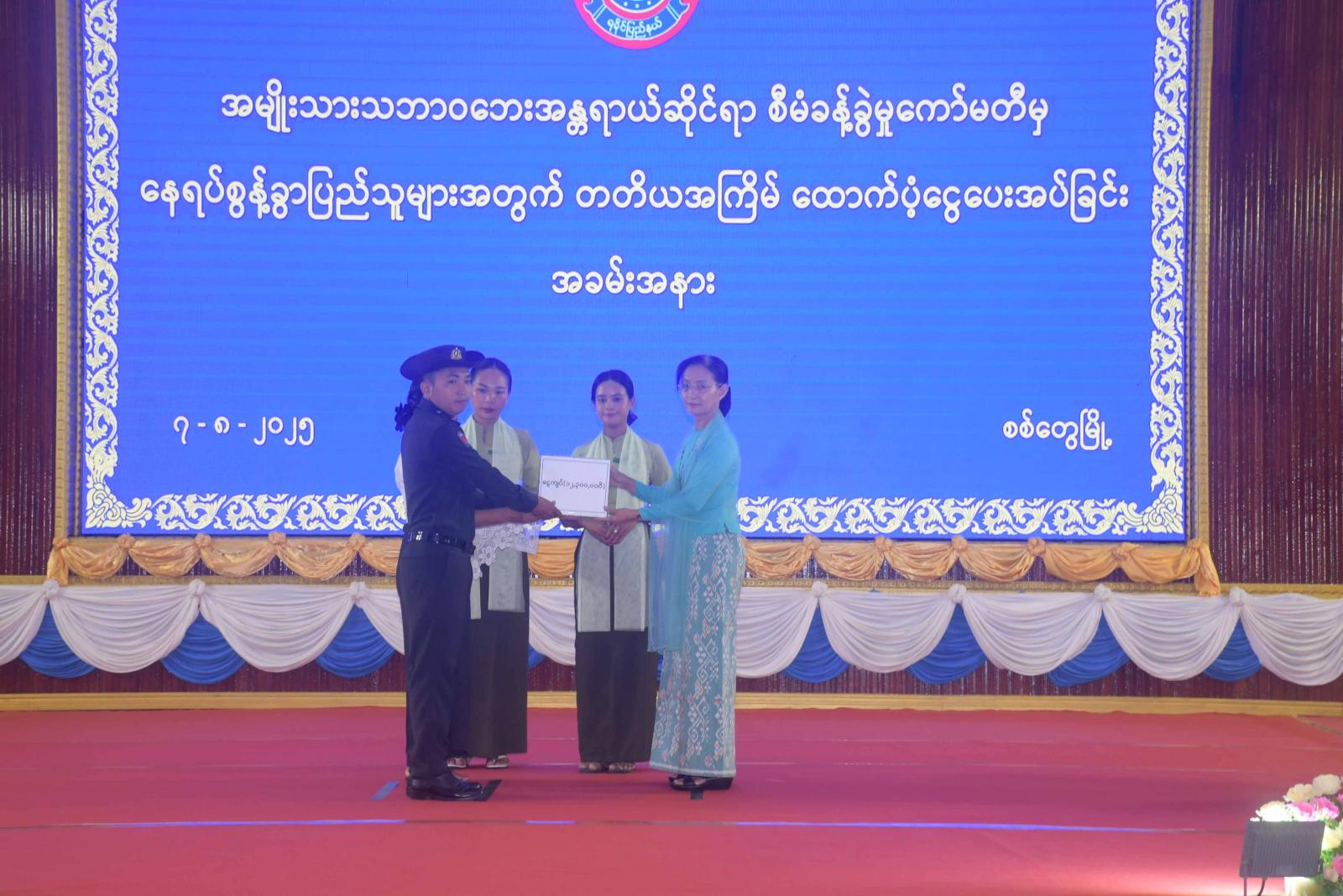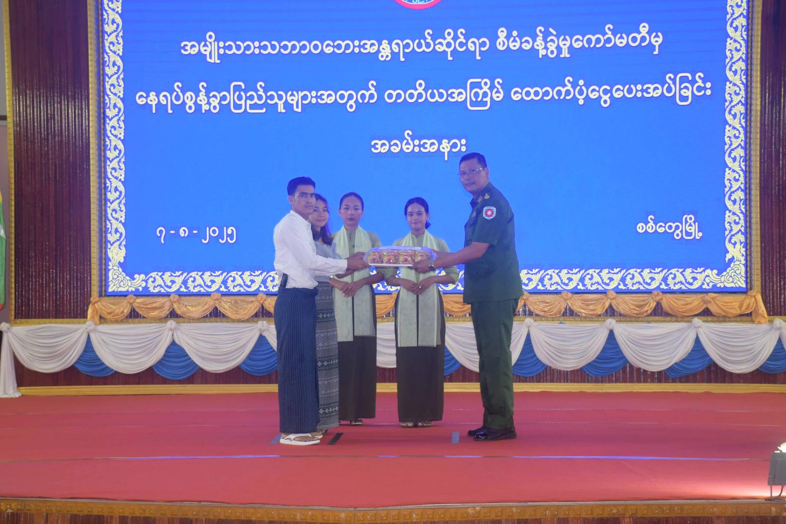 ဆက်လက်၍ ရခိုင်ပြည်နယ်ဝန်ကြီးချုပ် ဦးထိန်လင်းနှင့်ဇနီး ပြည်နယ်အမျိုးသမီး ရေးရာအဖွဲ့ နာယက ဒေါ်ဆွေဆွေမြတ်၊ ပြည်နယ်တရားလွှတ်တော်တရားသူ ကြီးချုပ်၊ ပြည်နယ်လုံခြုံရေးနှင့်နယ်စပ်ရေးရာဝန်ကြီးတို့က နေရပ်စွန့်ခွာဝန်ထမ်းများနှင့်နေရပ်စွန့်ခွာပြည်သူများကို ထောက်ပံ့ငွေများနှင့် ခြောက်ဆွဲထုပ်များကို ပေးအပ်ကြသည်။