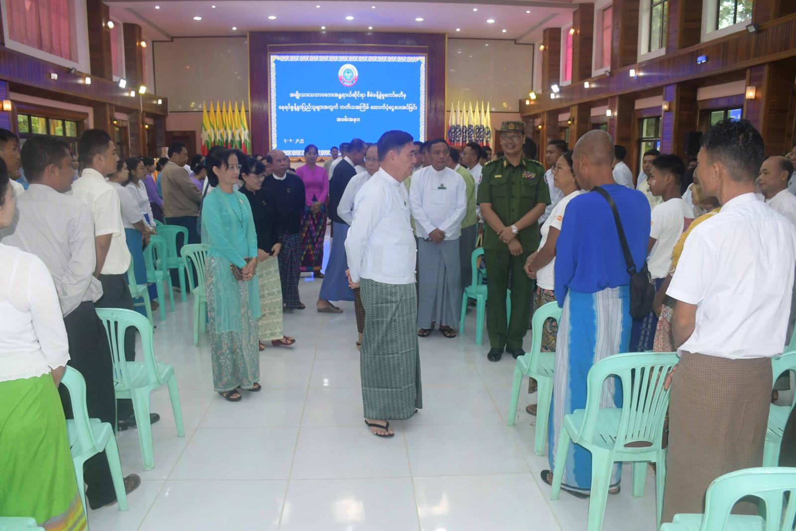 ယင်းနောက် ရခိုင်ပြည်နယ်ဝန်ကြီးချုပ်နှင့်အဖွဲ့သည် တက်ရောက်လာကြသော ဌာနဆိုင်ရာများ၊ နေရပ်စွန့်ခွာဝန်ထမ်းများနှင့် နေရပ်စွန့်ခွာပြည်သူများအား ရင်းရင်းနှီးနှီးတွေ့ဆုံနှုတ်ဆက်ခဲ့ကြကြောင်း သိရသည်။