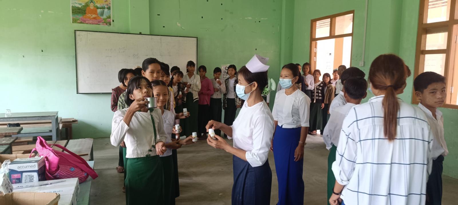 ထိုသို့ဆောင်ရွက်ပေးရာတွင် ကျောင်းသား၊ ကျောင်းသူများအား တစ်ကိုယ်ရေသန့်ရှင်းရေး စစ်ဆေးဆောင်ရွက်ခြင်း၊ စနစ်တကျလက်ဆေးခြင်း စနစ်မှန်သွားတိုက်ခြင်းများကို သရုပ်ပြပညာပေးခြင်း၊ မျက်စိရောဂါဖြစ်ပွားမှုကာကွယ်ရေး အမြင်အာရုံတိုင်းတာခြင်း၊ သံချဆေးတိုက်ကျွေးခြင်းနှင့် အပျိုဖော်ဝင် အလယ်တန်းနှင့်အထက်တန်းအဆင့် ကျောင်းသူများအား သံဓာတ်ဆေးပြား (Furamin BC)များကို ထောက်ပံ့ပေးကာ ကျောင်းဈေးတန်းမှ အစားအသောက်များ ရောင်းချနေမှုအပေါ် ကျန်းမာရေးနှင့်ညီညွှတ်မှုရှိမရှိ စစ်ဆေးဆောင်ရွက်ခဲ့သည်။