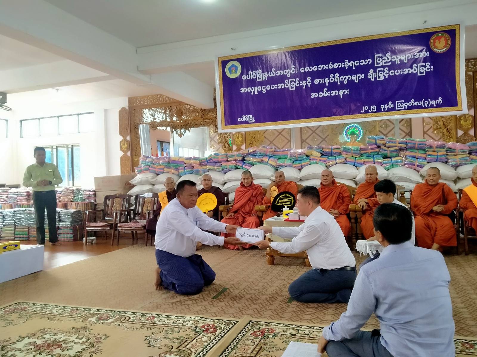 ယင်းနောက် ပေါင်မြို့နယ် လေဘေးသင့်ပြည်သူများအတွက် ကျိုက်ထီးဆောင်းဆရာတော်ကြီးကလှူဒါန်းသော လှူဒါန်းပစ္စည်းတန်ဖိုးကျပ် ၉၅,၉၃၄,၀၀၀ နှင့် ငွေကျပ်သိန်း ၃၀၀ စုစုပေါင်းလှူဒါန်းငွေကျပ် ၁၂၅,၉၃၄,၀၀၀ အား ပြည်ထောင်စုဝန်ကြီးကလည်းကောင်း၊ အဂ္ဂမဟာသီရိသုဓမ္မမဏိဇောတဓရ ဦးလှထွန်း(ကိုလှထွန်းငရုတ်သီးမှုန့်လုပ်ငန်းမိသားစု)က လှူဒါန်းငွေကျပ်သိန်း ၅၀၀ နှင့် ဦးတင်လှိုင်(ကျော်ကြားအိမ်ဆောက်ပစ္စည်းရောင်းဝယ်ရေးမိသားစု)က လှူဒါန်းငွေကျပ် ၂၄၆ သိန်းအား ပြည်နယ်ဝန်ကြီးချုပ်ကလည်းကောင်း အသီးသီးလက်ခံရယူကြသည်။
