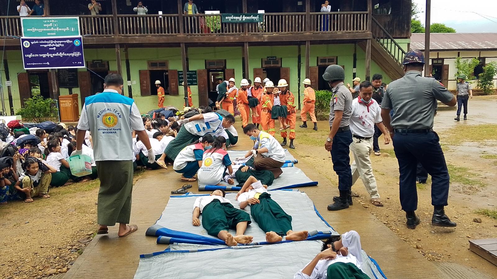 ထို့နောက် ကသာခရိုင် မြို့နယ်မီးသတ်ဦးစီးဌာနမှ တာဝန်ခံ ဦးဇော်ဝင်းထွန်းနှင့် မီးသတ် တပ်ဖွဲ့ဝင်များက ဆရာ၊ ဆရာမများ၊ ကျောင်းသား/ကျောင်းသူများနှင့်ပူးပေါင်း၍ ငလျင် လှုပ်ခတ်မှုဖြစ်စဉ် သရုပ်ပြခြင်း၊ အထပ်မြင့်တွင် ပိတ်မိနေသော လူနာများအား ထွင်းဖောက် ဝင်ရောက်၍ ကယ်ဆယ်ခြင်းတို့ကို လက်တွေ့သရုပ်ပြသပေးခဲ့သည်။ အလားတူ ကယ်ဆယ် ရရှိသည့်လူနာများအား မြို့နယ်ကြက်ခြေနီတပ်ဖွဲ့မှ ရှေးဦးသူနာပြုစုခြင်းများ၊ မြို့နယ်ကျန်းမာရေးဦးစီးဌာနမှ ကျန်းမာရေးစောင့်ရှောက်ပေးမှုများကို ဆက်တိုက် သရုပ်ပြသ ခဲ့ကြသည်။