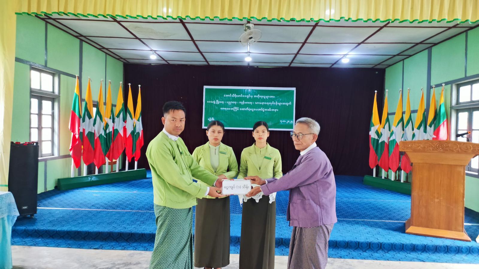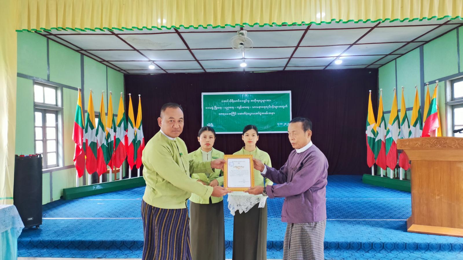 ယင်းနောက် ခန္တီးခရိုင်စီမံခန့်ခွဲရေးနှင့် အုပ်ချုပ်ရေးကော်မတီဥက္ကဋ္ဌ ဦးအောင်ဇော်ထက်က အောင်သီရိဖောင်ဒေးရှင်းမှ ထောက်ပံ့လှူဒါန်းမှုအတွက် ဂုဏ်ပြုမှတ်တမ်းလွှာပေးအပ်ရာ အောင်သီရိဖောင်ဒေးရှင်း စာရင်းစစ်အဖွဲ့ဝင် ဦးလှသန်းက လက်ခံရယူခဲ့သည်။