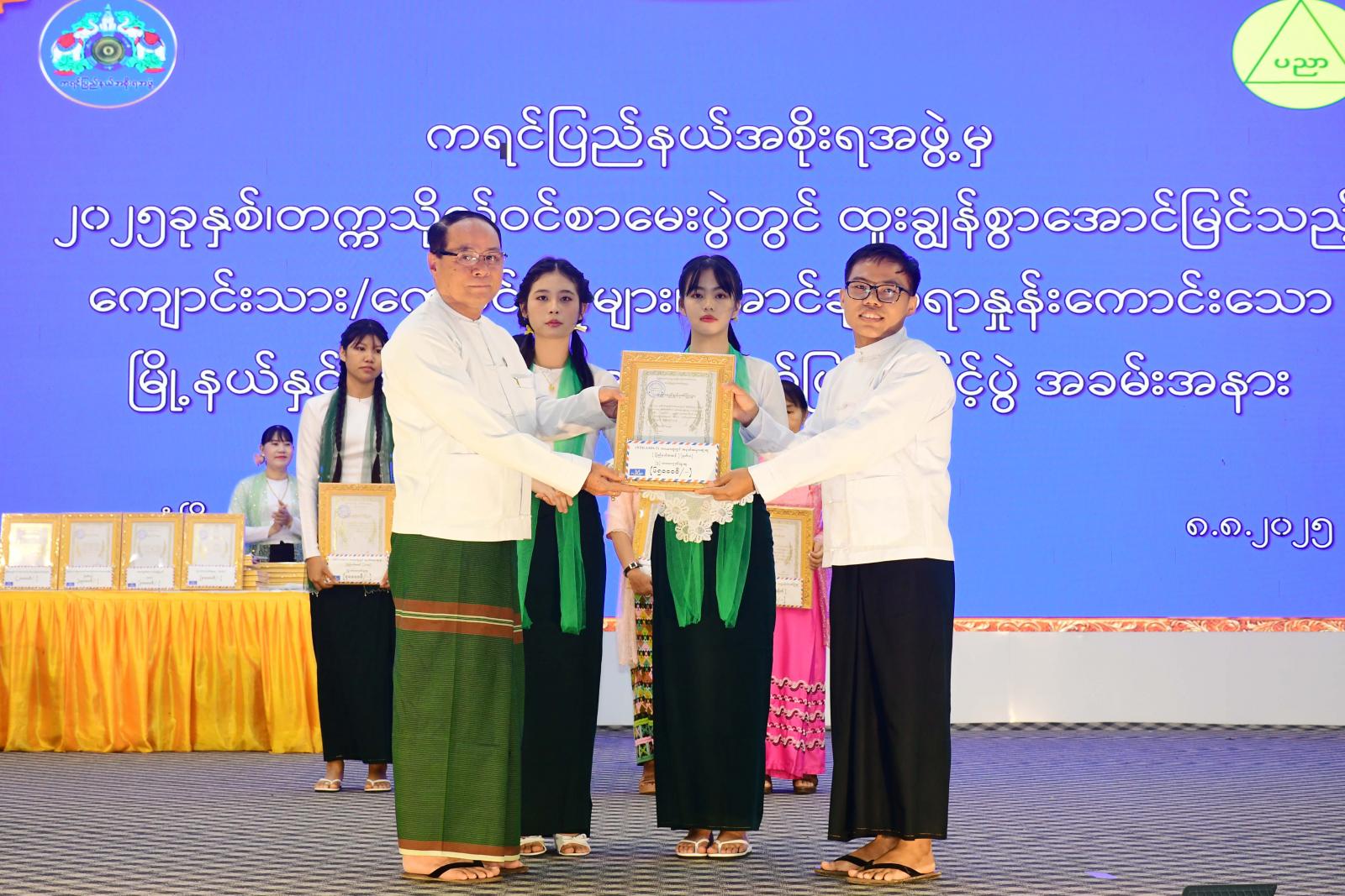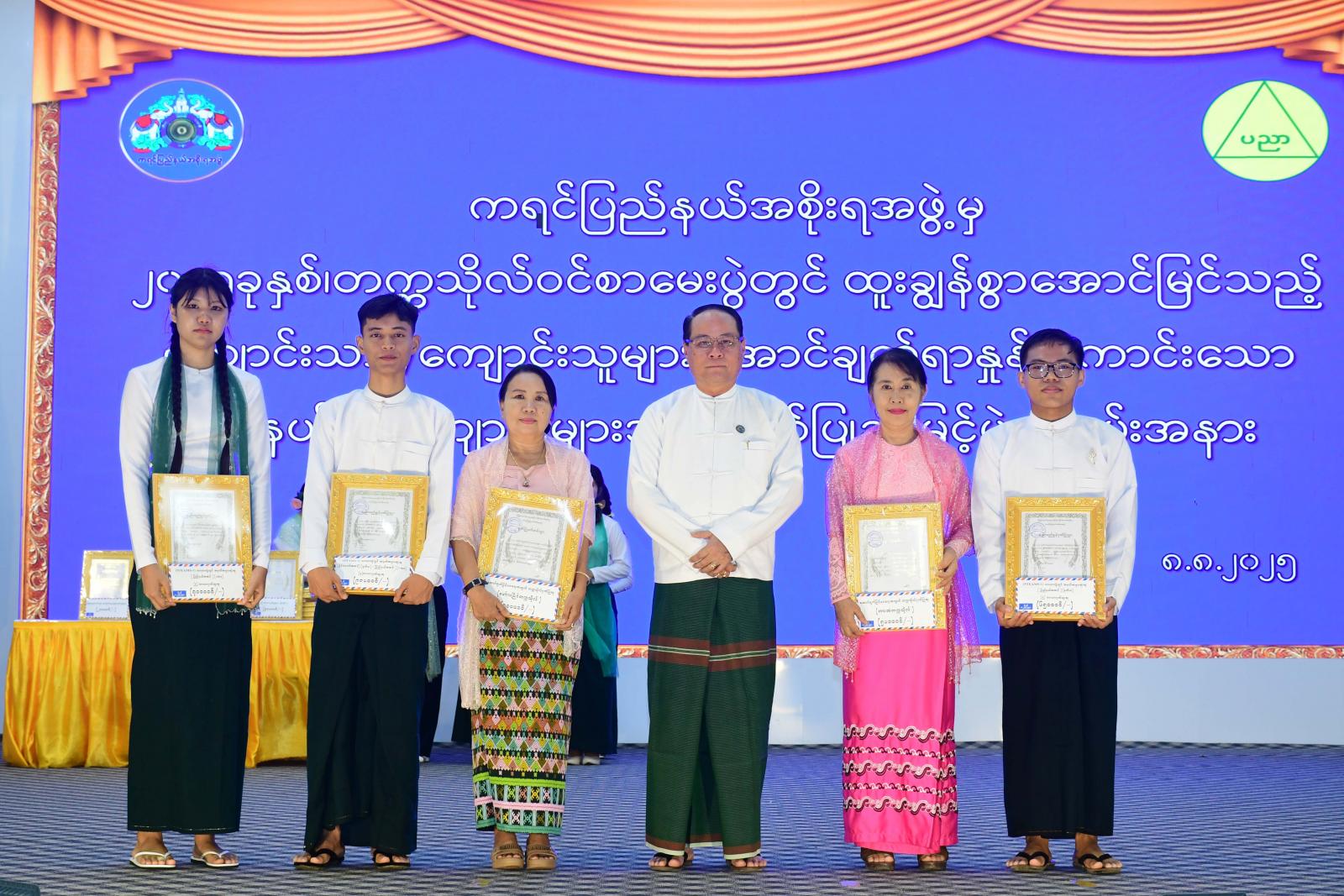 ယင်းနောက် ပြည်နယ်ဝန်ကြီးချုပ်၊ ပြည်နယ်အမျိုးသမီးရေးရာအဖွဲ့နာယက၊ ပြည်နယ်တရားလွှတ်တော် တရားသူကြီးချုပ်၊ ပြည်နယ်အစိုးရအဖွဲ့ဝင်များက တက္ကသိုလ်ဝင်စာမေးပွဲ အောင်ချက်မြင့်မားရေးအတွက် ပံ့ပိုးကူညီပေးခဲ့သော ဘားအံတက္ကသိုလ်၊ မော်လမြိုင်တက္ကသိုလ်၊ (၅)ဘာသာဂုဏ်ထူးရှင်(၂)ဦး၊ ၄ ဘာသာဂုဏ်ထူးရှင်(၇)ဦး၊ (၃) ဘာသာဂုဏ်ထူးရှင်(၂၁)ဦး၊ (၂)ဘာသာဂုဏ်ထူးရှင်(၂၇)ဦး၊ (၁)ဘာသာဂုဏ်ထူးရှင်(၁၂၃)ဦး၊ STEAMS-1 ဘာသာတွဲ တွင် ပြည်နယ်အဆင့်အမှတ်အများဆုံး(၃)ဦး၊ STEAMS-2 ဘာသာတွဲတွင် ပြည်နယ်အဆင့် အမှတ်အများဆုံး(၃)ဦး၊ STEAMS-1 ဘာသာတွဲတွင် နိုင်ငံတော်အဆင့် ဒုတိယအဆင့်ရရှိသူ (၁)ဦး၊ အောင်ချက်အကောင်းဆုံးမြို့နယ်များ၊ အောင်ချက်အကောင်းဆုံးကျောင်းများကို ဂုဏ်ပြုဆုများ ပေးအပ်ချီးမြှင့်ခဲ့ကြပြီး ယနေ့အခမ်းအနားတွင် ဂုဏ်ပြုဆုပေါင်း(၂၀၈)ဆု၊ ဂုဏ်ပြုဆုငွေပေါင်း ၃၄၈၅၀၀၀ဝိ/-(သုံးရာလေးဆယ်ရှစ်သိန်းငါးသောင်း)ကျပ်ကို ချီးမြှင့်ခဲ့ကြသည်။