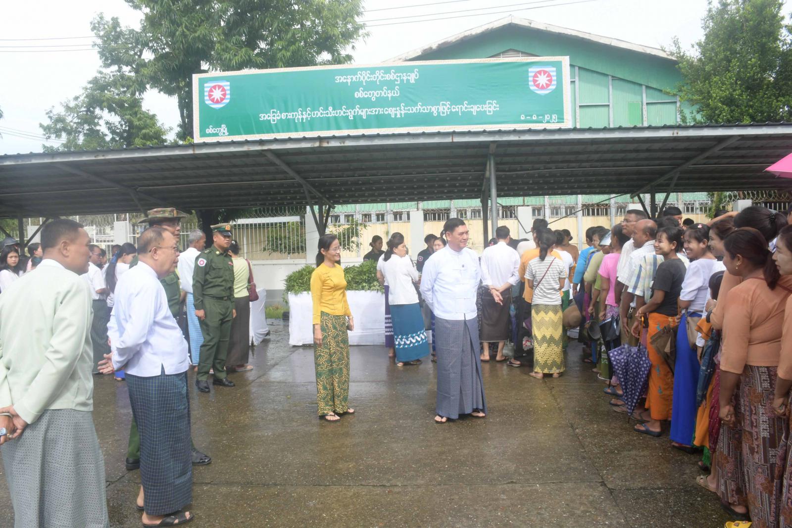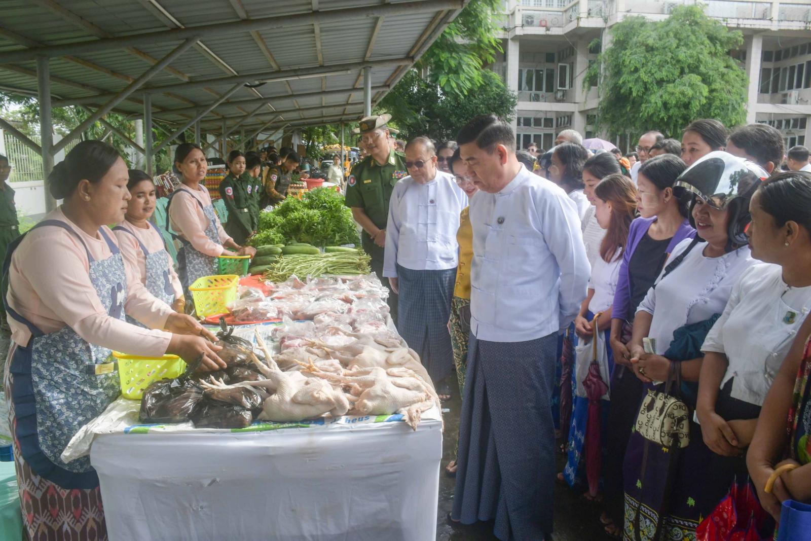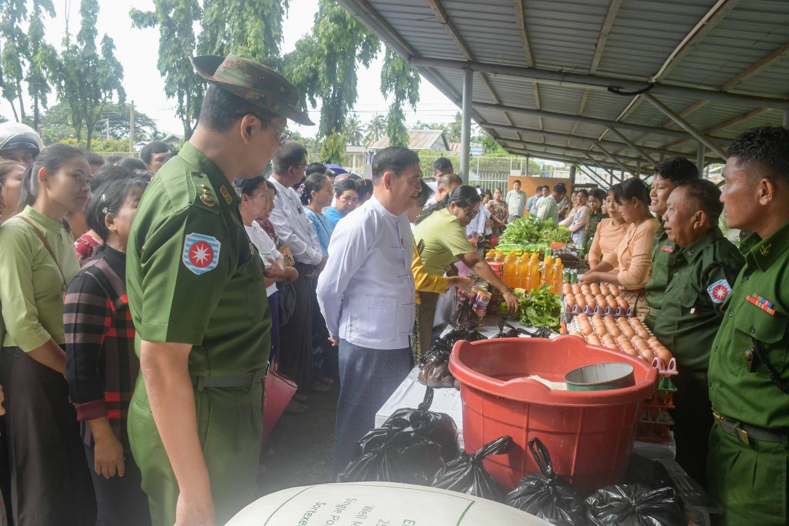 ဒေသကွပ်ကဲမှုစစ်ဌာနချုပ်(စစ်တွေ)မှ ဝန်ထမ်းများအား ဆန်၊ စားအုန်းဆီနှင့်အခြေခံ စားကုန်များ၊ သား၊ ငါး၊ ကြက်ဥ၊ ဟင်းသီးဟင်းရွက်များကို သက်သာသောဈေးနှုန်းဖြင့် ရောင်းချပေးခြင်းကို ယနေ့နံနက်ပိုင်းက ရခိုင်ပြည်နယ်အစိုးရအဖွဲ့ရုံးရှေ့၌ပြုလုပ်ရာ ရခိုင်ပြည်နယ်ဝန်ကြီးချုပ် ဦးထိန်လင်းနှင့်အဖွဲ့ဝင်များ ကြည့်ရှုအားပေးကြသည်။