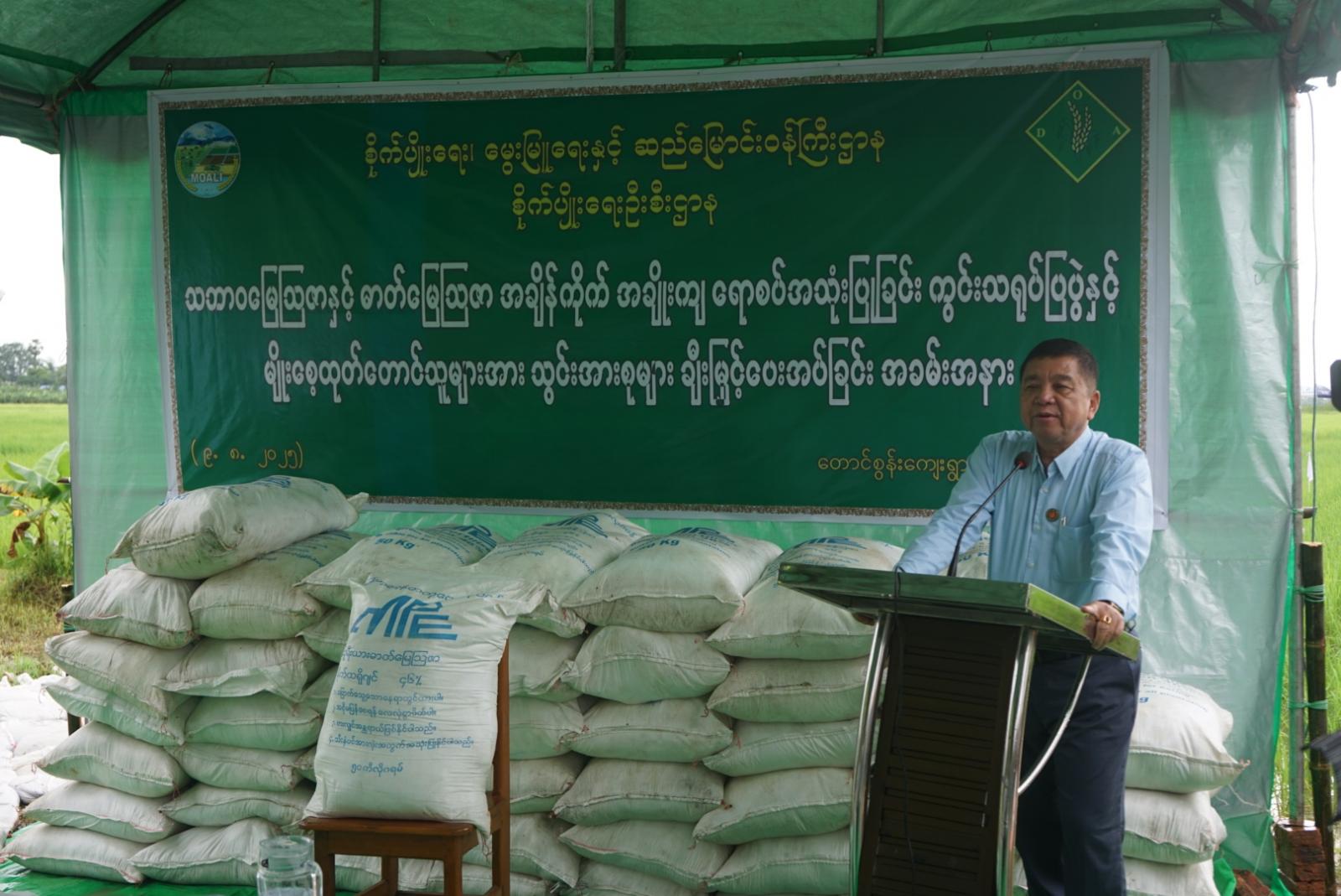 အဆိုပါ သွင်းအားစုများကို တောင်သူ (၁၄)ဦး၏ မျိုးစေ့ထုတ် စိုက်ဧက (၅၀)အတွက် ရွှေဇီဝသဘာဝမြေဩဇာ(၁၂)အိတ်နှင့် MEP ဓာတ်မြေဩဇာ (၅၀)အိတ် ချီးမြှင့်ပေးအပ်ခဲ့ကြောင်း မြို့နယ်အတွင်း မိုးစပါးစိုက်ပျိုးရာသီ၌ မိုးစပါးစိုက်ဧက (၆၅၃၀၉) ဧက စိုက်ပျိုးနိုင်ရန် လျာထားဆောင်ရွက်လျက်ရှိရာ (၆၄၁၄၃)ဧက စိုက်ပျိုးပြီးစီးပြီဖြစ်ကြောင်း မြို့နယ်စိုက်ပျိုးရေးဦးစီးဌာနမှ သိရသည်။