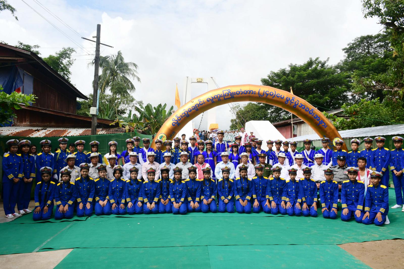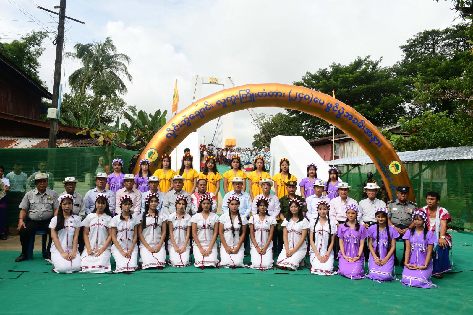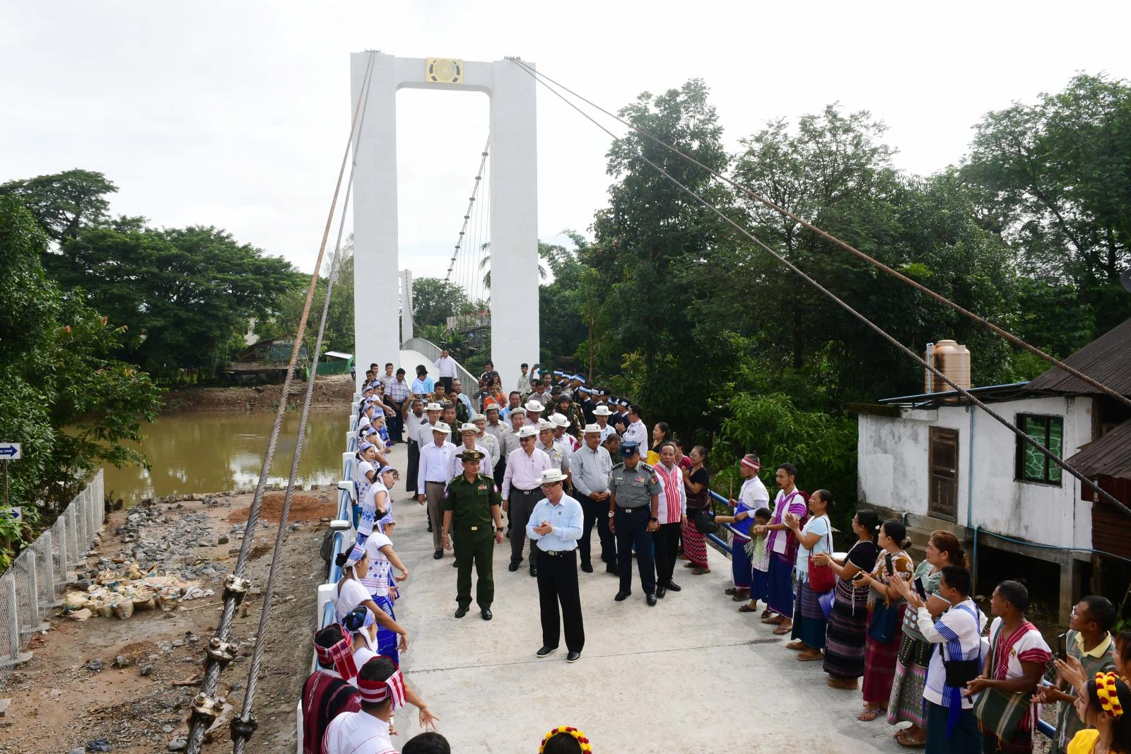 ထို့နောက် ပြည်နယ်ဝန်ကြီးချုပ်နှင့်တာဝန်ရှိသူများသည် အရှည် (၂၄၀)ပေ၊ လူသွားလမ်းအကျယ် (၆)ပေ၊ သံမဏိကြိုးဆိုင်းတံတားအမျိုးအစား၊ 1m Ø Bored Pile အုတ်မြစ်၊ သံကူကွန်ကရစ်ကမ်းကပ်ခုံ/ကိုယ်ထည်နှင့် သံကူကွန်ကရစ်တာဝါတိုင်၊ အပေါ်ထည်သံမဏိကြိုးဆိုင်းတံတားတို့ဖြင့် တည်ဆောက်ထားသော လူကူးကြိုးတံတားအား ဖြတ်သန်းကြည့်ရှုစစ်ဆေးကြပြီး ဖွင့်ပွဲတွင် ပါဝင်အားဖြည့်ကူညီပေးကြသော ဘင်ခရာ၊ ပန်းပွားအဖွဲ့နှင့် ယဉ်ကျေးမှုအဖွဲ့များအား ဂုဏ်ပြုဆုများပေးအပ်ချီးမြှင့်ကာ စုပေါင်းမှတ်တမ်းဓာတ်ပုံများ ရိုက်ကူးခဲ့ကြသည်။