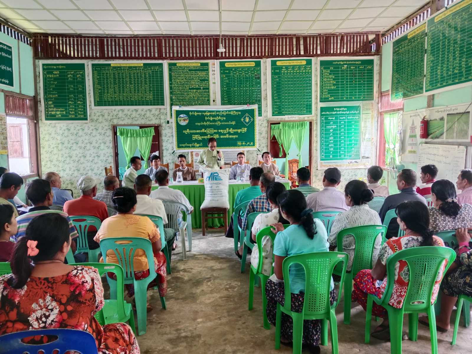 ဆက်လက်၍ မြို့နယ်စိုက်ပျိုးရေးဦးစီးဌာနမှူး ဦးဇော်မင်းက ၂၀၂၅ ခုနှစ်အတွက် မိုးရာသီ မိုးစပါးပန်းတိုင်စံပြကျေးရွာ၊ မျိုးစေ့ထုတ်စိုက်ခင်း၊ စံပြကွက်၊ စမ်းသပ်ကွက်နှင့် မိုးစပါးစိုက်ပျိုးသည့် တောင်သူများအား (တတိယအကြိမ်) ယူရီးယားဓာတ်မြေဩဇာ ဈေးနှုန်းချိုသာစွာဖြင့် ဖြန့်ဖြူးပေးအပ်ခြင်း ရည်ရွယ်ချက်အား ရှင်းလင်းပြောကြားသည်။