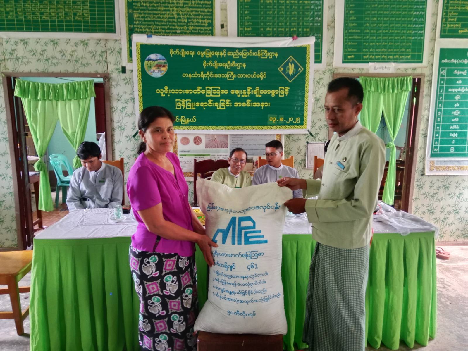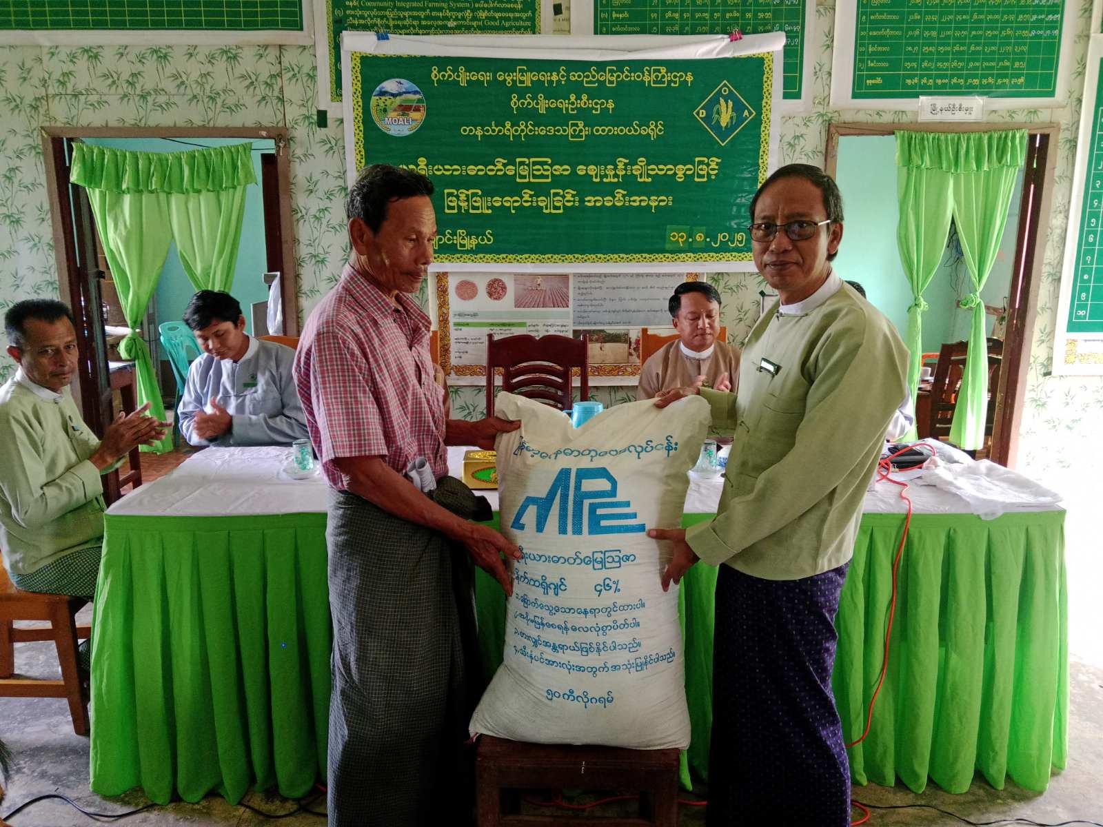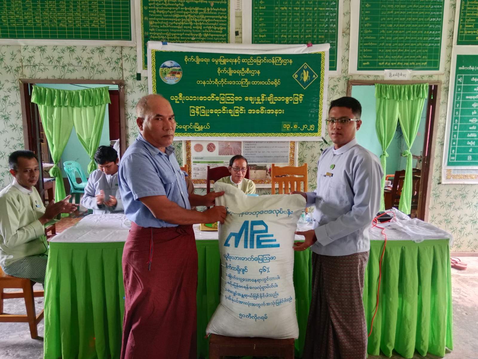 ထို့နောက် မြို့နယ်စီမံခန့်ခွဲရေးနှင့်အုပ်ချုပ်ရေးကော်မတီဥက္ကဋ္ဌနှင့် တာဝန်ရှိသူများမှ တောင်သူများထံသို့ ယူရီးယားဓာတ်မြေဩဇာနှင့် ပျိုးပင်များပေးအပ်ကြောင်း သိရသည်။ အခမ်းအနားတွင် မြို့နယ်အတွင်းရှိ မိုးရာသီမိုးစပါးပန်းတိုင်စံပြကျေးရွာ၊ မျိုးစေ့ထုတ်စိုက်ခင်း၊ စံပြကွက်၊ စမ်းသပ်ကွက်နှင့် မိုးစပါးစိုက်ပျိုးသည့် တောင်သူများအား ယူရီးယားဓာတ်မြေဩဇာတစ်အိတ်လျှင် ကျပ် ၄၈၀၀၀ နှုန်းဖြင့် စုစုပေါင်း အိတ် ၄၀၀ ကို ကျေးရွာအုပ်စု ၁၄ ရွာရှိတောင်သူများအား စျေးနှုန်းချိုသာစွာဖြင့် ဖြန့်ဖြူးရောင်းချပေးခဲ့ကြောင်း မြို့နယ်စိုက်ပျိုးရေးဦးစီးဌာနမှူးက ပြောကြားသည်။