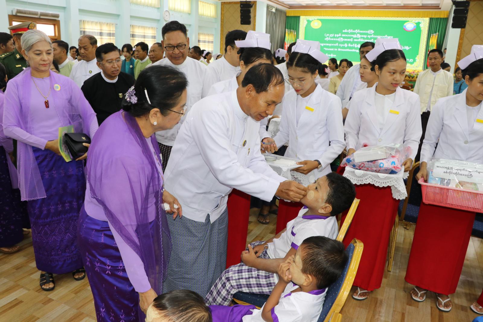 ထို့နောက် တိုင်းဒေသကြီးဝန်ကြီးချုပ်နှင့်တာဝန်ရှိသူများက အခမ်းအနားသို့တက် ရောက်လာကြ သည့် မူလတန်းကြိုကျောင်းများမှ အသက်(၅)နှစ်အောက် ကလေးငယ်များအား အင်အားပြည့် ဗီတာမင်အေဆေးလုံးများ တိုက်ကျွေးခဲ့ကြပြီး အမှတ်တရ လက်ဆောင်ပစ္စည်းများပေးအပ်ကာ တိုင်းဒေသကြီး မိခင်နှင့်ကလေးစောင့်ရှောက်မှုကြီးကြပ်ရေးအဖွဲ့နာယကဥက္ကဋ္ဌနှင့်အဖွဲ့ဝင်များက ကိုယ်ဝင်ဆောင်မိခင်များအား အဏုအာဟာရဆေးပြားနှင့် လက်ဆောင်ပစ္စည်းများ ပေးအပ်ကြသည်။