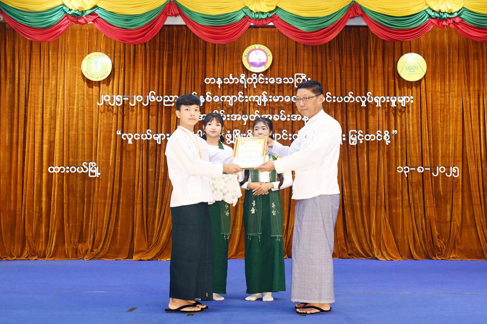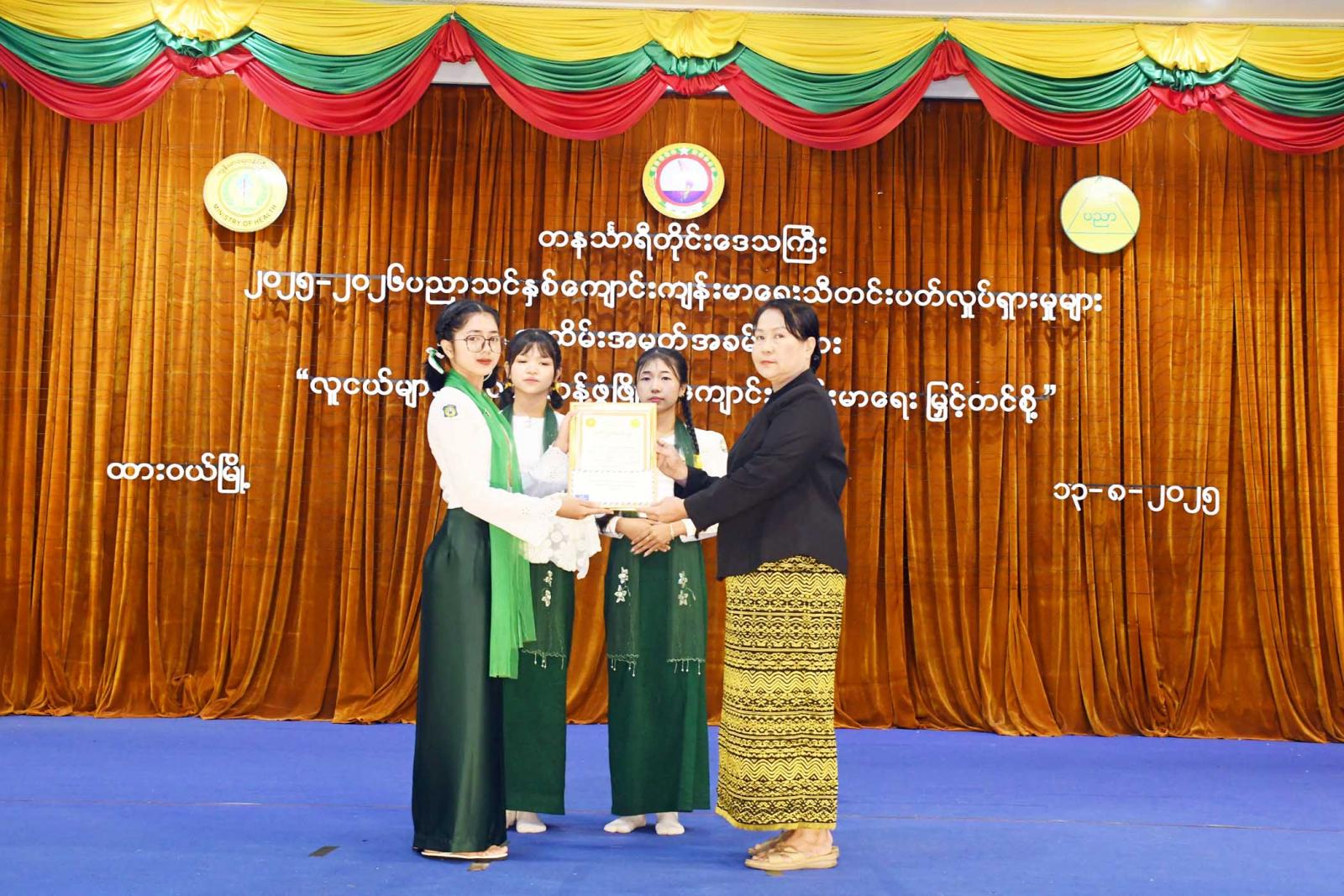 ဆက်လက်၍ တိုင်းဒေသကြီးဝန်ကြီးချုပ်၊ တိုင်းဒေသကြီးတရားလွှတ်တော်တရားသူကြီးချုပ်နှင့် တိုင်းဒေသကြီးဝန်ကြီးများက ကျောင်းကျန်းမာရေးသီတင်းပတ်လှုပ်ရှားမှုများအဖြစ် စာစီစာကုံး၊ ပန်းချီ၊ ပိုစတာပြိုင်ပွဲများတွင် ဆုရရှိသောကျောင်းသူ/ကျောင်းသားများအား ဆုချီးမြှင့်ပြီး အမှတ်(၁)အခြေခံ ပညာအထက်တန်းကျောင်းမှ ကျောင်းသား၊ ကျောင်းသူများက ကျန်းမာရေးသီချင်းဖြင့် သီဆိုဂုဏ်ပြု သည်။