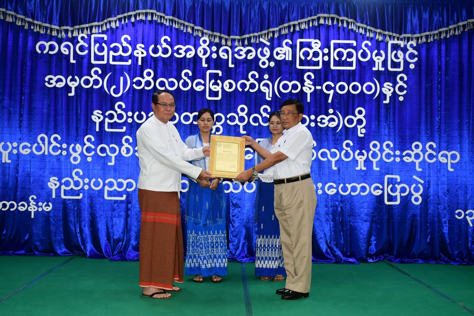 ထို့နောက် မြန်မာစီးပွားရေးကော်ပိုရေးရှင်း၊ အမှတ်(၂)ဘိလပ်မြေစက်ရုံ တန်(၄၀၀၀) စက်ရုံမှူးကြီး ဦးသိန်း ထွန်းအောင်က ဘိလပ်မြေထုတ်လုပ်မှုပိုင်းဆိုင်ရာနည်းပညာရပ်များ အသိပညာပေး ဟောပြောဆွေးနွေးမည့်အစီအစဉ် နှင့်စက်ရုံဆိုင်ရာအချက်အလက်များကို ရှင်းလင်းတင်ပြပြီး နည်းပညာတက္ကသိုလ်(ဘားအံ)ဒုတိယပါမောက္ခချုပ် ဒေါက်တာအောင်ဇော်လတ်က အသိပညာပေး ဟောပြောပွဲဆောင်ရွက်ရခြင်းအကြောင်းအား အကျဉ်းချုပ် ရှင်းလင်းတင်ပြကာ ပြည်နယ်ဝန်ကြီးချုပ်က စက်ရုံမှူးကြီးအား ဂုဏ်ပြုမှတ်တမ်းလွှာပေးအပ်ချီးမြှင့်သည်။