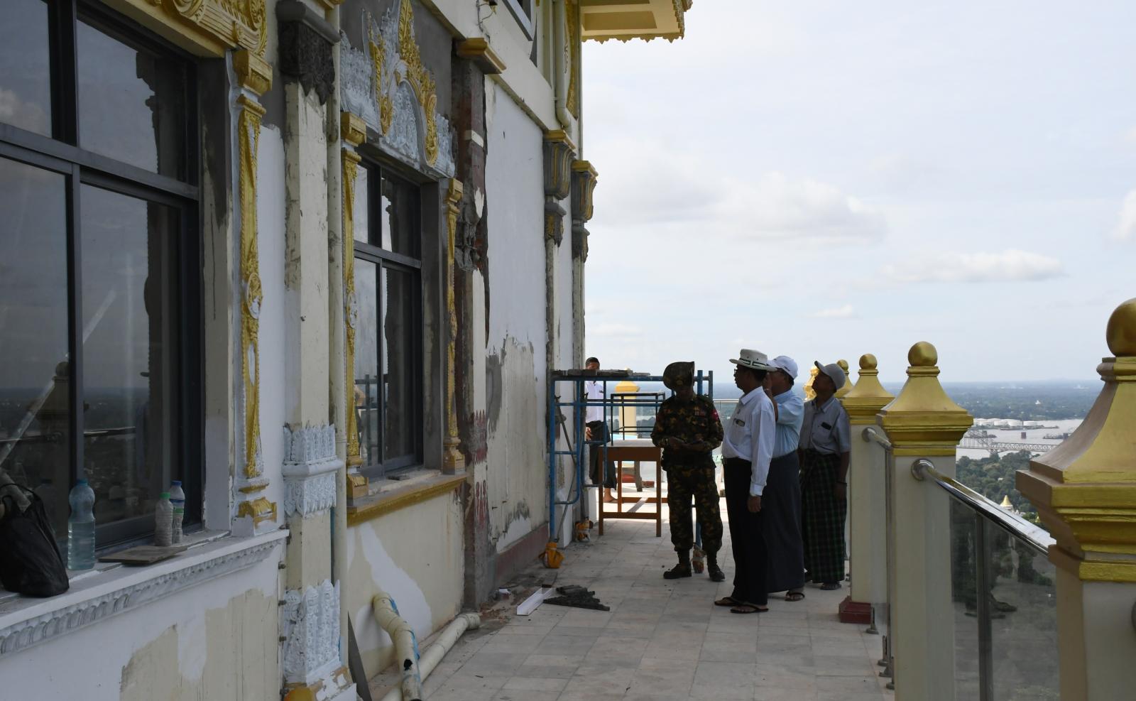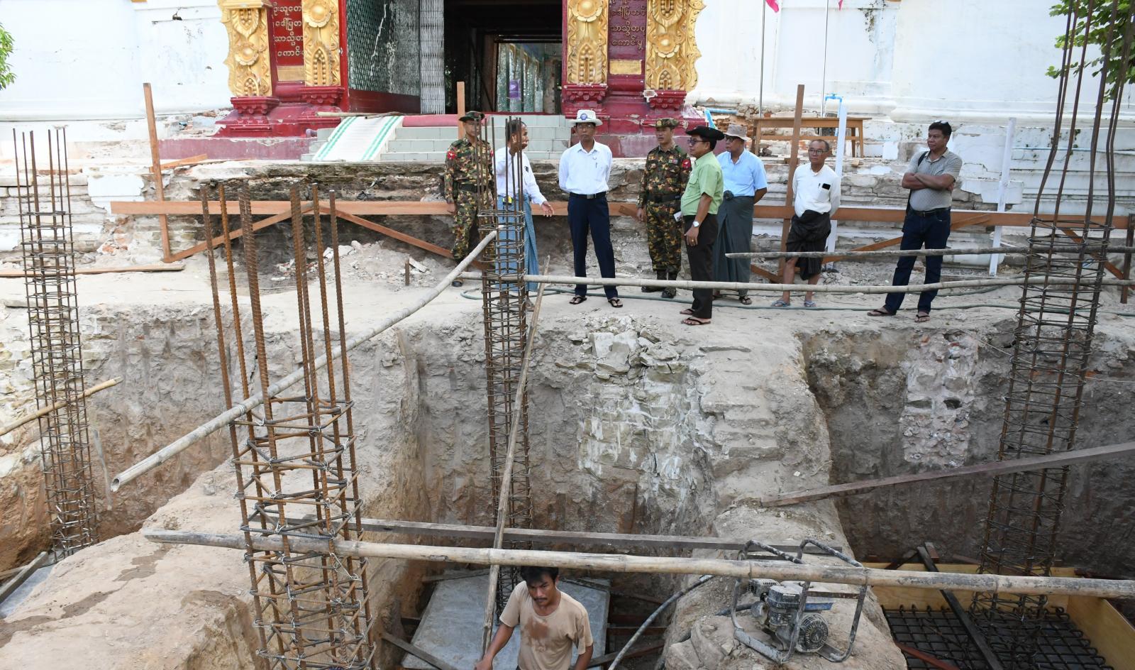 ထို့နောက် လမ်းပန်းဆက်သွယ်ရေးဝန်ကြီး ဦးခင်မောင်အေးနှင့် တာဝန်ရှိသူများသည် မန္တလေးငလျင်ကြီးလှုပ်ခတ်ခဲ့မှုကြောင့် ထိခိုက်ပျက်စီးခဲ့သည့် ဆွမ်းဦးပုညရှင်စေတီတော်နှင့် သာသနာ့ဗိမာန်တော်ကြီး ပြန်လည်ပြုပြင်မွမ်းမံနေမှုနှင့် ငလျင်လှုပ်ခတ်မှုကြောင့်ပြိုကျ ပျက်စီးခဲ့သည့်မဟာစေတီလှဘုရာကြီး အသစ်ပြန်လည် တည်ထားကိုးကွယ်နိုင်ရန်အတွက် လုပ်ငန်းများဆောင်ရွက်နေမှုအား လှည့်လည်ကြည့်ရှုစစ်ဆေးပြီး တာဝန်ယူဆောင်ရွက်နေသည့် လုပ်ငန်းအဖွဲ့များနှင့်တွေ့ဆုံ၍ လိုအပ်သည်များကို ပေါင်းစပ်ညှိနှိုင်းဖြည့်ဆည်း ဆောင်ရွက်ပေးခဲ့ကြောင်းသိရသည်။