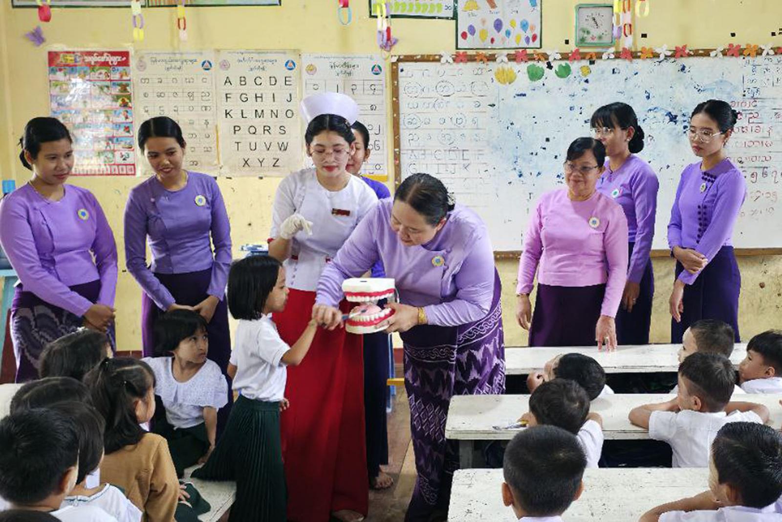 ရှေးဦးစွာ မြို့နယ်ပြည်သူ့ကျန်းမာရေးဦးစီးဌာနမှ ဆရာများနှင့် ခရိုင့်/မြို့နယ် မိခင်နှင့်ကလေးစောင့်ရှောက်ရေးအဖွဲ့ တာဝန်ရှိသူများက KG ကလေးများအား သွားကျန်းရေးဆိုင်ရာများနှင့် ပတ်သက်သည့်များကို အသိပညာပေးပြောကြားခဲ့သည်။ ဆက်လက်၍ သွားတိုက်ဆေး၊ သွားတိုက်တံတို့အား ပေးခဲ့ပြီး ကျောင်းသားကျောင်းသူများအား ဗီတာမင်အေးဆေးနှင့် သံချဆေးတို့ကို စနစ်တကျတိုက်ကျွေးခဲ့ကြသည်။