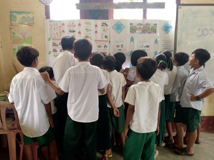 ထို့နောက် ပြန်ကြားရေးနှင့်ပြည်သူ့ဆက်ဆံရေးဦးစီးဌာနမှ သဘာဝဘေးနှင့်ပတ်သက်၍ ပြသထားသည့် နံရံကပ်စာစောင်များအား ကျောင်းသား၊ ကျောင်းသူများက စိတ်ပါဝင်စားစွာ လေ့လာကြည့်ရှုခဲ့ကြသည်။