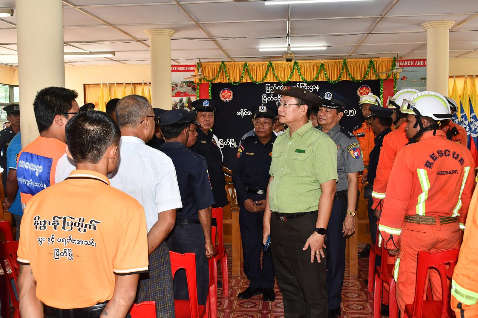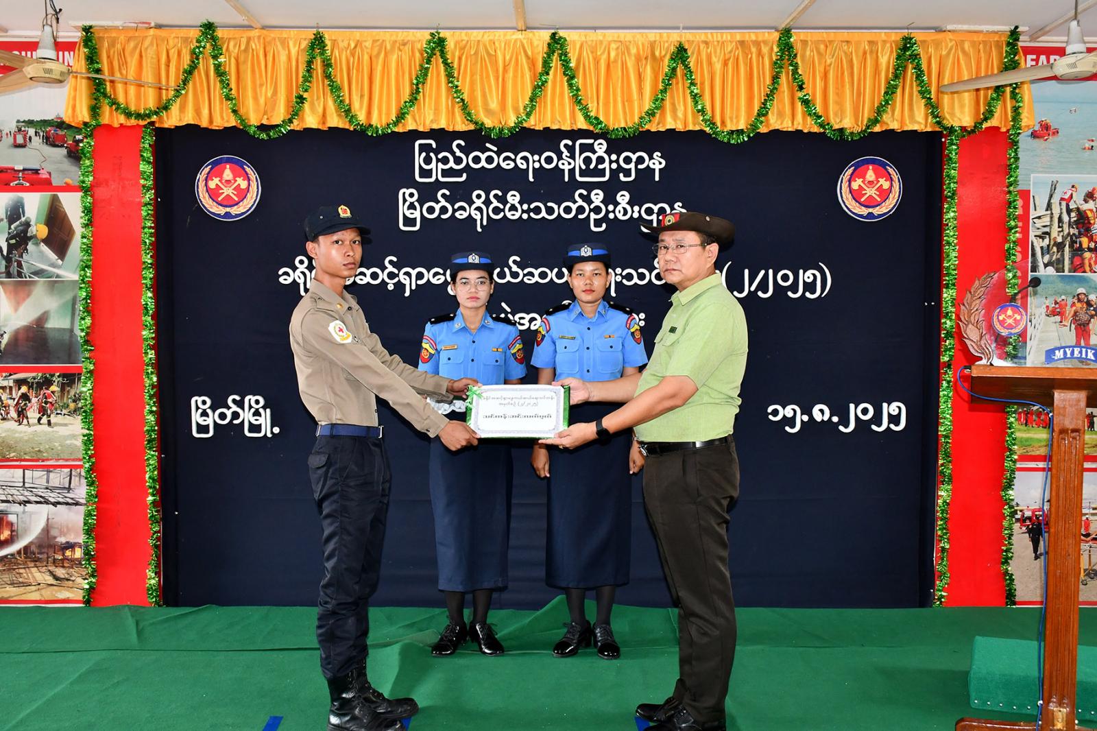 တနင်္သာရီတိုင်းဒေသကြီး မြိတ်မြို့တွင် သဘာဝဘေးအန္တရာယ်များ ဖြစ်ပွားလာပါက ပြည်သူလူထု၏ အသက်အိုးအိမ်စည်းစိမ်များကို လူမှုကယ်ဆယ်ရေးအဖွဲ့များမှ မီးသတ်ဦးစီးဌာနနှင့် ပူးပေါင်း၍ အချိန်နှင့်တပြေးညီ ကူညီကယ်ဆယ်နိုင်ရန်အတွက် ခရိုင်မီးသတ်ဦးစီးဌာန၌ ဖွင့်လှစ်လျက်ရှိသည့် ခရိုင်အဆင့် ရှာဖွေကယ်ဆယ်ရေး သင်တန်းအမှတ်စဉ် (၂/၂၀၂၅) သင်တန်းကို ယနေ့နေ့လယ်ပိုင်းက မြိတ်ခရိုင် မီးသတ်ဦးစီးဌာနရုံးခန်းမတွင် သင်တန်းဆင်းပွဲ ကျင်းပသည်။