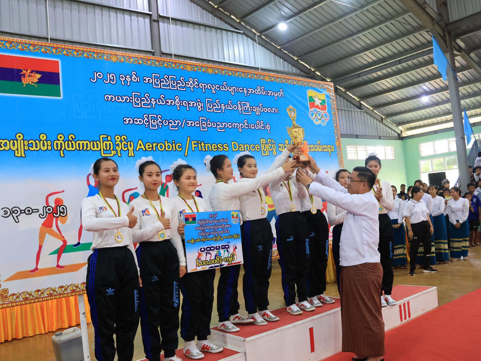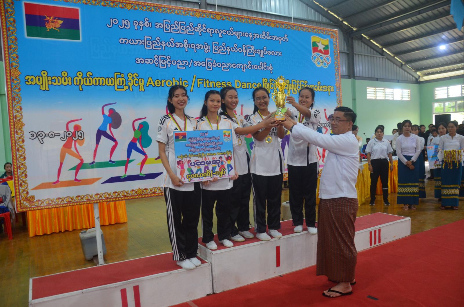 ထို့နောက် ပြည်နယ်ဝန်ကြီးချုပ်က အမျိုးသမီးကိုယ်ကာယကြံ့ခိုင်မှုလေ့ကျင့်ခန်း အေရိုးဗစ်ပြိုင်ပွဲတွင် ပထမဆုရရှိသည့် အမှတ်(၁)အခြေခံပညာအထက်တန်းကျောင်းနှင့် Fitness Dance ပြိုင်ပွဲတွင် ပထမဆုရရှိသည့် သူနာပြုနှင့်သားဖွားသင်တန်းကျောင်းအသင်းတို့အား တစ်ဦးချင်းဆုတံဆိပ်၊ ဆုဖလားနှင့် ဂုဏ်ပြုချီးမြှင့်ငွေများကို ချီးမြှင့်ပေးအပ်ခဲ့ပြီး စုပေါင်းမှတ်တမ်းတင်ဓာတ်ပုံရိုက်ကူးကာ ပြိုင်ပွဲဝင်အားကစားသမားများနှင့် ဧည့်ပရိသတ်များအား ရင်းရင်းနှီးနှီးနှုတ်ဆက်အားပေးစကားများ ပြောကြားခဲ့ကြောင်း သိရသည်။
