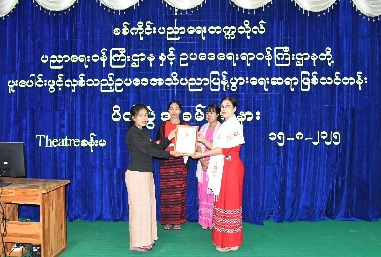 အခမ်းအနားတွင် ခရိုင်ဥပဒေအရာရှိ ဦးထွန်းလင်းက သင်တန်းပို့ချခဲ့မှု များနှင့်ပတ်သက်၍ ရှင်းလင်းပြောကြားပြီး စစ်ကိုင်းပညာရေးတက္ကသိုလ် ပါမောက္ခချုပ် ဒေါက်တာ အေးသက်သက်ဝင်းက သင်တန်းနည်းပြဆရာများအား ဂုဏ်ပြုမှတ်တမ်းလွှာများ၊ သင်တန်းသား၊ သင်တန်းသူများအား သင်တန်းဆင်းလက်မှတ်များနှင့် ဆုရရှိသူများအား