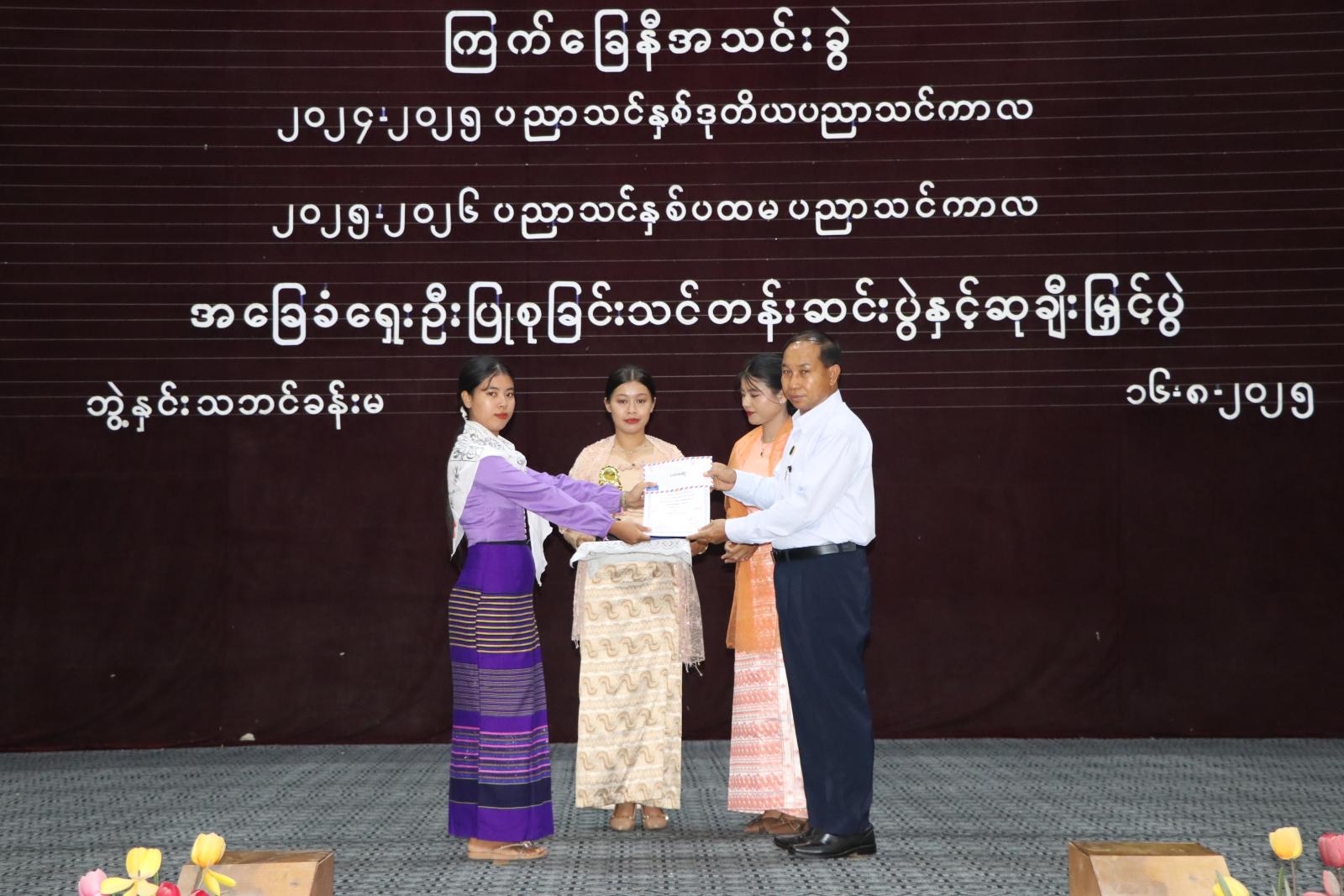ဆက်လက်၍ တိုင်းဒေသကြီး ဝန်ကြီးချုပ်က သင်တန်းတွင်ထူးချွန်ဆုရရှိကြသည့် သင်တန်းသား၊ သင်တန်းသူများအား ဂုဏ်ပြုဆုတံဆိပ်နှင့် ဂုဏ်ပြုချီးမြှင့်ငွေများ ပေးအပ်ချီးမြှင့်ခဲ့ပြီး တိုင်းဒေသကြီး လူမှုရေးရာဝန်ကြီး ဦးညွန့်ဝင်းအောင်က မုံရွာတက္ကသိုလ်အတွက် ဂုဏ်ပြုချီးမြှင့်ငွေကျပ် ၁၀ သိန်းအား ပါမောက္ခချုပ်ထံ ပေးအပ်ချီးမြှင့်သည်။
