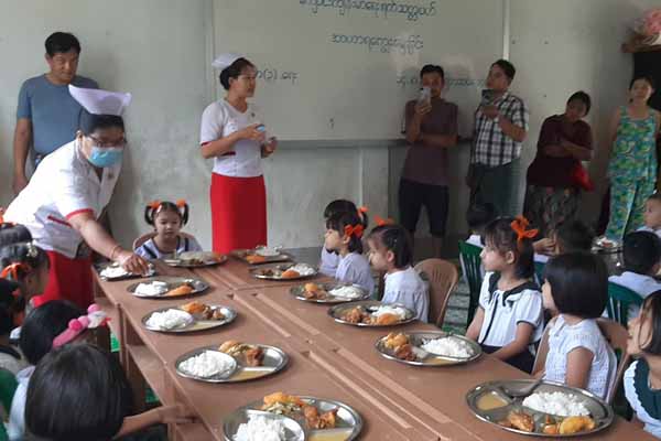ထို့အတူ ကျောင်းတွင်းအာဟာရကျွေးမွေးခြင်းကို မြို့နယ်ပြည်သူ့ကျန်းမာရေးဦးစီးဌာနမှူး ဒေါက်တာကျော်မျိုးထက်နှင့် မြို့နယ်ပညာရေးမှူး ဦးမင်းဌေးဦးတို့၏ ဦးဆောင်ကြီးကြပ်မှုဖြင့် ကျန်းမာရေးဝန်ထမ်းများ၊ ဆရာ၊ ဆရာမများက KG တန်း ကလေးငယ် ၇၂ ဦးတို့အား အစာအုပ်စုသုံးအုပ်စုတွင်ပါဝင်သည့် ကျန်းမာရေးနှင့်ညီညွတ်သော နေ့လယ်စာ အာဟာရနှင့် အာဟာရမှုန့်ဖြည့်စွက်ကျွေးမွေးခြင်းတို့ကို ဆောင်ရွက်သည်။ ရေးမြို့နယ်အနေဖြင့် ကျောင်းတွင်းအာဟာရကျွေးမွေးခြင်းကို ကျန်ရှိသည့် အခြေခံပညာကျောင်းများတွင် ဆက်လက်ဆောင်ရွက်သွားမည်ဖြစ်ကြောင်း သိရသည်။