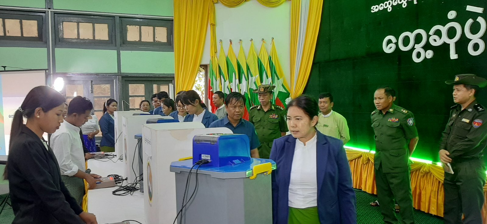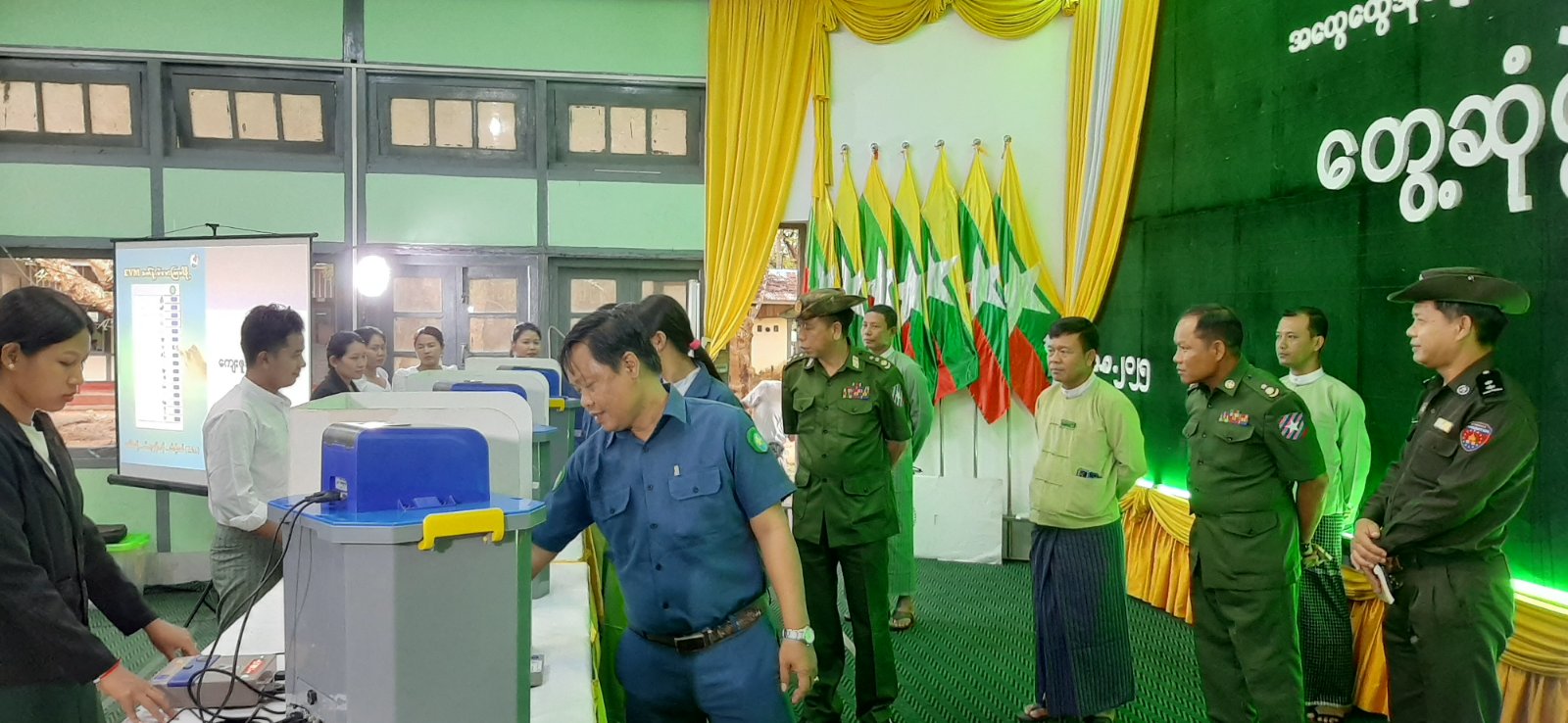 ၂၀၂၅ ခုနှစ်၊ ဒီဇင်ဘာလတွင် ကျင်းပပြုလုပ်မည့် ပါတီစုံဒီမိုကရေစီအထွေထွေရွေးကောက်ပွဲ အောင်မြင်စွာကျင်းပနိုင်ရေး ဆန္ဒမဲပေးရာတွင်အသုံးပြုမည့် မြန်မာအီလက်ထရောနစ်မဲပေးစက်ဖြင့် ဆန္ဒမဲပေးခြင်း အစမ်းလေ့ကျင့်သရုပ်ပြမှုကို ယနေ့နံနက်ပိုင်းက မွန်ပြည်နယ်၊ ရေးမြို့နယ် အထွေထွေအုပ်ချုပ်ရေးဦးစီးဌာနရုံး အစည်းအဝေးခန်းမ၌ ကျင်းပသည်။
