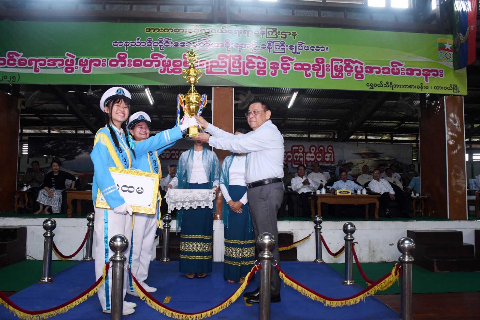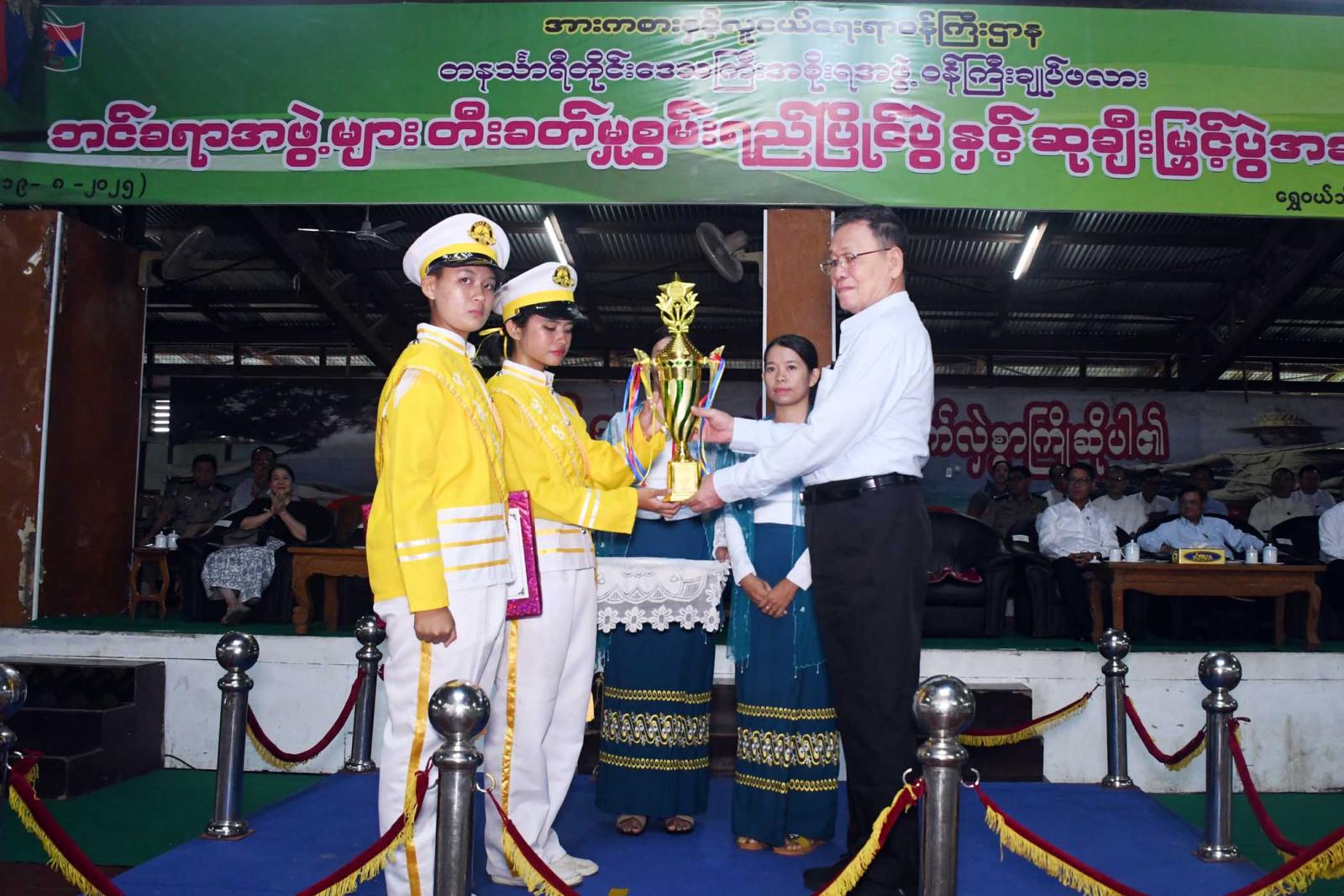 ထို့နောက် ဆုချီးမြှင့်ပွဲအခမ်းအနားကို ဆက်လက်ကျင်းပရာ တိုင်းဒေသကြီးလူမှုရေးရာဝန်ကြီး ဦးသက်နိုင်က နှစ်သိမ့်ဆုရရှိသည့် ထားဝယ်ပညာရေးဒီဂရီကောလိပ်ဘင်ခရာအဖွဲ့၊ တိုင်းဒေသကြီးစီးပွားရေးရာဝန်ကြီး ဦးမောင်ကြီးက တတိယဆုရရှိသည့် အမှတ်(၃) အခြေခံပညာအထက်တန်းကျောင်း ဘင်ခရာအဖွဲ့နှင့် တိုင်းဒေသကြီးတရားလွှတ်တော်တရားသူကြီးချုပ် ဒေါ်ပိုက်ပိုက်အေးက ဒုတိယဆုရရှိသည့် အမှတ်(၂)အခြေခံပညာအထက်တန်းကျောင်း ဘင်ခရာအဖွဲ့တို့ကို ဆုများပေးအပ်ချီးမြှင့်သည်။ ထို့နောက် တိုင်းဒေသကြီး ဝန်ကြီးချုပ်က ပထမဆုရရှိသည့် အမှတ်(၁)အခြေခံပညာအထက်တန်းကျောင်းဘင်ခရာအဖွဲ့ကို တံခွန်စိုက်ဆုဖလားနှင့် ဆုကြေးငွေများပေးအပ်ချီးမြှင့်ကြောင်း သိရသည်။
