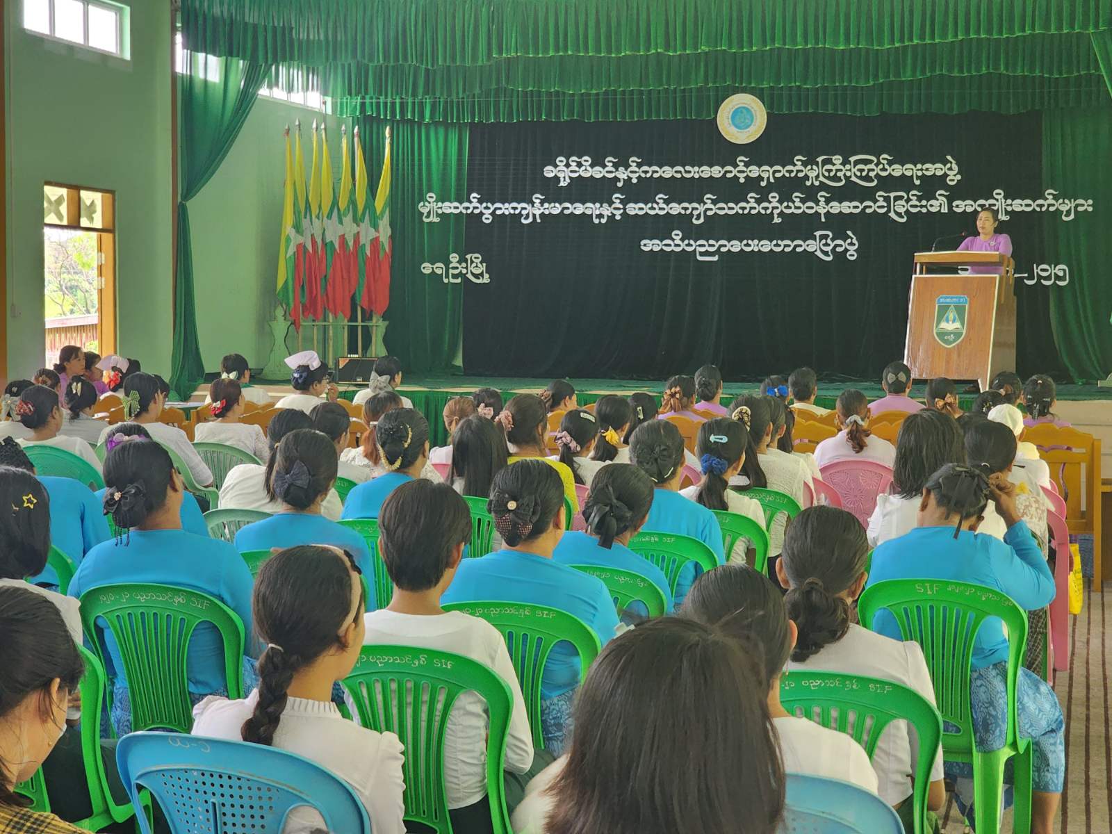 ရှေးဦးစွာ မြို့နယ်မိခင်နှင့်ကလေးစောင့်ရှောက်ရေးအသင်းဥက္ကဋ္ဌ ဒေါ်မျိုးမျိုးထိုက်က အမှာစကားပြောကြားပြီး မြို့နယ်ပြည်သူ့ကျန်းမာရေးဦးစီးဌာနမှ သားဖွားဆရာမ ဒေါ်သိမ်မွေ့ခင်က ဆယ်ကျော်သက်ကိုယ်ဝန်ဆောင်ခြင်း၏အကျိုးဆက်များအကြောင်းကို အသိပညာပေးဟောပြောရာတွင် အသက် ၁၃ နှစ်မှ ၁၈ နှစ်အတွင်း ကိုယ်ဝန် မဆောင် သင့်ပါကြောင်း၊ စိတ်ပိုင်းဆိုင်ရာ၊ ရုပ်ပိုင်းဆိုင်ရာခံစားမှုများ ကြုံတွေ့ရနိုင်ပါကြောင်း၊ ပညာရေးမှာထိခိုက်နိုင်ပါကြောင်း၊ သားအိမ်ခေါင်းကင်ဆာရောဂါဖြစ်ပွားတတ်ပါကြောင်းနှင့်ဆယ်ကျော်သက်များ ကိုယ်ဝန်ဆောင်ပါက အန္တရာယ်ရှိပါကြောင်း အကျယ်တဝင့် ရှင်းလင်းပြောကြားခဲ့သည်။