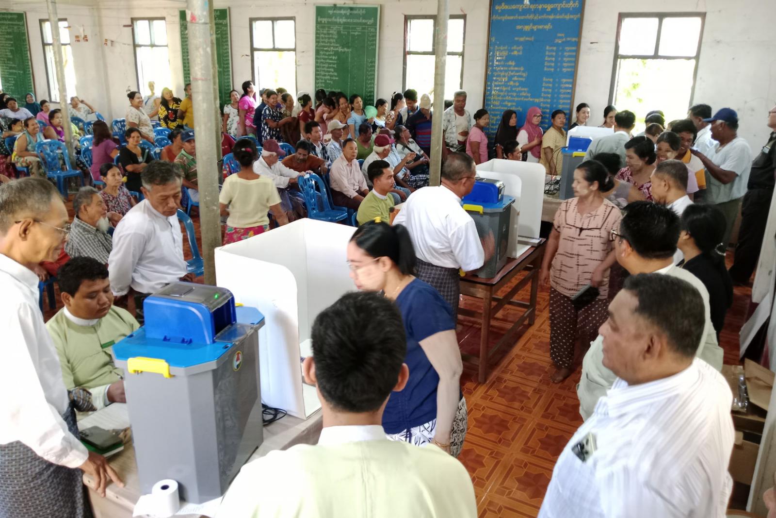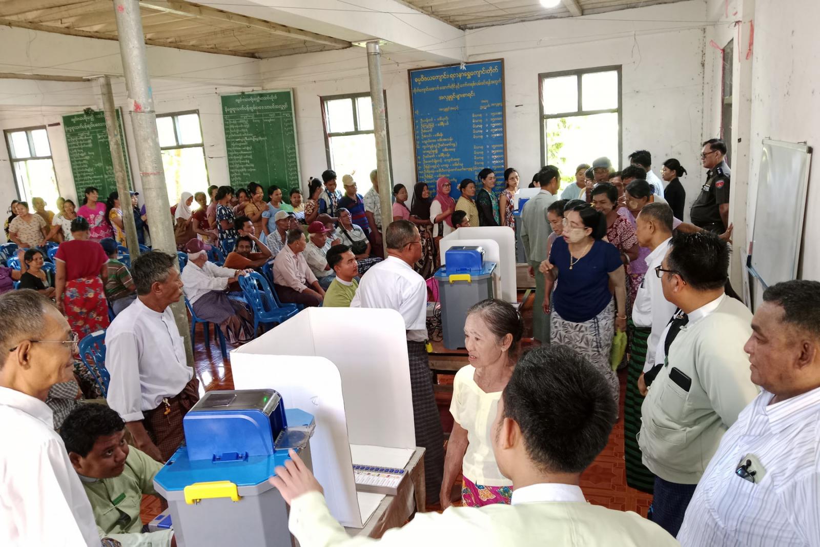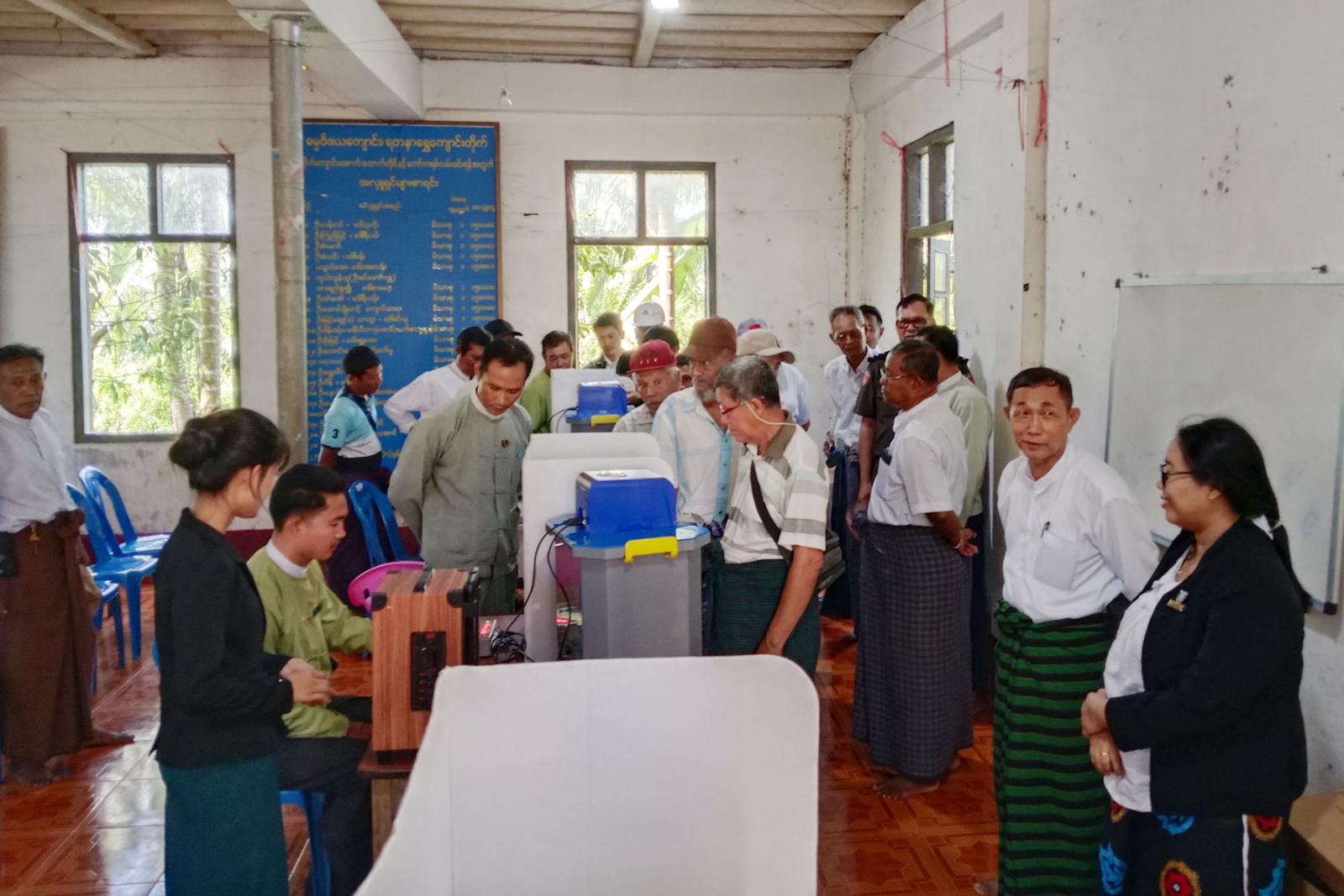 ဘုတ်ပြင်းမြို့ဒေသခံပြည်သူများအား မြန်မာအီလက်ထရောနစ်မဲပေးစက်ဆိုင်ရာ အသိပညာပေးသရုပ်ပြ