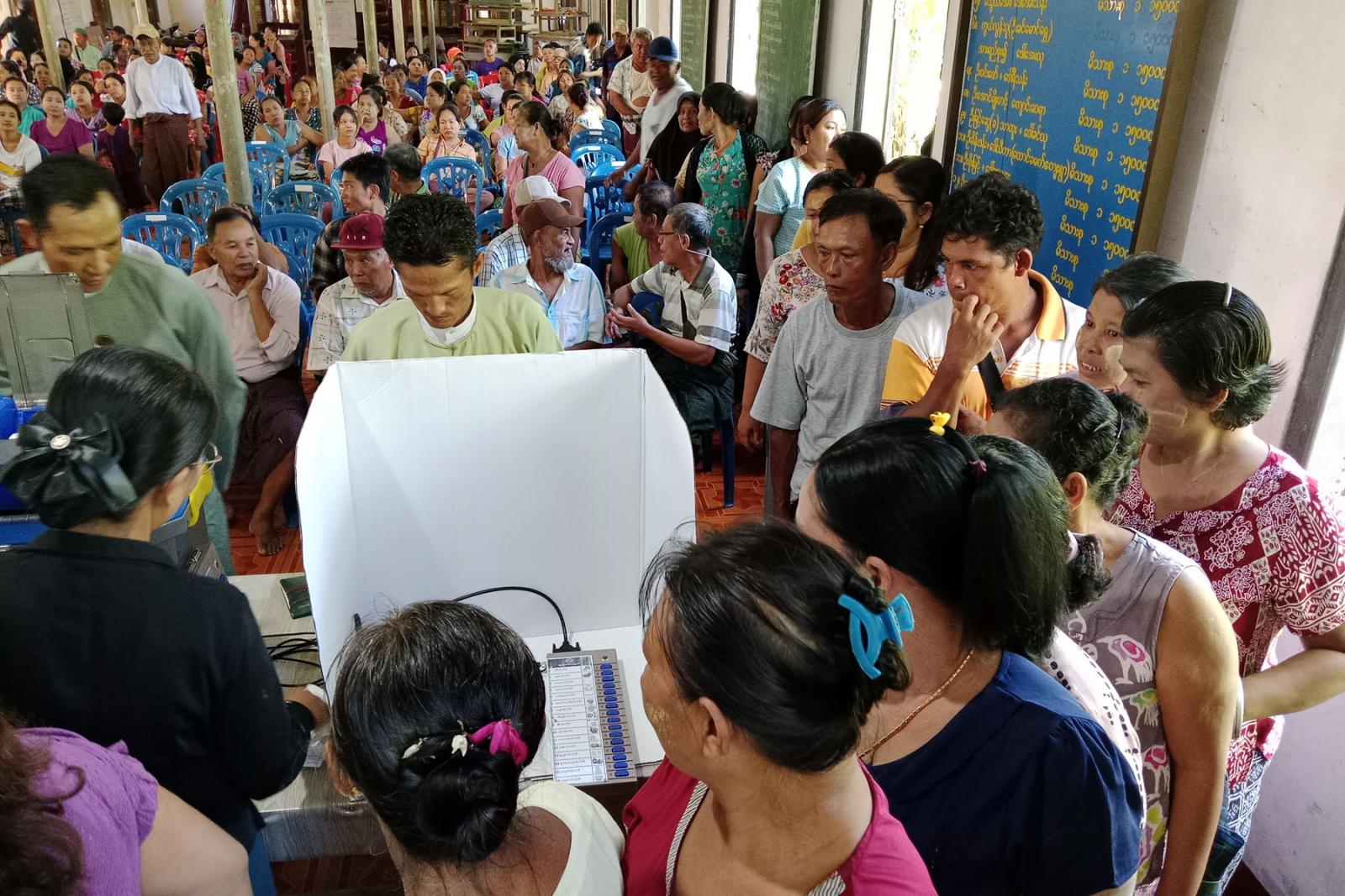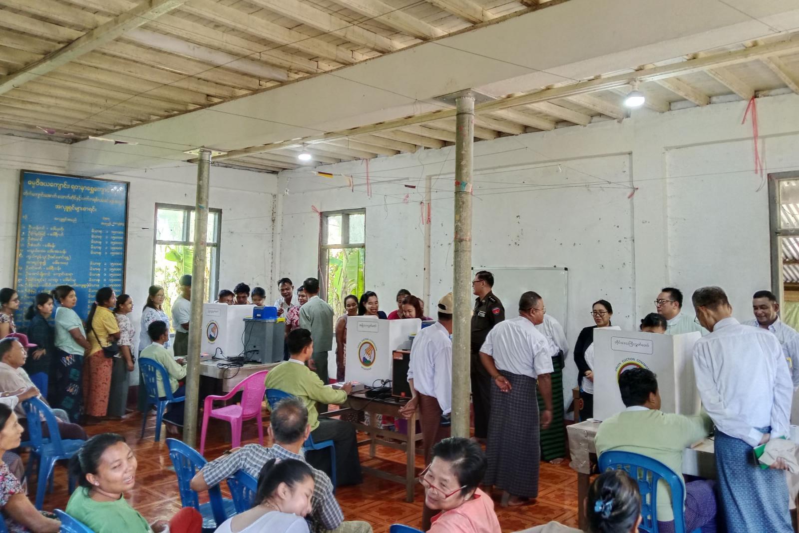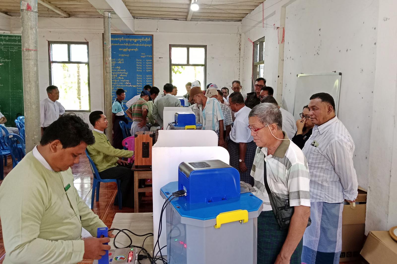 ဘုတ်ပြင်းမြို့ဒေသခံပြည်သူများအား မြန်မာအီလက်ထရောနစ်မဲပေးစက်ဆိုင်ရာ အသိပညာပေးသရုပ်ပြ