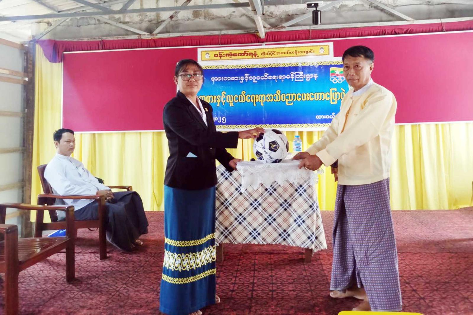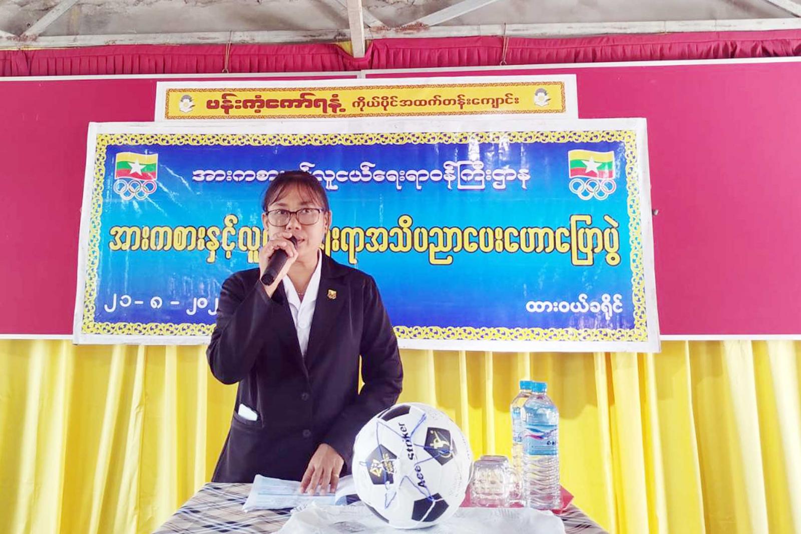 ထို့နောက် ခရိုင်အားကစားနှင့်ကာယပညာဦးစီးဌာန၊ လက်ထောက်ညွှန်ကြားရေးမှူး ဒေါ်စပယ်သွင် က “ယနေ့လူငယ် နောင်ဝယ်လူကြီးဆိုသကဲ့သို့ နောင်ကျရင်နယ်ပယ်အသီးသီး၌ ဦးစီးဦးဆောင်ပြုရမည့်သူများဖြစ်ကြောင်း၊ နိုင်ငံတော်အစိုးရအနေဖြင့် လူငယ်များကို တန်ဖိုးရှိသော လူသားအရင်းအနှီးများအဖြစ် မျှော်မှန်းပြီးပြုစုပျိုးထောင်ပေးလျက်ရှိကြောင်း၊ လူငယ်များကိုယ်တိုင် ကလည်း မိမိကိုယ်မိမိတန်ဖိုးရှိသောလူသားများဖြစ်အောင်ကျင့်ကြံကြိုးကုတ် အားထုတ်ကြရန်လိုအပ်ကြောင်း၊ ကျောင်းသားလူငယ်များအနေဖြင့် အားကစားအားလေ့လာလိုက်စားကြရန်လိုအပ်ကြောင်း၊ ပြောကြားပြီးအားကစား ပစ္စည်းများပေးအပ်ရာ တာဝန်ရှိသူတစ်ဦးက လက်ခံရယူခဲ့ ကြောင်းသိရသည်။
