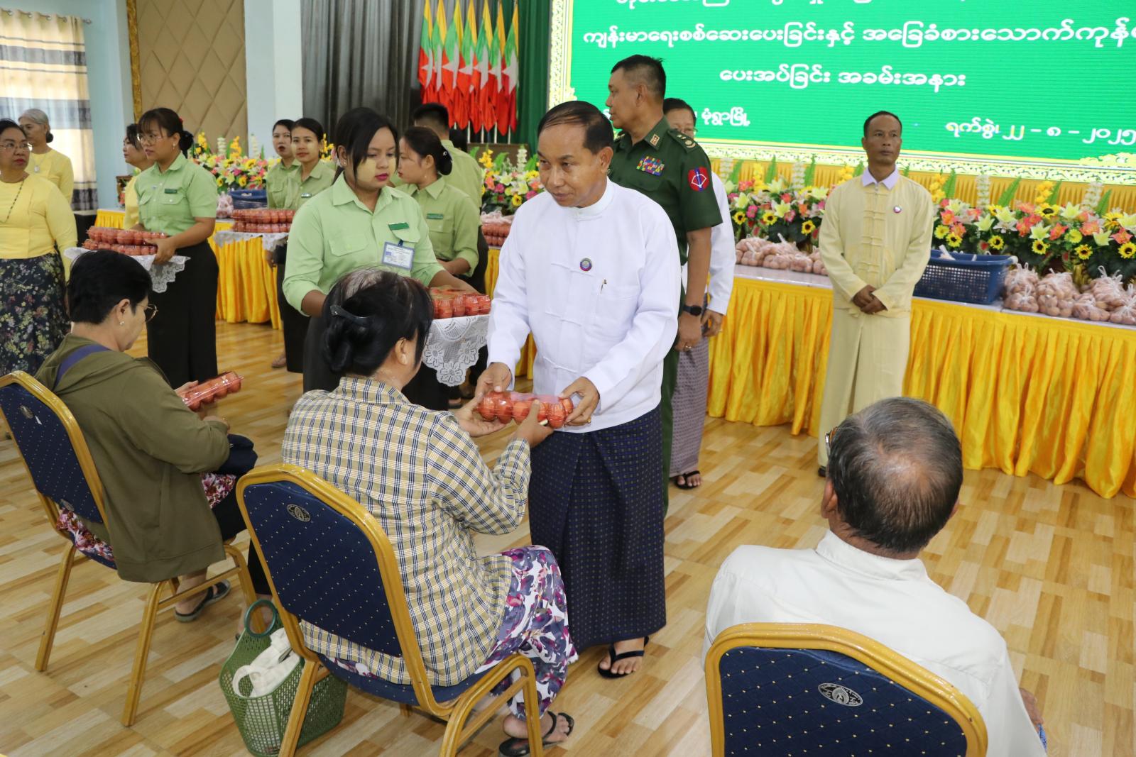 ဦးစွာ အခမ်းအနားသို့ တက်ရောက်လာကြသည့် အငြိမ်းစားဝန်ထမ်းများအား နံနက်စာကော်ဖီနှင့်မုန့်များဖြင့် ဧည့်ခံကျွေးမွေးခဲ့ကြပြီး တိုင်းဒေသကြီးဝန်ကြီးချုပ် ဦးမြတ်ကျော်နှင့် ဇနီး၊ တိုင်းဒေသကြီး တရားသူကြီးချုပ်နှင့်ဇနီး၊ တိုင်းဒေသကြီးအစိုးရအဖွဲ့ဝင်များနှင့်ဇနီးများက တိုင်းဒေသကြီးအတွင်းရှိ ဌာနဆိုင်ရာအသီးသီးမှ အငြိမ်းစားဝန်ထမ်းများအား ရင်းရင်းနှီးနှီး လိုက်လံမိတ်ဆက်စကားများပြောကြားကာ တာဝန်ရှိသူများနှင့်အတူ အငြိမ်းစားဝန်ထမ်း ၆၅၀ ဦးအား အဟာရဖြည့်စွက်စာ ကြက်ဥများအား လက်ရောက်ပေးအပ်ခဲ့ကြသည်။