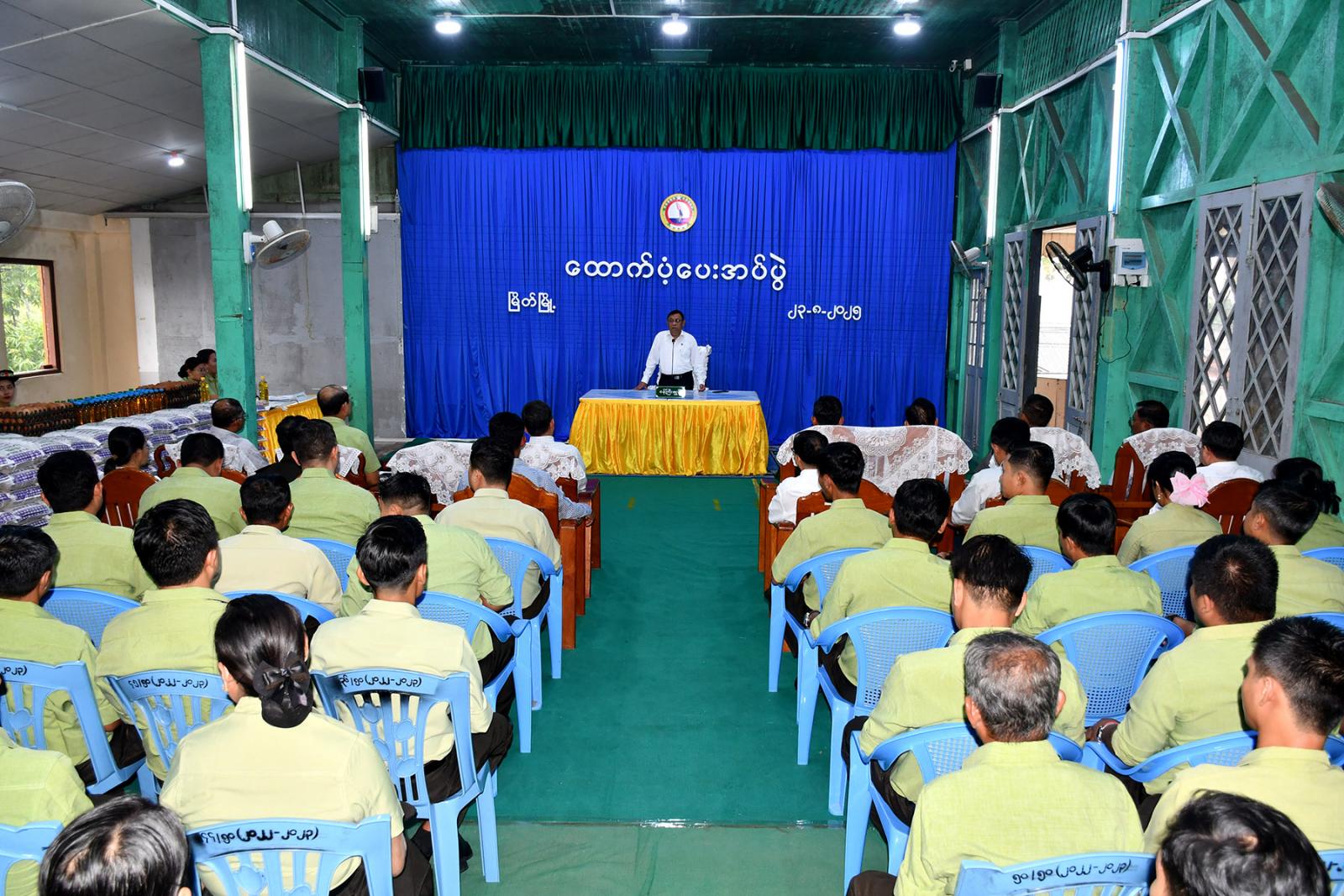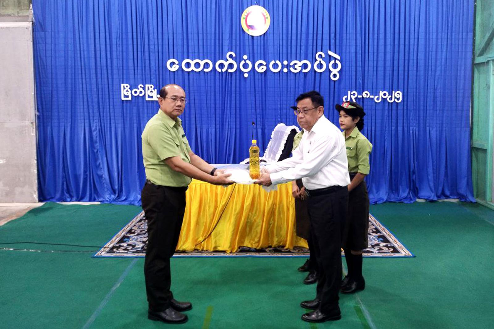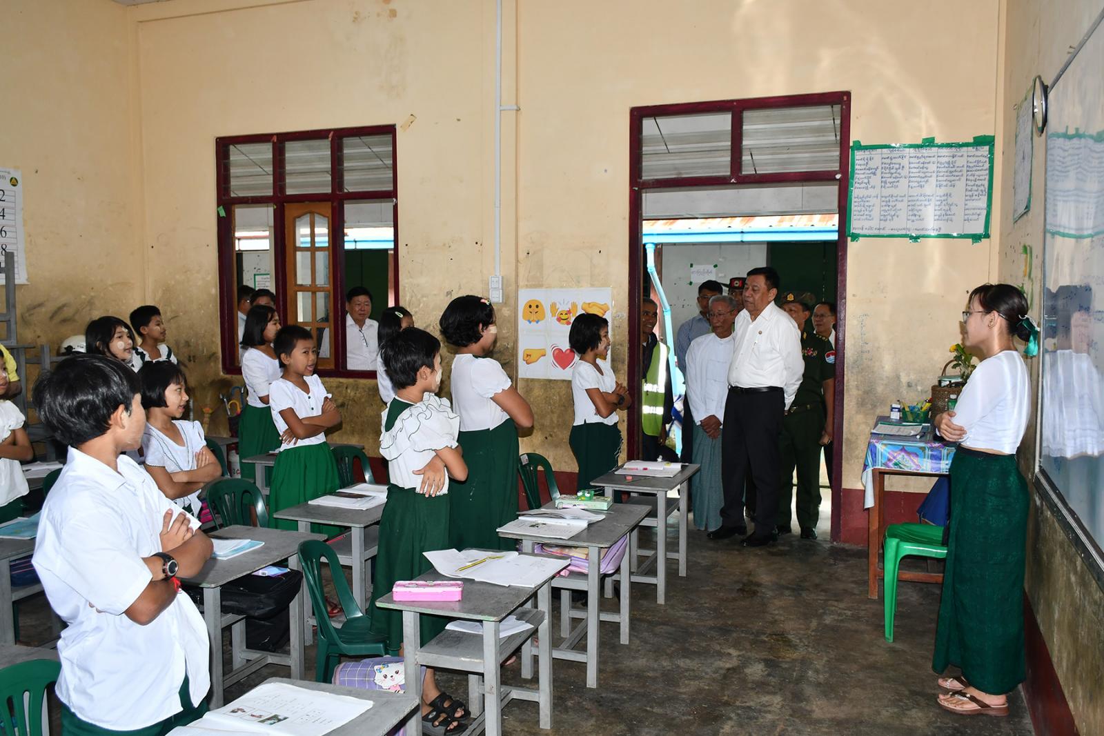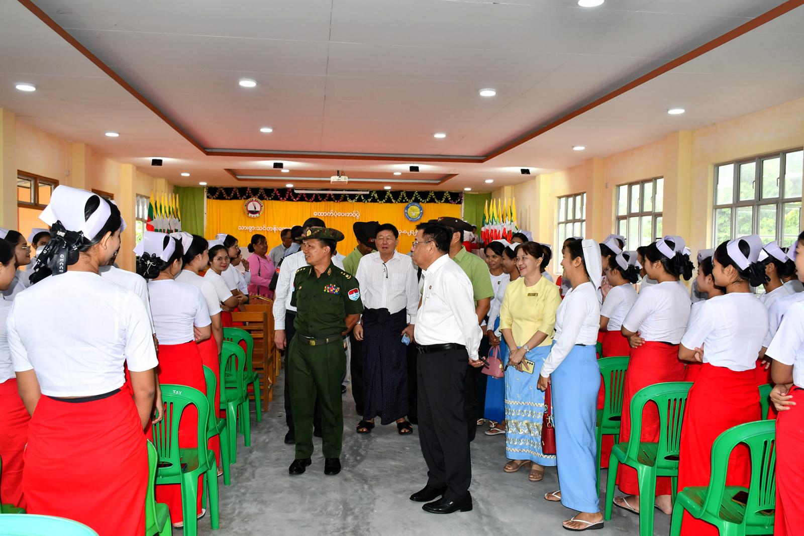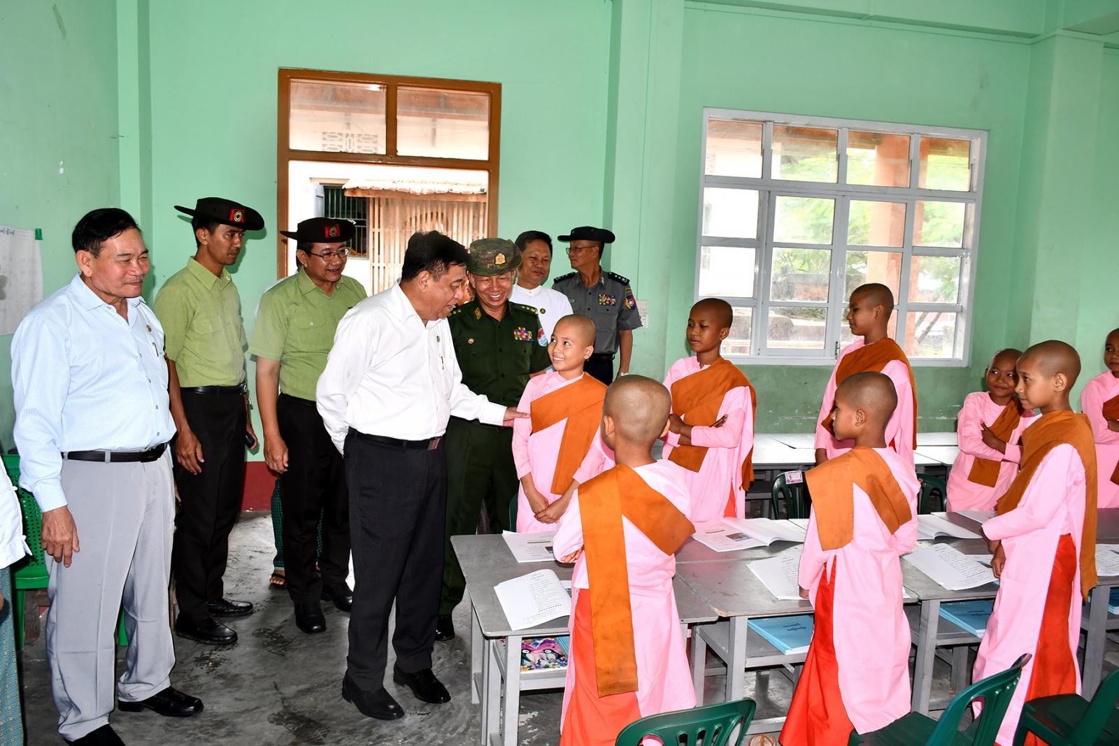 ထို့နောက် တိုင်းဒေသကြီးဝန်ကြီးချုပ်က သင်တန်းသူများအတွက် ဆန်များပေးအပ်ရာ သင်တန်းကျောင်း ကျောင်းအုပ်နှင့်သင်တန်းသူများက လက်ခံရယူကြသည်။ ဆက်လက်၍ ဝန်ကြီးချုပ်နှင့်အဖွဲ့သည် သင်တန်းသူများအား ရင်းရင်းနှီးနှီးတွေ့ဆုံပြီး သင်တန်းကျောင်းအတွက် လိုအပ်သည်များ ပေါင်းစပ်ညှိနှိုင်းဆောင်ရွက်ပေးသည်။ ထိုမှတစ်ဆင့် ကျောင်းပြင်ပမူလတန်း အလယ်တန်းပညာရေး သင်ကြားသင်ယူမှုများ ဆောင်ရွက်နေသည့် အ.လ.က(၉) ဘုရားကိုင်ကျောင်း သင်ကြားရေးစခန်းသို့ ရောက်ရှိကြသည်။