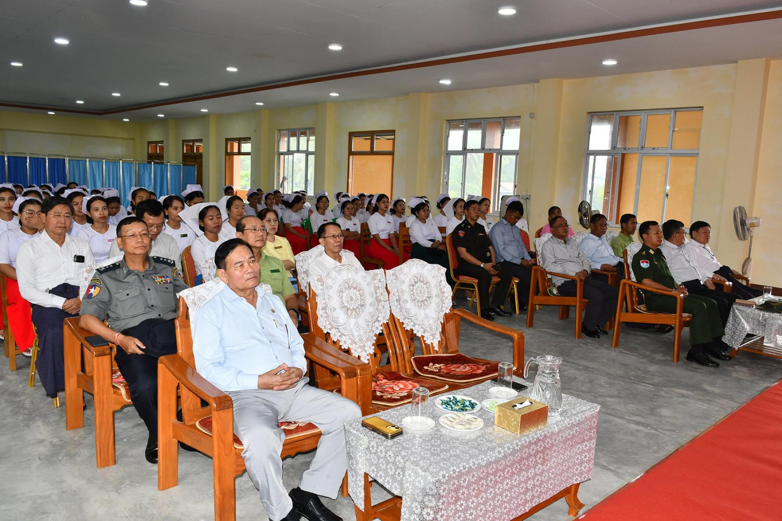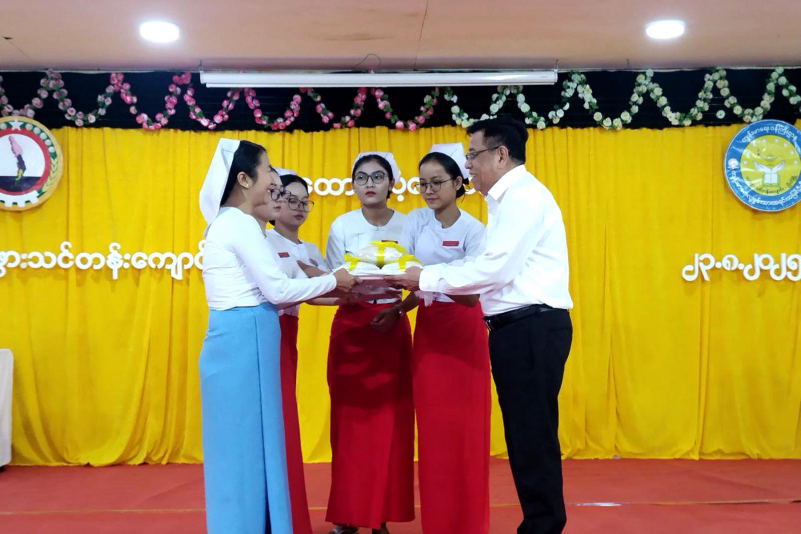 ထို့နောက် သားဖွားသင်တန်းကျောင်း(မြိတ်) သို့ရောက်ရှိကြပြီး ဝန်ကြီးချုပ်ဦးမြတ်ကိုက သင်တန်းသူများ ကျောင်းဆင်းပြီး မိမိဒေသရပ်ရွာပြန်ရောက်သည့်အခါ ပြည်သူများ၏ ကျန်းမာရေးစောင့်ရှောက်ပေးမှုသည် အင်မတန်တန်ဖိုးရှိကြောင်း၊ ဆေးရုံဆေးခန်းနှင့်ဝေးလံသည့်ဒေသတွင် သားဖွားဆရာမများ၏ အခန်းကဏ္ဍသည် အင်မတန်အရေးကြီးကြောင်း၊ သင်တန်းသူများအနေဖြင့် သင်တန်းတွင် အကောင်းဆုံးဖြစ်အောင် ကြိုးစားသင်ယူလေ့လာမှတ်သားကြဖို့လိုအပ်ကြောင်း၊ သင်တန်းပြီးလို့ တာဝန်ထမ်းဆောင်သည့် ဒေသတွင် ကလေးသူငယ်ကျန်းမာရေးစောင့်ရှောက်မှုလုပ်ငန်း၊ ကိုယ်ဝန်ဆောင်မိခင်စောင့် ရှောက်မှုလုပ်ငန်း၊ ကလေးများကာကွယ်ဆေး ထိုးသည့်လုပ်ငန်းနှင့် ဒေသခံများ၏ ကျန်းမာရေးစောင့်ရှောက်မှု လုပ်ငန်းများကို ဆောင်ရွက်ကြရမည်ဖြစ်သည့်အတွက် ဘာသာရပ်များကို ကျွမ်းကျင်အောင်လေ့လာဖို့လိုအပ်ကြောင်း ပြောကြားသည်။