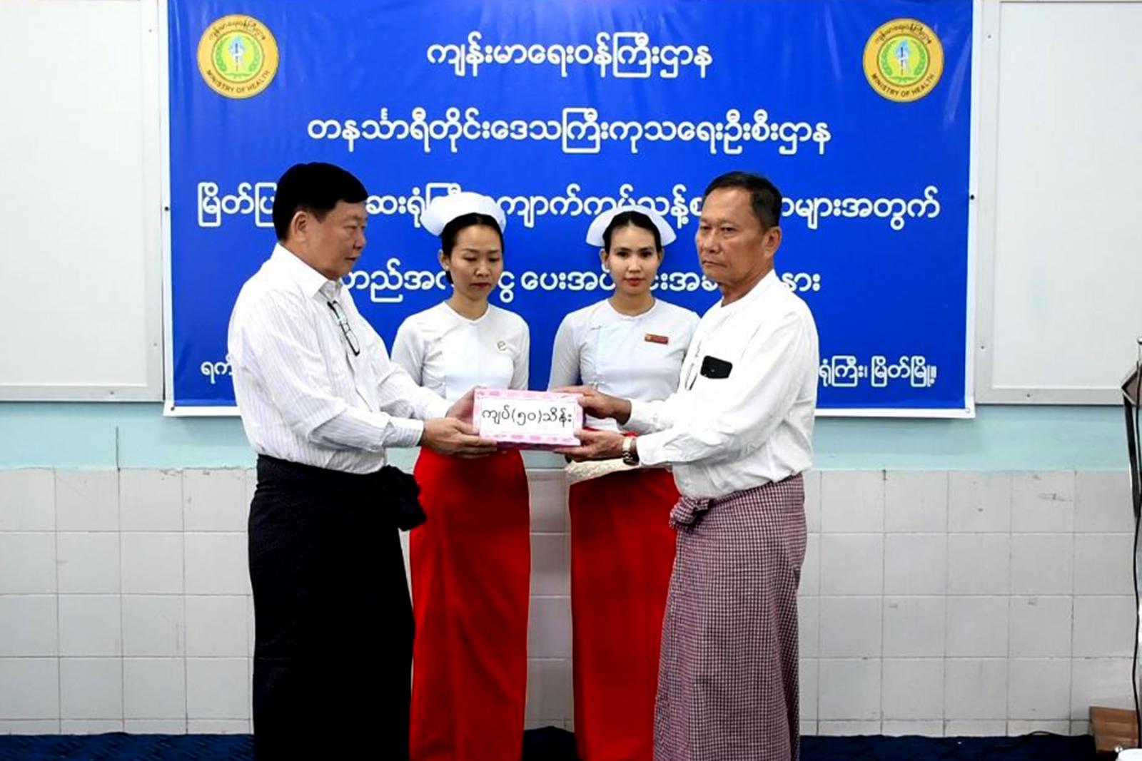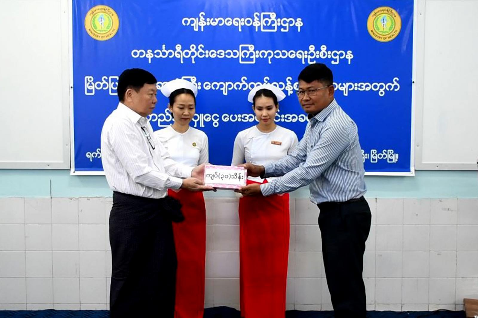 တနင်္သာရီတိုင်းဒေသကြီး ဝန်ကြီးချုပ် ဦးမြတ်ကိုသည် ကမ်းရိုးတန်းဒေသတိုင်းစစ်ဌာနချုပ် တိုင်းမှူး ဗိုလ်ချုပ်ကျော်ကျော်ဟန်၊ တိုင်းဒေသကြီးဝန်ကြီးများ၊ ဌာနဆိုင်ရာတာဝန်ရှိသူများနှင့်အတူ ယမန်နေ့က မြိတ်ပြည်သူ့ဆေးရုံ အစည်းအဝေးခန်းမတွင် ကျောက်ကပ်ရောဂါ ဝေဒနာရှင် ပြည်သူများနှင့် ကျောက်ကပ်ဆေးရမည့် ဝေဒနာရှင်များ အဘက်ဘက်မှ ဆေးကုသမှု အဆင်ပြေစေရေးအတွက် မတည်အလှူငွေပေးအပ်ပွဲသို့ တက်ရောက်ကြသည်။