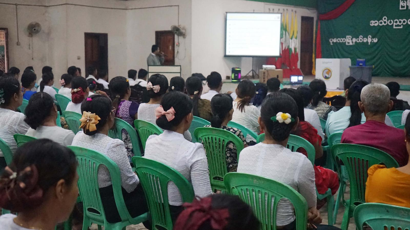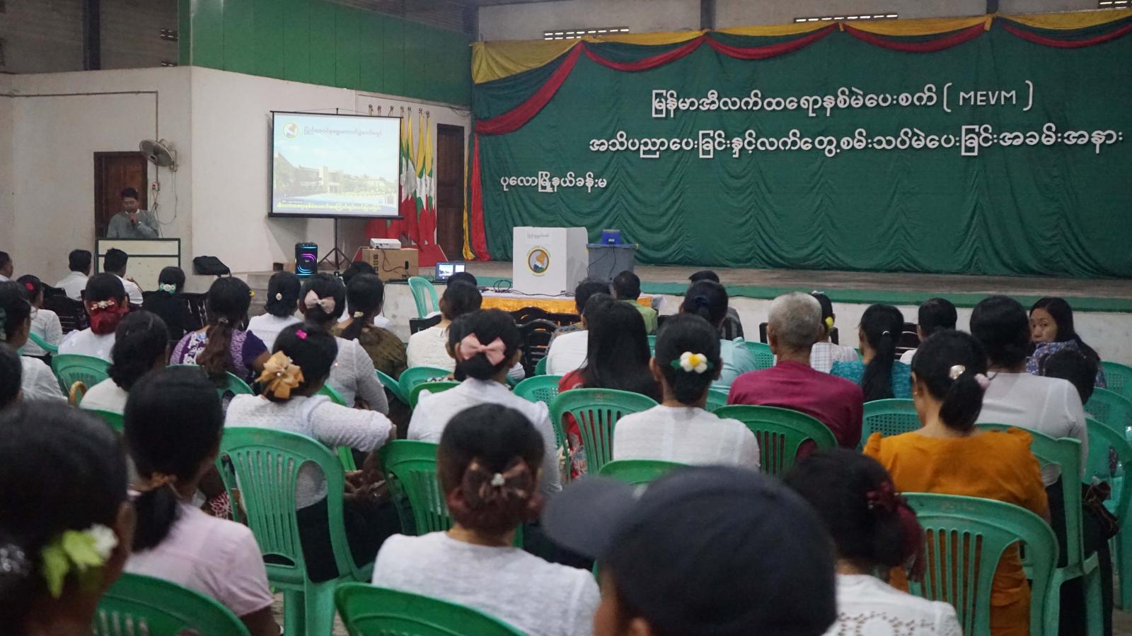 ထိုသို့ အသိပညာပေးဆောင်ရွက်ရာတွင် မြို့နယ်စီမံခန့်ခွဲရေးနှင့် အုပ်ချုပ်ရေးကော်မတီဥက္ကဋ္ဌ ဦးဇော်မင်းက မဲဆန္ဒရှင်ပြည်သူများအနေဖြင့် မြန်မာအီလက်ထရောနစ် (MEVM) မဲပေးစက် အသုံးပြု၍ မဲပေးပုံအဆင့်ဆင့်ကို ပြည်သူများ ကျယ်ကျယ်ပြန့်ပြန့် သိရှိနိုင်ရေး ရည်ရွယ်၍ အသိပညာပေးဆောင်ရွက်ပေးရခြင်းဖြစ်ကြောင်း၊ မြို့နယ်ရွေးကောက်ပွဲကော်မရှင်အဖွဲ့ခွဲရုံး၊ ရွေးကောက်ပွဲအရာရှိ ဦးကျော်လွင်က မြန်မာအီလက်ထရောနစ် (MEVM) စနစ်ဖြင့် အသုံးပြု၍ မဲပေးရခြင်း၏ ရည်ရွယ်ချက်၊ မဲပေးစက်ဖွဲ့စည်းတည်ဆောက်ပုံနှင့် ပါဝင်သည့် ဆက်စပ်ပစ္စည်းများ၊ မဲပေးစက်များကို ကိုင်တွယ်အသုံးပြုခြင်း၊ မဲရလဒ်များ၊ မဲပေးစက် အသုံးပြုခြင်း၏ အကျိုးကျေးဇူးများကို ရှင်းလင်းပြောကြားခဲ့သည်။