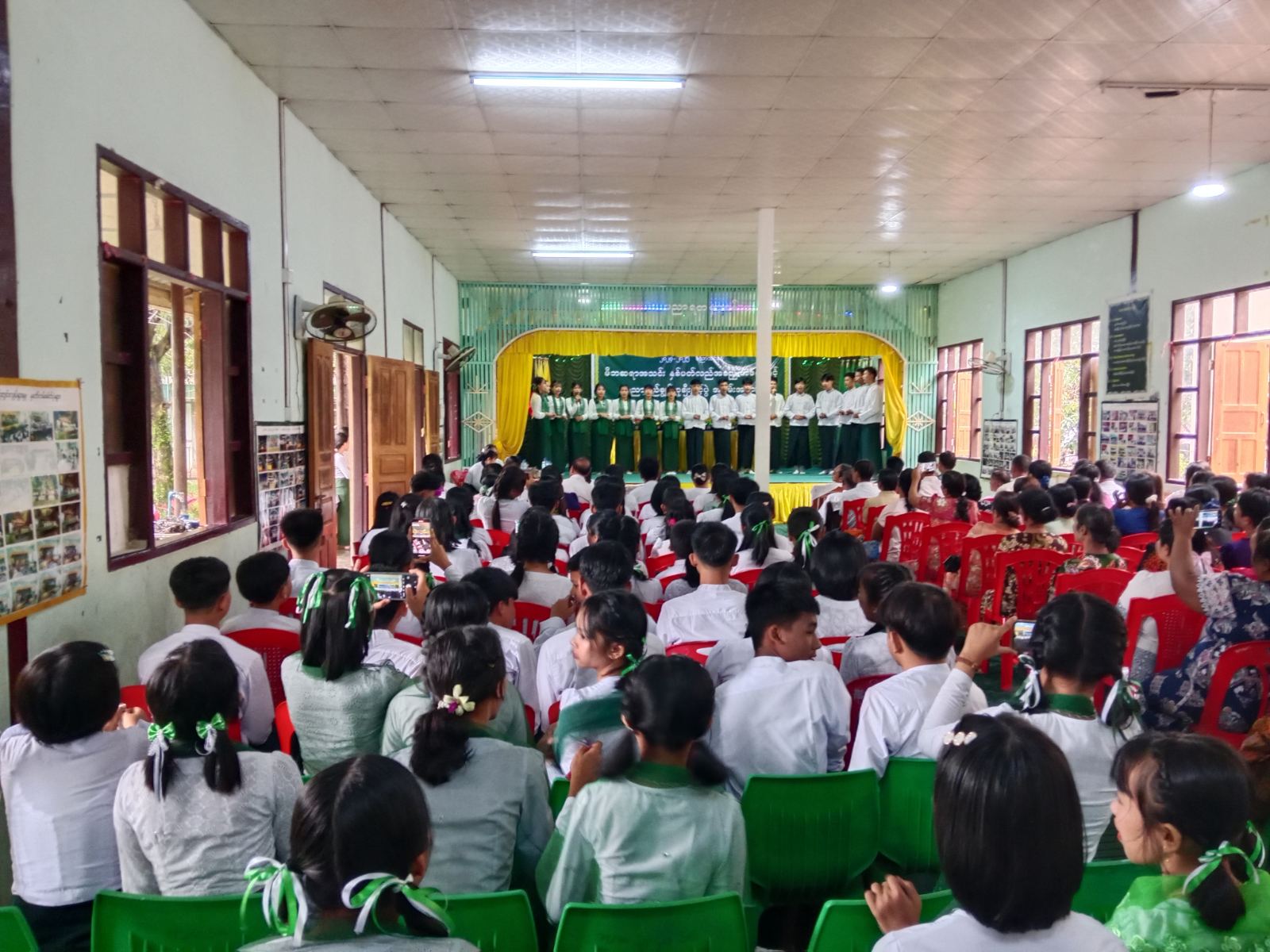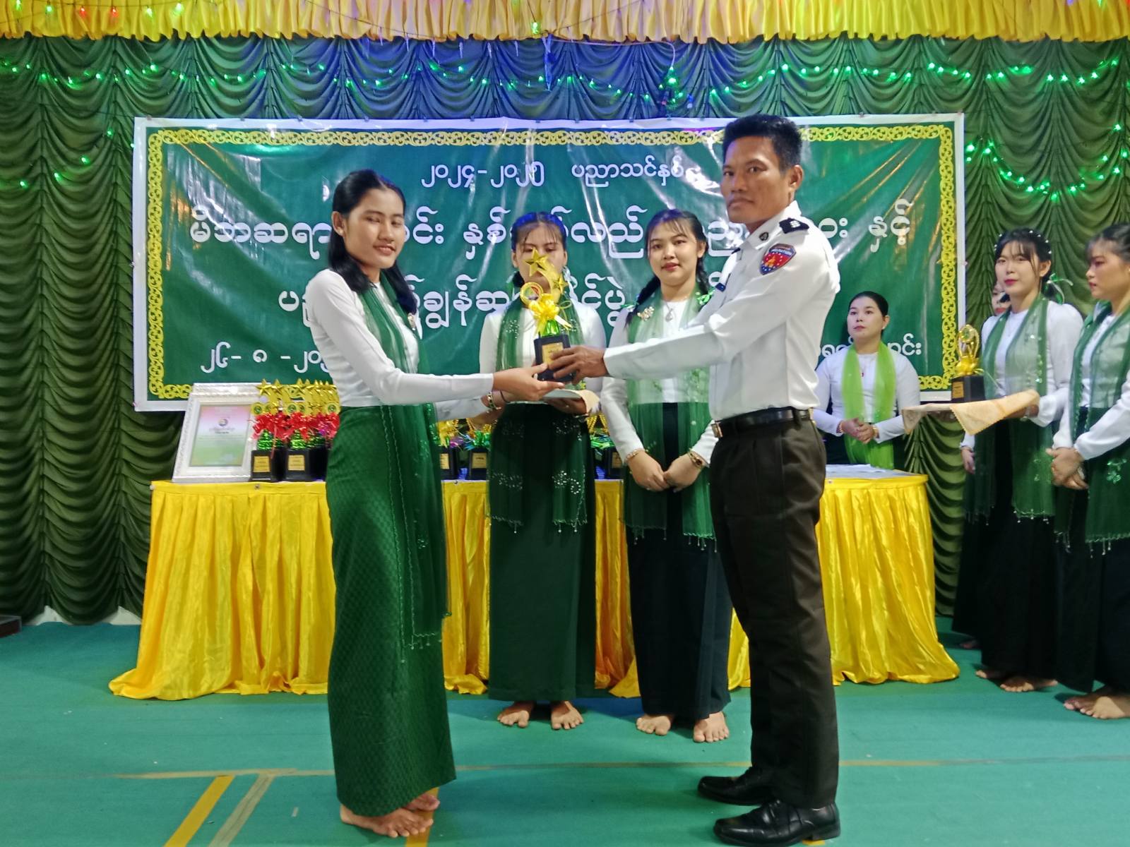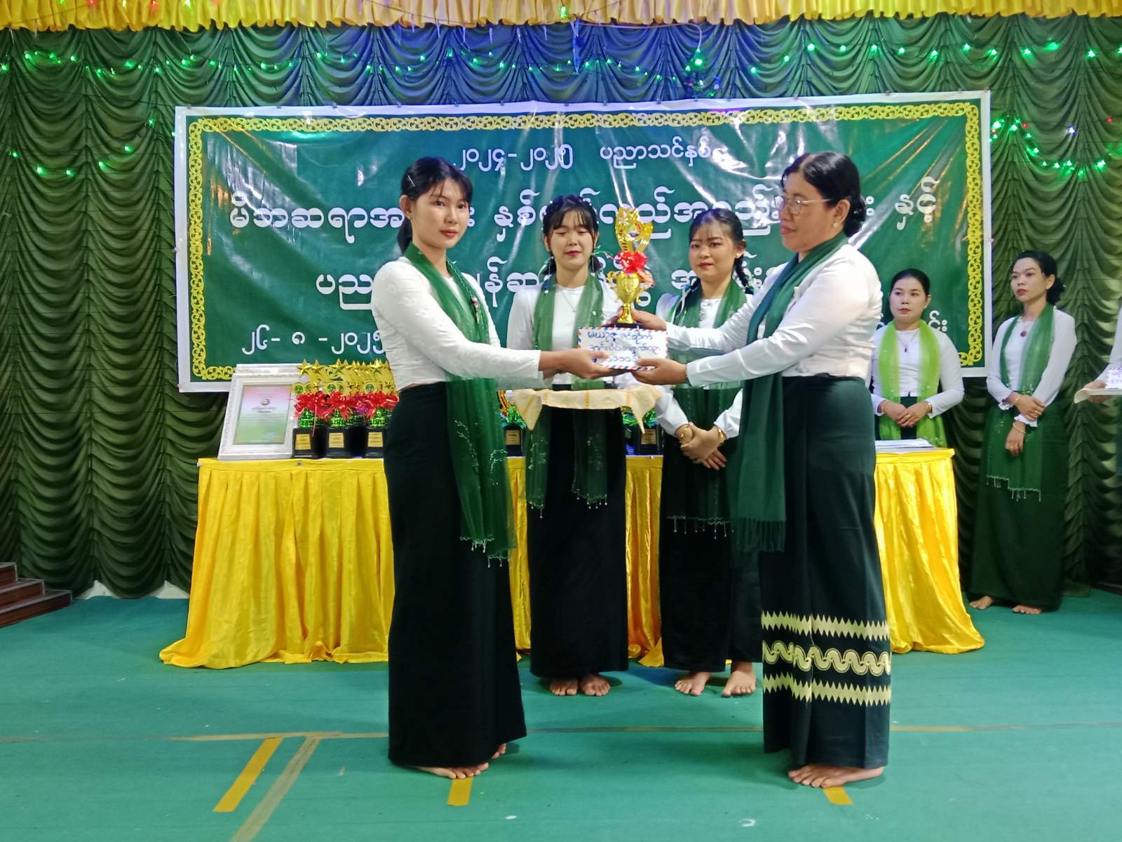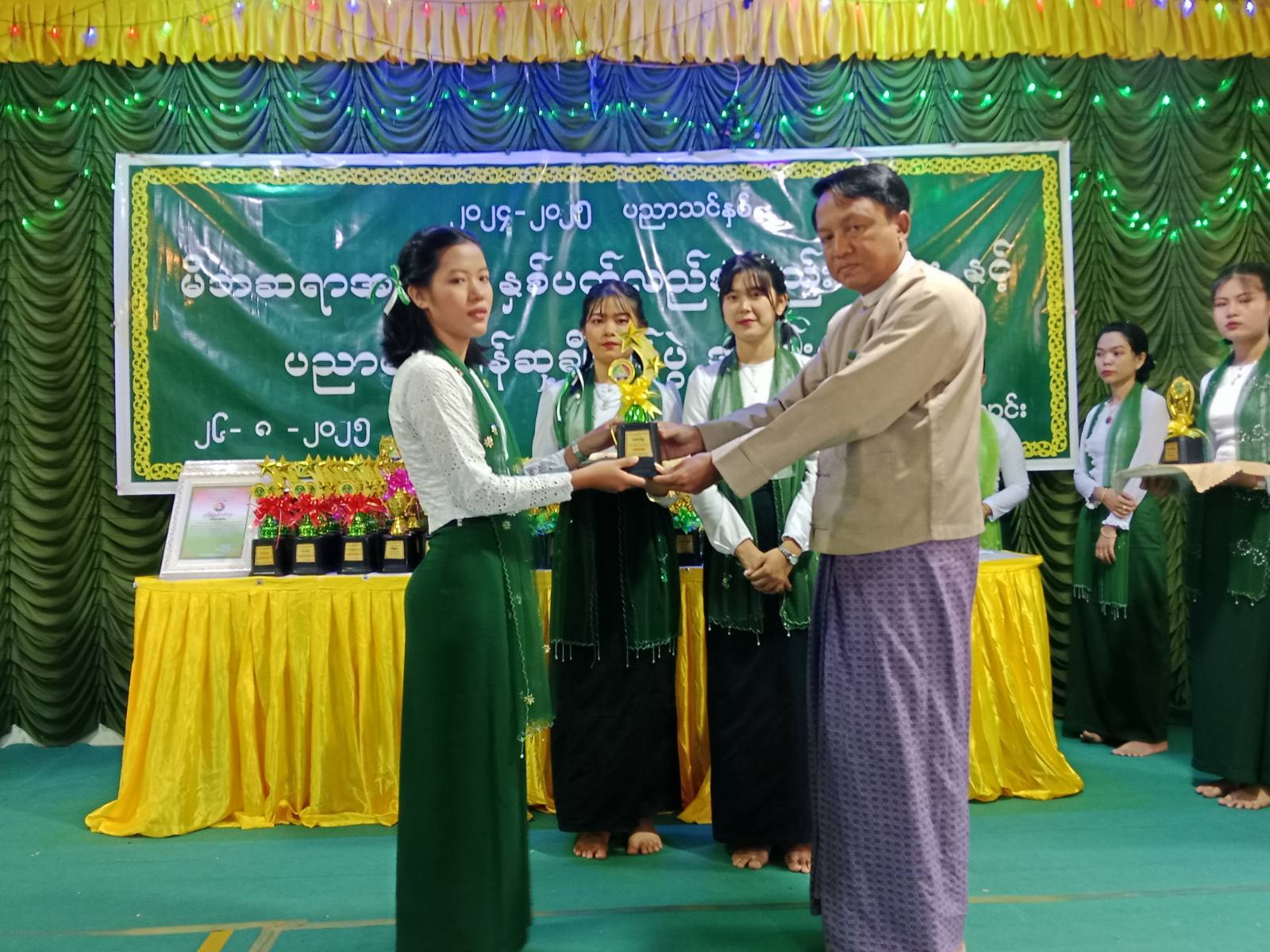 ထို့နောက် မြို့နယ်စီမံခန့်ခွဲရေးနှင့် အုပ်ချုပ်ရေးကော်မတီဥက္ကဋ္ဌနှင့် တာဝန်ရှိသူများက ၂၀၂၄-၂၀၂၅ ပညာသင်နှစ်တွင် တက္ကသိုလ်ဝင်စာမေးပွဲကို ထူးချွန်စွာအောင်မြင်ခဲ့သော ဂုဏ်ထူးရကျောင်းသားကျောင်းသူများနှင့် ရိုးရိုးအောင်မြင်သူများ၊ အတန်းလိုက်ဆုရသူများအား ဂုဏ်ပြုဆုများချီးမြှင့်ခြင်း၊ ဂုဏ်ထူးရရှိအောင် သင်ကြားပေးခဲ့သော ဆရာမများအား ဂုဏ်ပြုဆုချီးမြှင့်ခြင်းနှင့် ကျောင်းအတွက် အလှူရှင်များအား ဂုဏ်ပြုမှတ်တမ်းလွှာချီးမြှင့်တို့ ဆောင်ရွက်သည်။