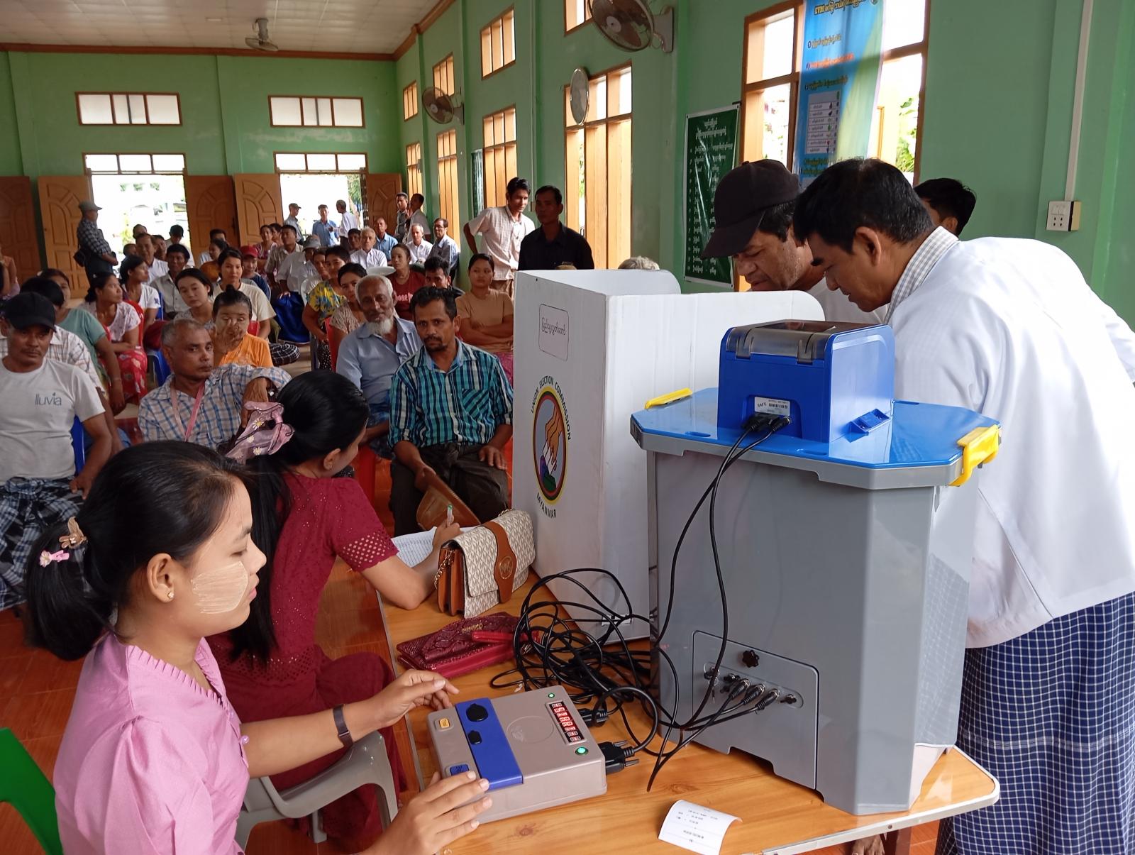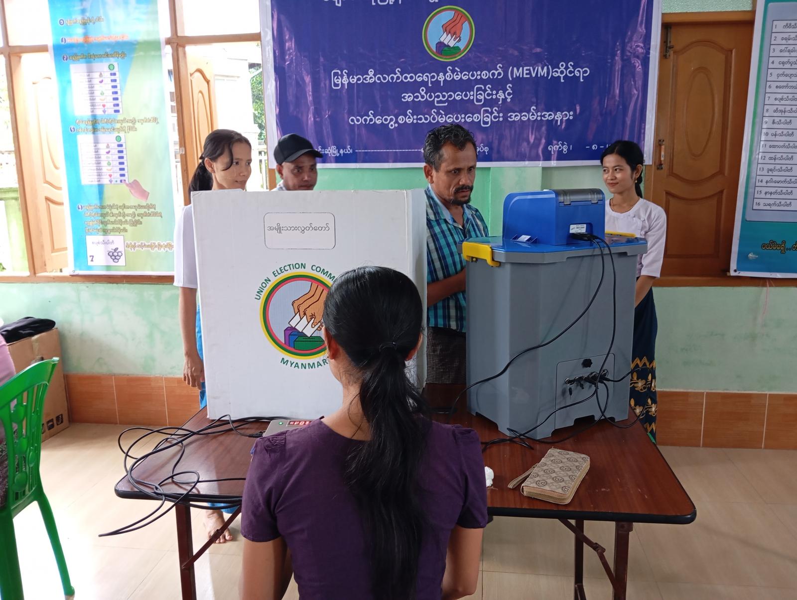 မွန်ပြည်နယ်၊ ချောင်းဆုံမြို့နယ်ရှိ မဲဆန္ဒရှင်ပြည်သူများ ပါတီစုံဒီမိုကရေစီအထွေထွေရွေးကောက်ပွဲတွင် မဲလက်မှတ်ဖြင့် မဲပေးခြင်းစနစ်အစား အီလက်ထရောနစ်မဲပေးစက်ဖြင့် မဲပေးနိုင်ရေးအတွက် မြို့နယ်စီမံခန့်ခွဲရေးနှင့် အုပ်ချုပ်ရေးကော်မတီ၏ ကြီးကြပ်မှုဖြင့် မြို့နယ်ရွေးကောက်ပွဲကော်မရှင်အဖွဲ့ခွဲမှ မြန်မာအီလက်ထရောနစ်မဲပေးစက် (MEVM) ဆိုင်ရာ အသိပညာပေးခြင်းနှင့် လက်တွေ့စမ်းသပ်မဲပေးစေခြင်းကို ယမန်နေ့နံနက်(၉)နာရီက ကညှော်ကျေးရွာခန်းမ၌ ပြုလုပ်ခဲ့သည်။