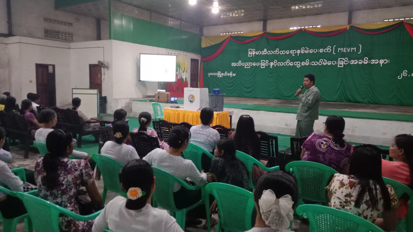 ထိုသို့ အသိပညာပေးဆောင်ရွက်ရာတွင် မြို့နယ်စီမံခန့်ခွဲရေးနှင့် အုပ်ချုပ်ရေးကော်မတီဥက္ကဋ္ဌ ဦးဇော်မင်းက မဲဆန္ဒရှင်ပြည်သူများအနေဖြင့် မြန်မာအီလက်ထရောနစ် (MEVM) မဲပေးစက်အသုံးပြု၍ မဲပေးပုံအဆင့်ဆင့်ကို ပြည်သူများ ကျယ်ကျယ်ပြန့်ပြန့်သိရှိနိုင်ရေး ရည်ရွယ်၍ အသိပညာပေး ဆောင်ရွက်ပေးရခြင်း ဖြစ်ကြောင်း၊ မြို့နယ်ရွေးကောက်ပွဲကော်မရှင် အဖွဲ့ခွဲရုံး၊ ရွေးကောက်ပွဲအရာရှိ ဦးကျော်လွင်က မြန်မာအီလက်ထရောနစ် (MEVM) စနစ်ဖြင့် အသုံးပြု၍ မဲပေးရခြင်း၏ ရည်ရွယ်ချက်၊ မဲပေးစက်ဖွဲ့စည်းတည်ဆောက်ပုံနှင့် ပါဝင်သည့် ဆက်စပ်ပစ္စည်းများ၊ မဲပေးစက်များကို ကိုင်တွယ်အသုံးပြုခြင်း၊ မဲရလဒ်များ၊ မဲပေးစက်အသုံးပြုခြင်း၏ အကျိုးကျေးဇူးများကို ရှင်းလင်းပြောကြားခဲ့သည်။