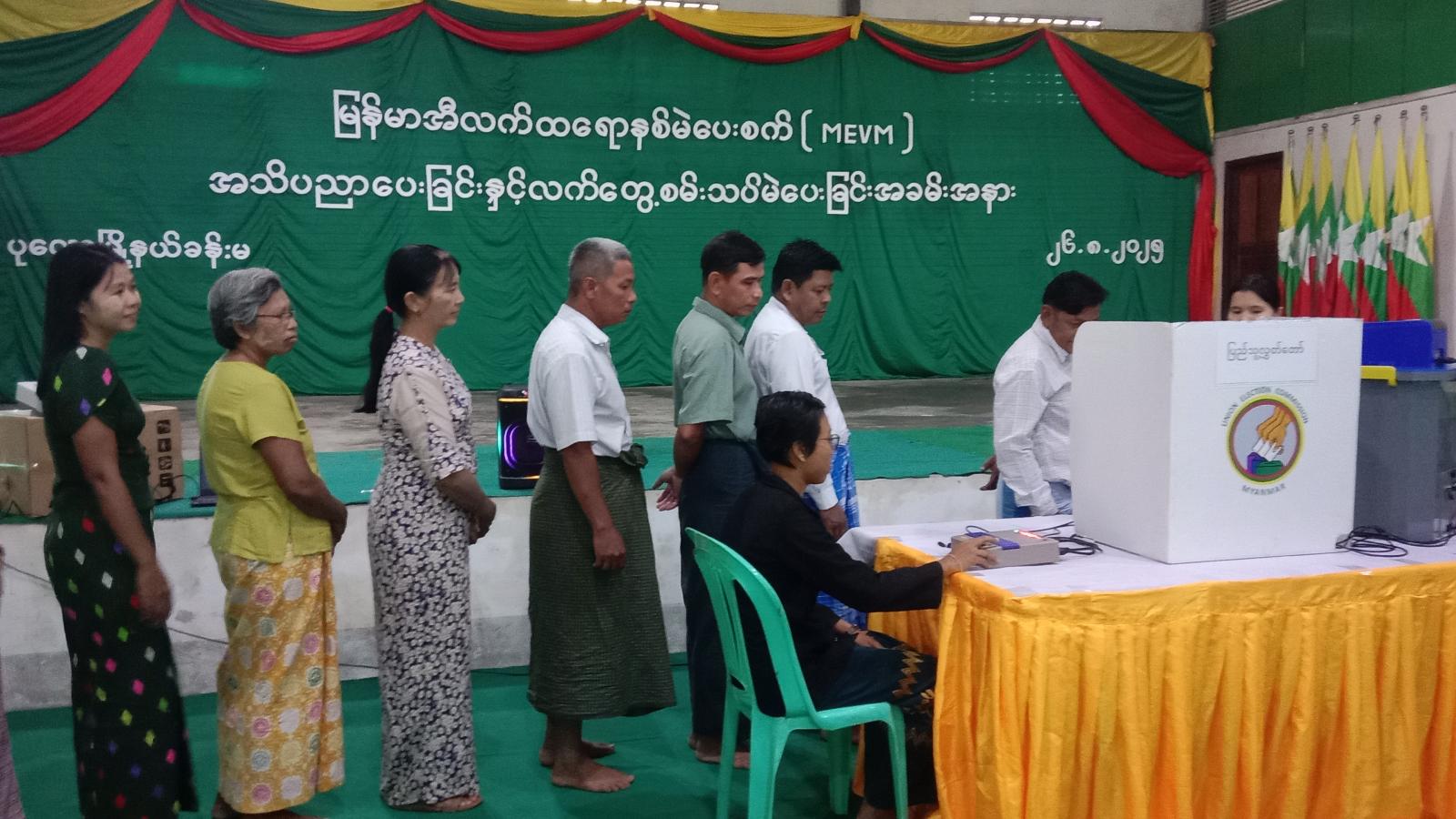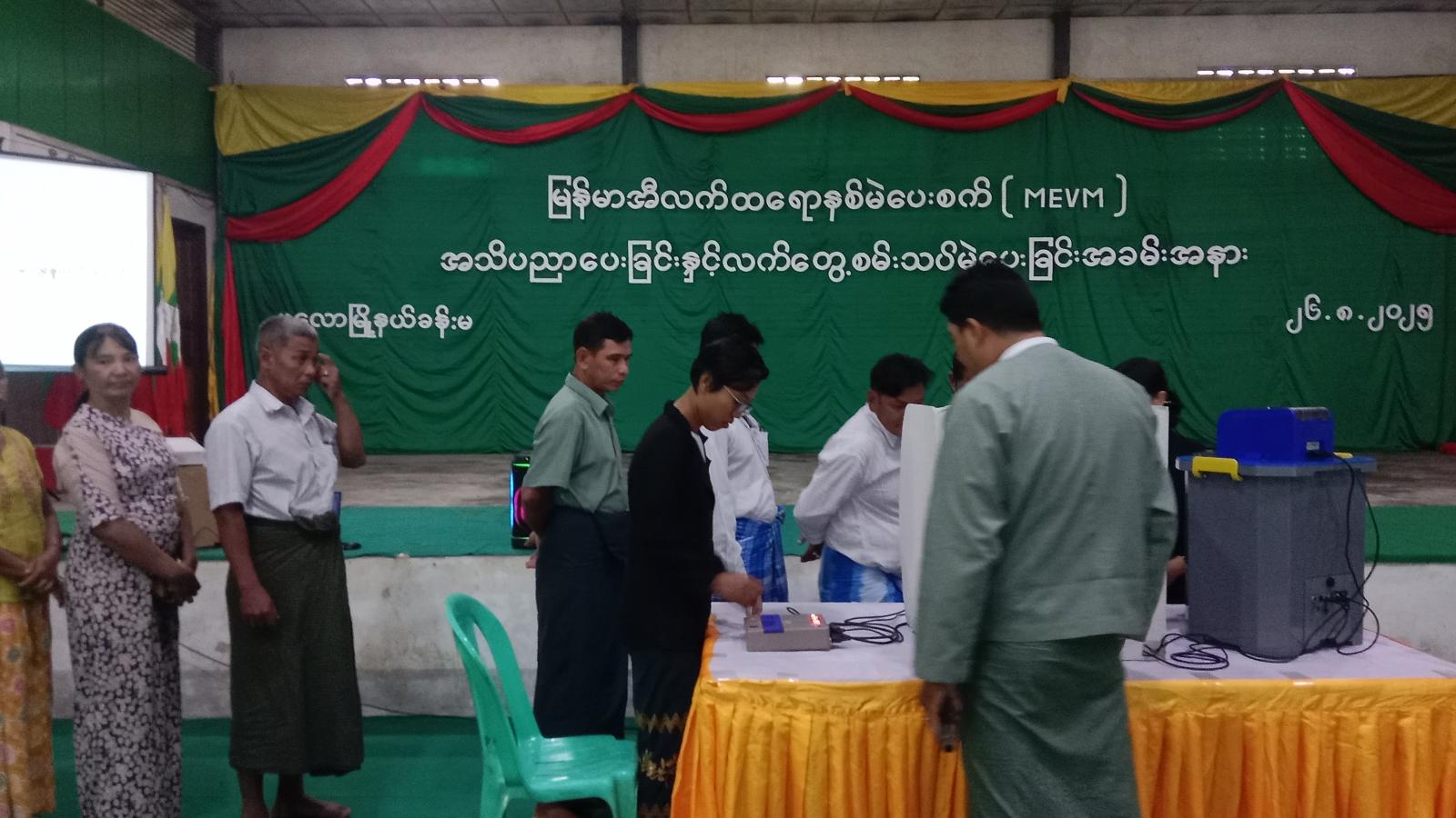 ဆက်လက်၍ တက်ရောက်လာကြသည့် မြို့ပေါ် အမှတ် (၄) ၊ အမှတ် (၅) ရပ်ကွက်နေ မဲဆန္ဒရှင် ပြည်သူများက မြန်မာအီလက်ထရောနစ် (MEVM) မဲပေးစက်အသုံးပြု၍ မဲပေးခြင်း၊ မဲရလဒ်များ ထုတ်ယူကြည့်ရှုစစ်ဆေးခြင်းစသည့် မဲပေးပုံအဆင့်ဆင့်ကို ပြည်သူများ ကျယ်ကျယ်ပြန့်ပြန့် သိရှိနိုင်စေရန် လက်တွေ့သရုပ်ပြဆောင်ရွက်ခဲ့ကြောင်း သိရသည်။