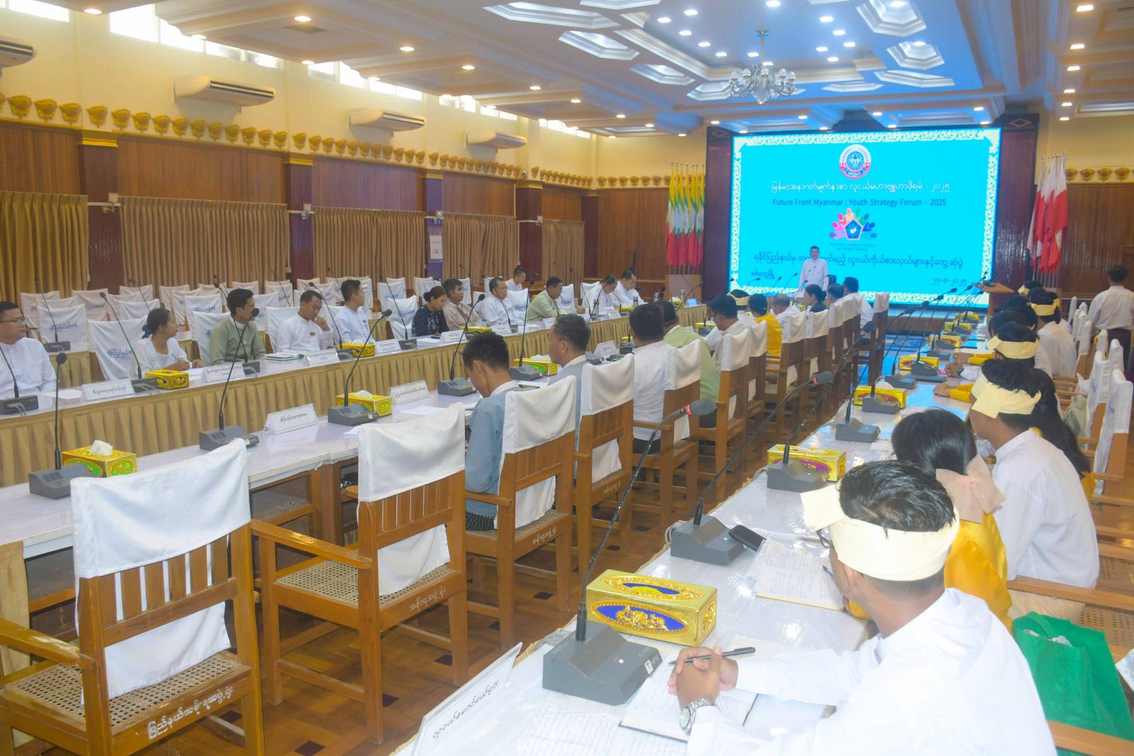 ဦးစွာ ပြည်နယ်ဝန်ကြီးချုပ် ဦးထိန်လင်းက တိုင်းပြည်၏အနာဂတ်လူငယ်များသည် မိမိနိုင်ငံ၊ မိမိလူမျိုး၊ မိမိဒေသကို ချစ်မြတ်နိုးသည့်စိတ်များ၊ အနာဂတ်မိမိတို့၏နိုင်ငံတော်ကြီး ဖွံ့ဖြိုးတိုးတက်ရန်အတွက် သာမက နိုင်ငံတကာအသိအမြင်များ၊ အတွေးအခေါ်များ၊ နိုင်ငံတကာ ဆက်ဆံရေးနယ်ပယ်တွင် ရင့်ကျက်တည်ငြိမ်သော အတွေးအခေါ်ရှိသည့် အနာဂတ်ခေါင်းဆောင်ကောင်းများ ဖြစ်လာရန် ရည်ရွယ်ချက် ကြီးကြီးဖြင့် နိုင်ငံတော်အစိုးရက မြန်မာ့အနာဂတ်မျက်နှာစာလူငယ်မဟာဗျူဟာဖိုရမ်-၂၀၂၅ကို ကျင်းပရခြင်းဖြစ်ကြောင်း၊ ယခုအခြေအနေတွင် နိုင်ငံ၏အနာဂတ်ကို ပခုံးပြောင်းတာဝန်ယူကြမည့် လူငယ်များ၏ကဏ္ဍကို မြှင့်တင်ပေးရန် အလွန်အရေးပါသည့်ကဏ္ဍတစ်ရပ်ဖြစ်သဖြင့် ယခုကဲ့သို့ ရည်ရွယ်ချက်ရှိရှိဖြင့် ဖိုရမ်များကို ကျင်းပပေးခြင်းဖြစ်ကြောင်း၊ ဖိုရမ်ကိုသွားရောက်ဆွေးနွေးကြမည့် လူငယ်ကိုယ်စားလှယ်များအနေဖြင့် ဆွေးနွေးပွဲတွင် လေ့လာခဲ့ရသည်များကို မိမိဒေသ၊ မိမိပြည်နယ်တွင် ပြန်လည်အသုံးချနိုင်အောင် စနစ်တကျ လေ့လာမှတ်သာားစေလိုကြောင်း၊ ပြန်ရောက် လာသည့်အခါ ဘဝတူလူငယ်၊ လူရွယ်များကို ဗဟုသုတများ ပြန်လည်မျှဝေပေးရန် အစီအစဉ်များ ဆောင်ရွက်ပေးသွားမည်ဖြစ်ကြောင်းနှင့် မိမိပြည်နယ်၊ မိမိဒေသဂုဏ်ဆောင်ရမည့်သူများဖြစ်သည့်အတွက် အပြော အဆို၊ အနေအထိုင်၊ အပြုအမူများကို ဂုဏ်သိက္ခာ ရှိရှိပြောဆိုနေထိုင် ဆွေးနွေးသွားကြရန်ပြောကြားသည်။