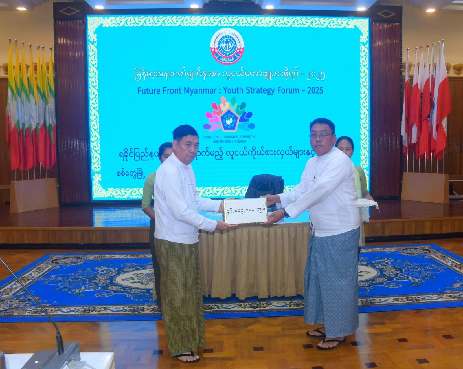 ထို့နောက် ပြည်နယ်ဝန်ကြီးချုပ်က မြန်မာ့အနာဂတ်မျက်နှာစာ လူငယ်မဟာဗျူဟာဖိုရမ်-၂၀၂၅ သို့ တက်ရောက် လူငယ်မောင်မယ်များနှင့် ဖိုရမ်အတွက် သင်ခန်းစာပို့ချပေးကြသူ ဆရာ၊ ဆရာမများအား ချီးမြှင့်ငွေများပေးအပ်သည်။