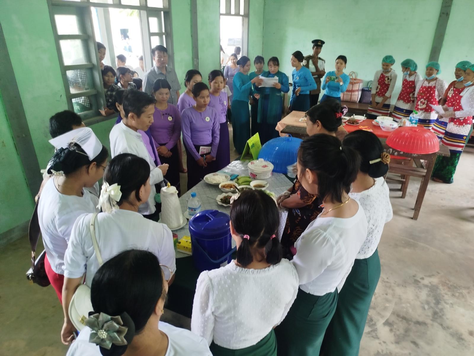 ရှေးဦးစွာ မြို့နယ်စီမံခန့်ခွဲရေးနှင့်အုပ်ချုပ်ရေးကော်မတီ၊ မြို့နယ်အထွေထွေအုပ်ချုပ်ရေးမှူး၊ မြို့နယ်ပညာရေးမှူး၊ မြို့နယ်ပြည်သူ့ကျန်းမာရေးဦးစီးဌာနမှူးနှင့် ကျန်းမာရေးဝန်ထမ်းများ၊ မြို့နယ်ကြက်ခြေနီအသင်းနှင့် မိခင်နှင့်ကလေးအသင်း၊ အမျိုးသမီးရေးရာအဖွဲ့တို့မှ တာဝန်ရှိသူ တို့က ချက်ပြုတ်ရေးပြိုင်ပွဲတွင် ထည့်သွင်းချက်ပြုတ်မည့် အသုံးပြုပစ္စည်းများအား ကြည့်ရှုစစ်ဆေးသည်။