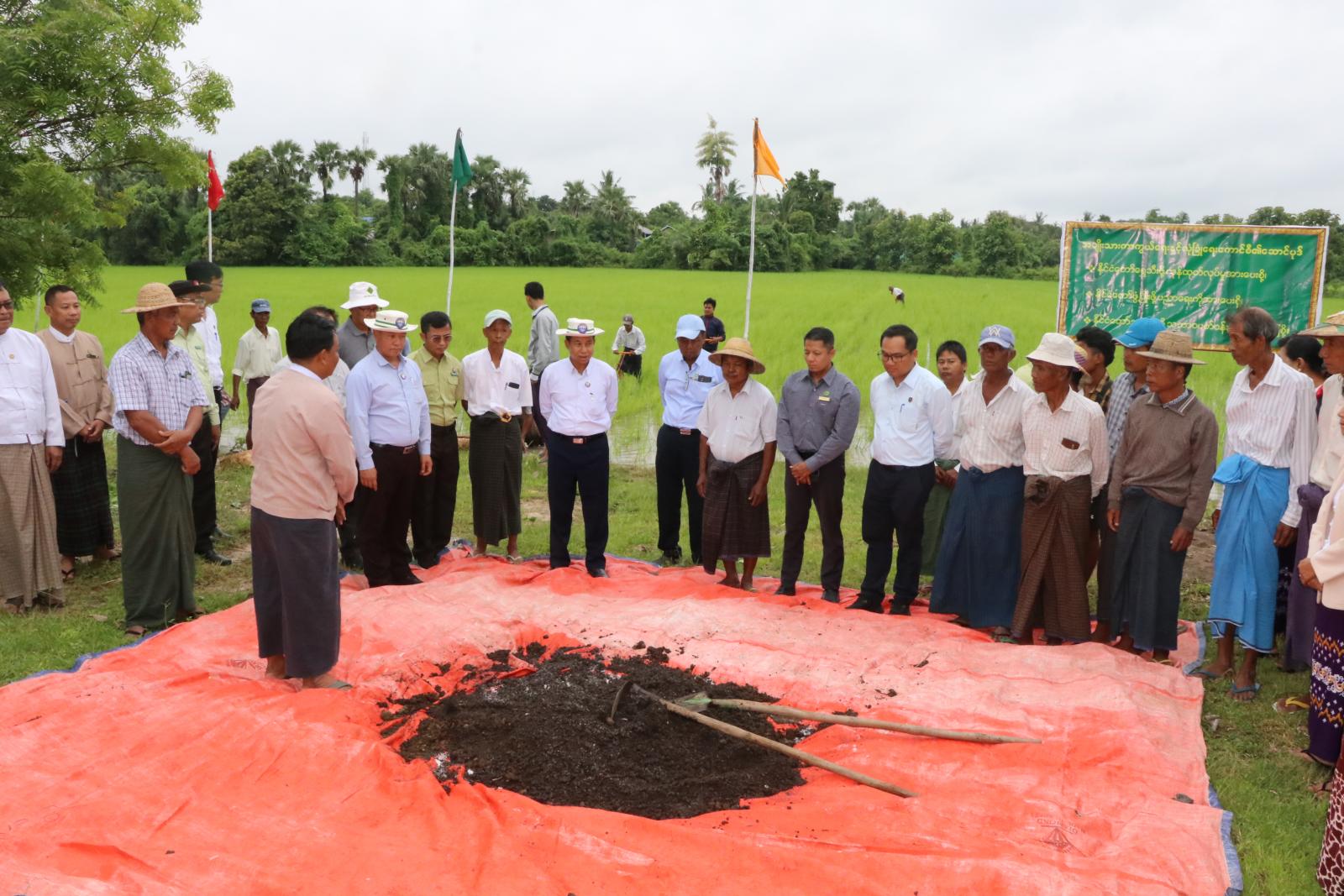 ယင်းနောက် တိုင်းဒေသကြီးဝန်ကြီးချုပ်နှင့်တာဝန်ရှိသူများသည် ကန့်ဘလူမြို့နယ်၊ နက်ပေးကျေးရွာရှိ တောင်သူဦးမိုးပေါက် စိုက်ပျိုးထားရှိသည့်အောင်နိုင်တိုးစပါးမျိုး ၃.၀၆ ဧကစိုက်ခင်းအတွင်း သမန်းနိုးခြင်းနှင့်သဘာဝမြေဩဇာရောနှောကြဲပတ်ခြင်းကွင်း သရုပ်ပြသပွဲသို့ တက်ရောက်ကြသည်။